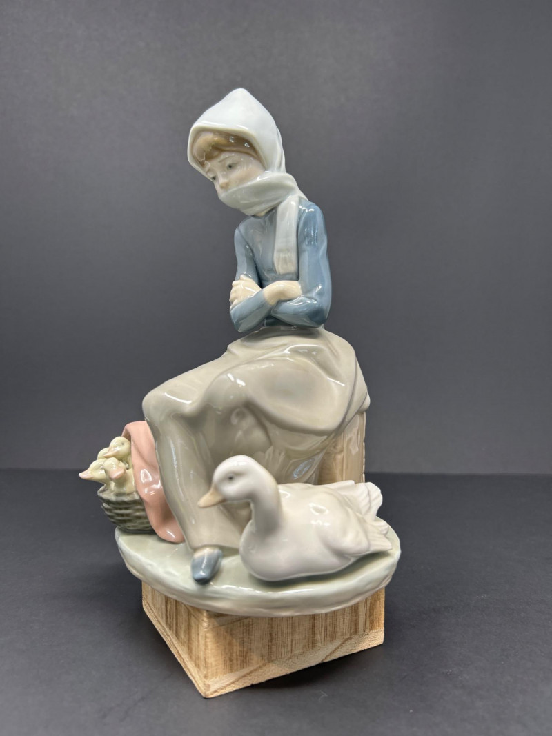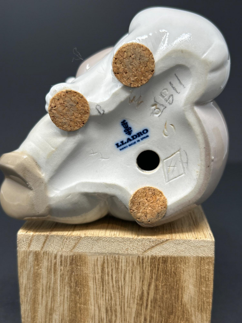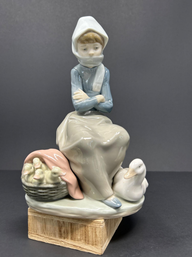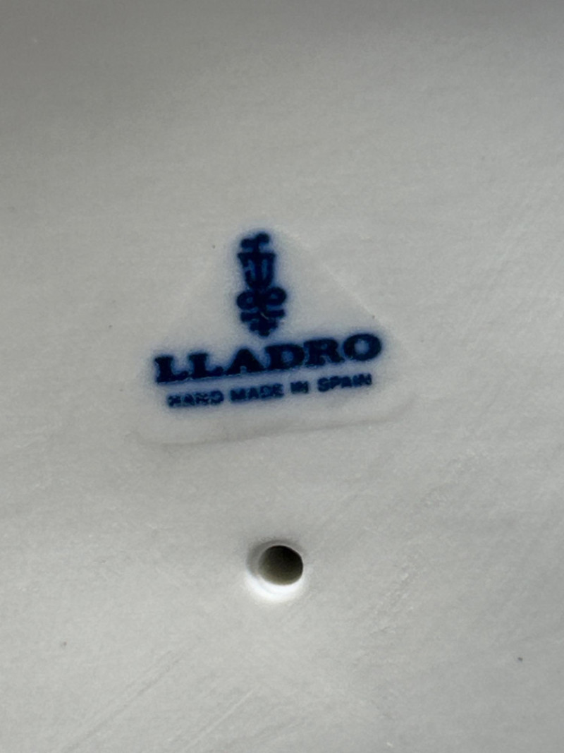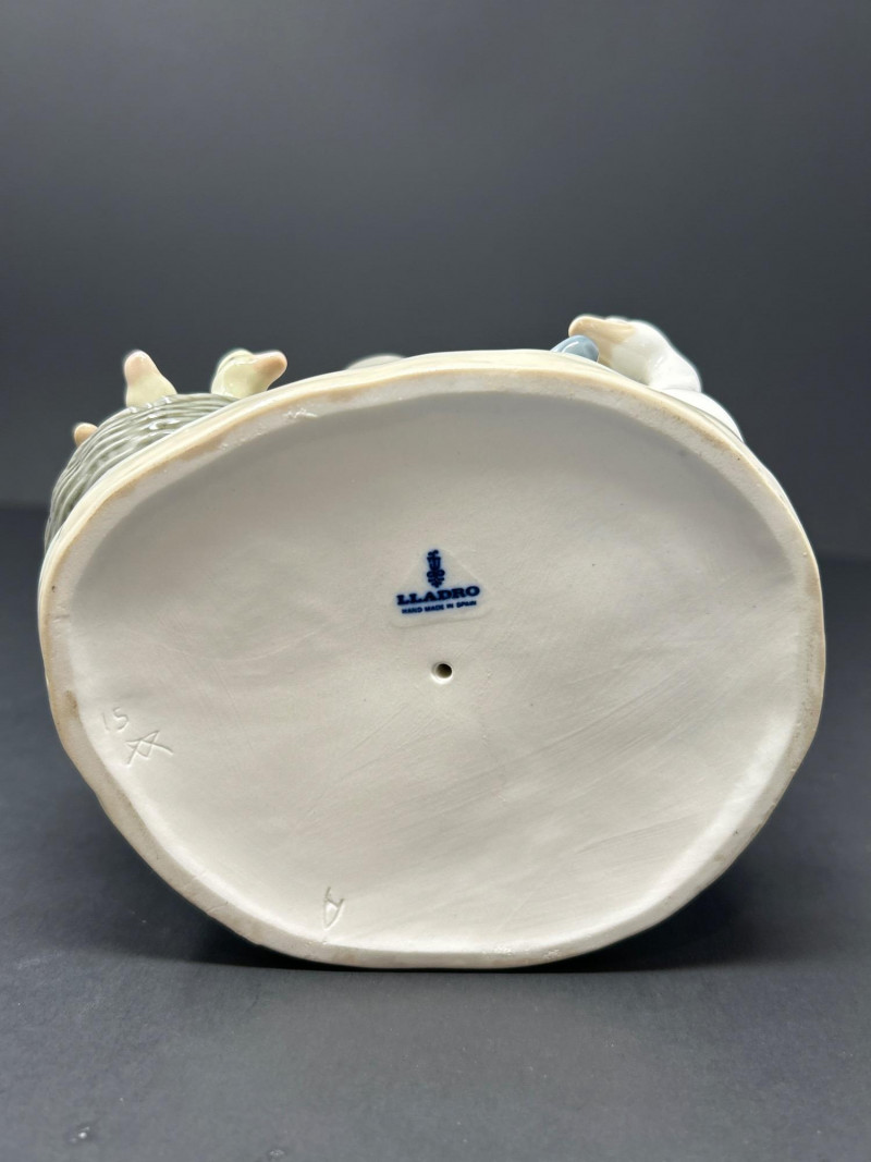 LLADRÓ “Duck Seller” Dimensions: Approx. 7" tall Color: Soft pastel palette – ivory, beige, and pale blue Origin: Handcrafted in Spain; marked “LLADRÓ” on underside Design: Seated woman in bonnet and apron, arms gently crossed. Accompanied by a white duck and a woven basket filled with ducklings. Glossy porcelain finish with delicate sculptural detail. Style Notes: A retired LLADRÓ classic evoking pastoral charm and maternal serenity. Highly collectible and ideal for rustic or vintage-themed displays. LLADRÓ “Eskimo Playing” #1195 Dimensions: Approx. 4¼" tall x 3¾" wide Color: Soft white, blush pink, and beige tones Origin: Issued 1972, retired 2007; marked “LLADRÓ” on underside Design: Child in traditional winter attire, seated and playfully interacting with a polar bear cub. Rounded forms and gentle expressions highlight LLADRÓ’s signature warmth and craftsmanship. Style Notes: A whimsical, heartwarming piece from LLADRÓ’s childhood series. Comes with original box. Perfect for collectors of retired European porcelain.