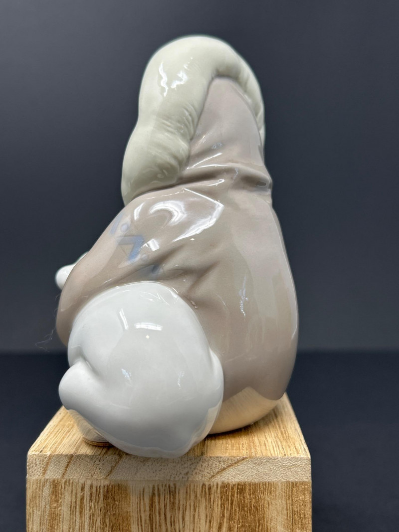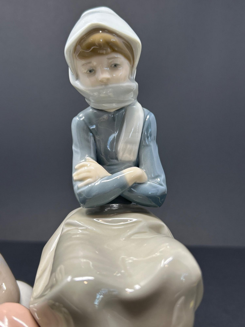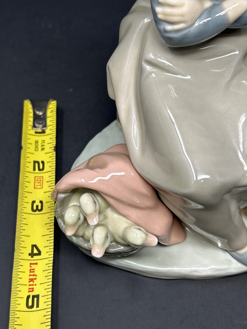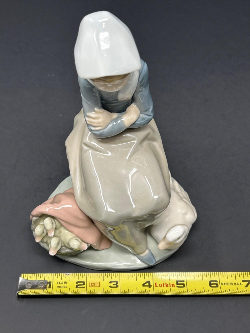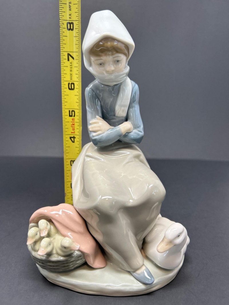 LLADRÓ “Duck Seller” Dimensions: Approx. 7" tall Color: Soft pastel palette – ivory, beige, and pale blue Origin: Handcrafted in Spain; marked “LLADRÓ” on underside Design: Seated woman in bonnet and apron, arms gently crossed. Accompanied by a white duck and a woven basket filled with ducklings. Glossy porcelain finish with delicate sculptural detail. Style Notes: A retired LLADRÓ classic evoking pastoral charm and maternal serenity. Highly collectible and ideal for rustic or vintage-themed displays. LLADRÓ “Eskimo Playing” #1195 Dimensions: Approx. 4¼" tall x 3¾" wide Color: Soft white, blush pink, and beige tones Origin: Issued 1972, retired 2007; marked “LLADRÓ” on underside Design: Child in traditional winter attire, seated and playfully interacting with a polar bear cub. Rounded forms and gentle expressions highlight LLADRÓ’s signature warmth and craftsmanship. Style Notes: A whimsical, heartwarming piece from LLADRÓ’s childhood series. Comes with original box. Perfect for collectors of retired European porcelain.