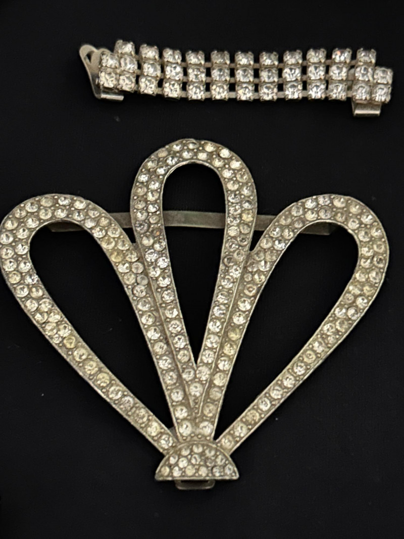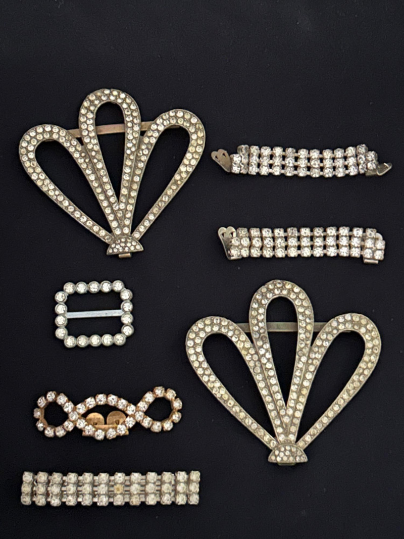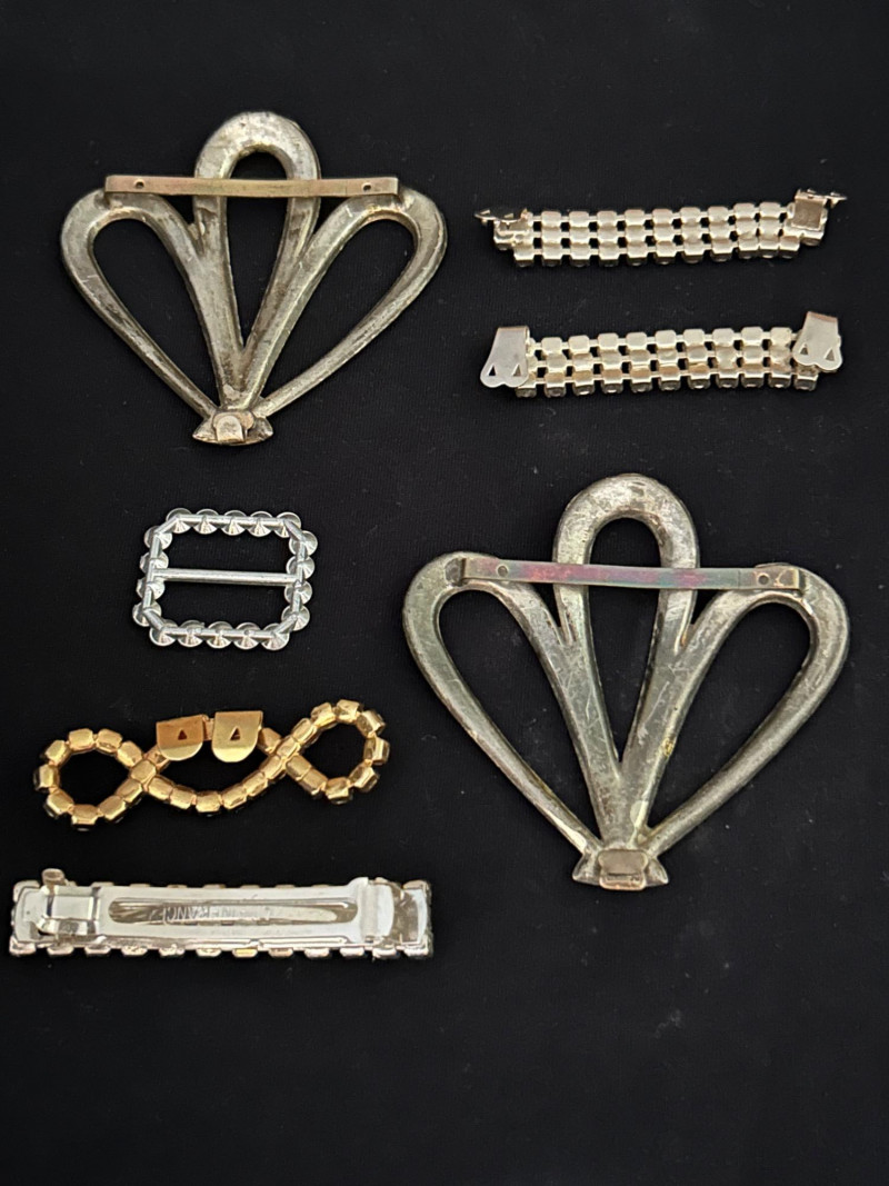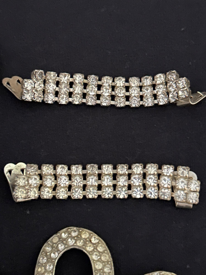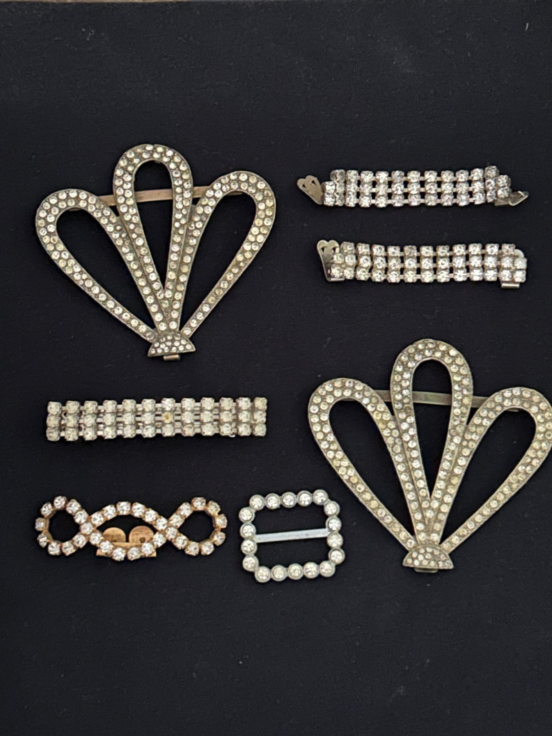 A dazzling ensemble of seven vintage rhinestone accessories dating from the 1930s to 1950s, featuring Deco-inspired geometry and mid-century glamour. Includes a pair of three-loop fan-shaped buckles, three bar-style dress clips, a square buckle, and a curved rhinestone hair barrette marked. Each piece is prong-set with clear faceted glass rhinestones in silver- or gold-tone metal. (2) Large fan-shaped rhinestone buckles – approx. 2 ¾ in. H × 2 ½ in. W each (3) Rhinestone bar-style dress clips – approx. 2 in. L each (1) Infinity-loop clip with gold-tone backing – approx. 2 ¼ in. L (1) Curved rhinestone hair barrette – marked – approx. 2 ½ in. L These versatile adornments once graced belts, shoes, hairstyles, and gowns—now prized by collectors and vintage fashion lovers for their craftsmanship and sparkle. The marked hair barrette adds a touch of mid-century utility design to this elegant mix.Set Includes:
