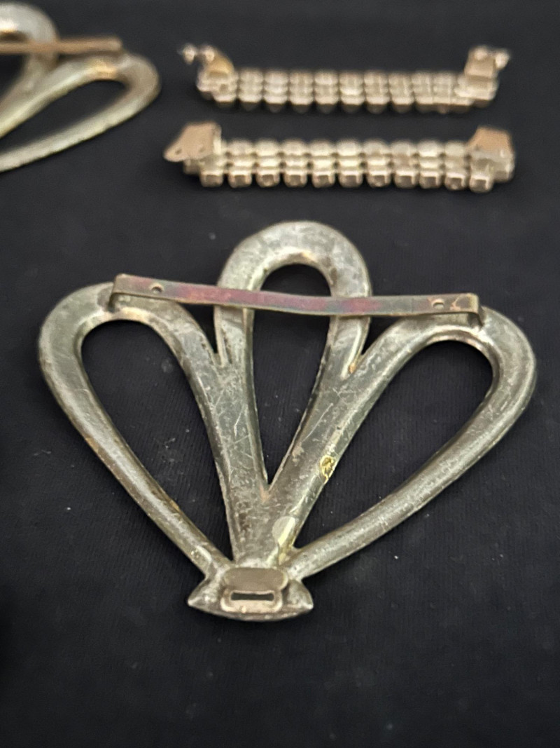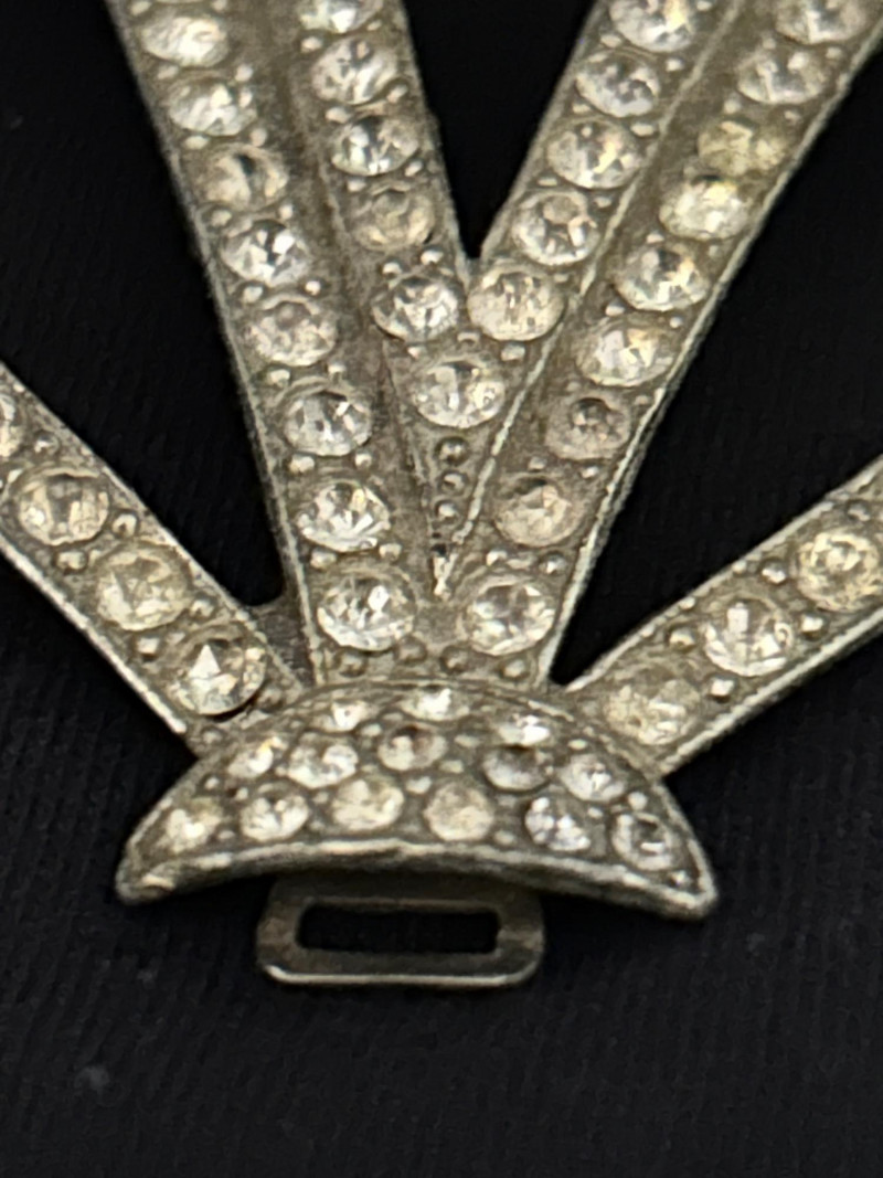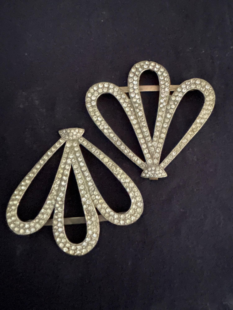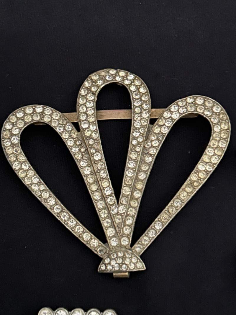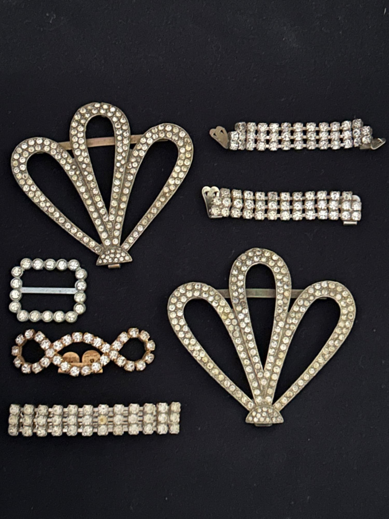 A dazzling ensemble of seven vintage rhinestone accessories dating from the 1930s to 1950s, featuring Deco-inspired geometry and mid-century glamour. Includes a pair of three-loop fan-shaped buckles, three bar-style dress clips, a square buckle, and a curved rhinestone hair barrette marked. Each piece is prong-set with clear faceted glass rhinestones in silver- or gold-tone metal. (2) Large fan-shaped rhinestone buckles – approx. 2 ¾ in. H × 2 ½ in. W each (3) Rhinestone bar-style dress clips – approx. 2 in. L each (1) Infinity-loop clip with gold-tone backing – approx. 2 ¼ in. L (1) Curved rhinestone hair barrette – marked – approx. 2 ½ in. L These versatile adornments once graced belts, shoes, hairstyles, and gowns—now prized by collectors and vintage fashion lovers for their craftsmanship and sparkle. The marked hair barrette adds a touch of mid-century utility design to this elegant mix.Set Includes: