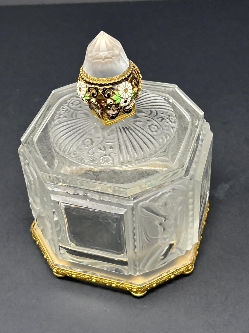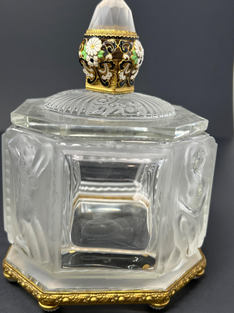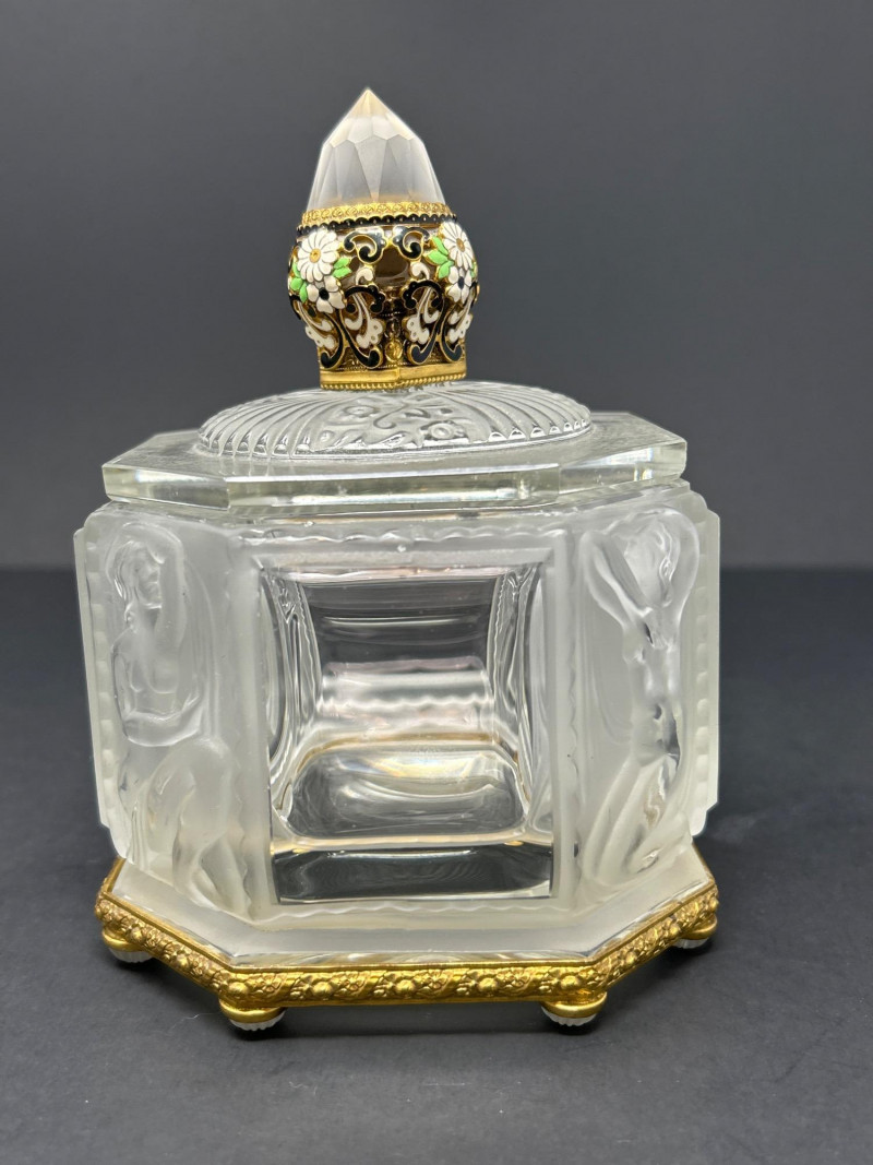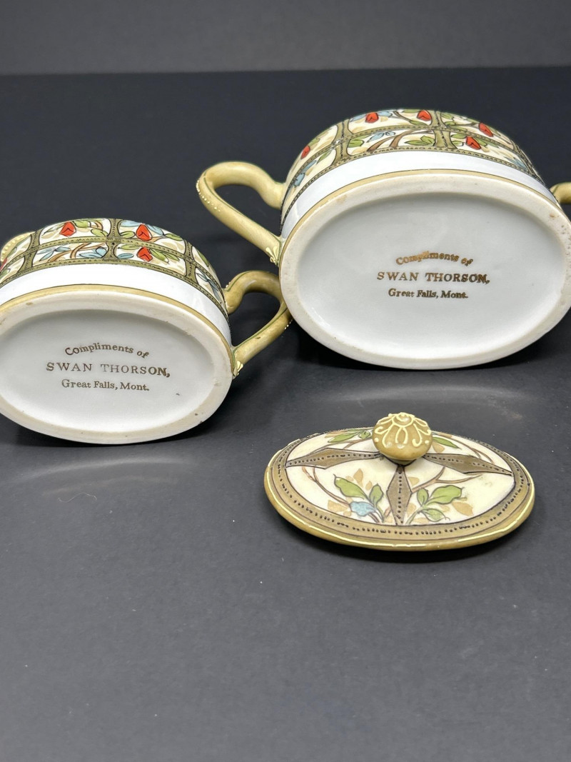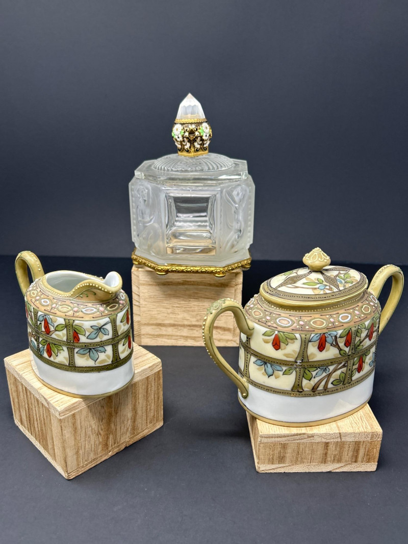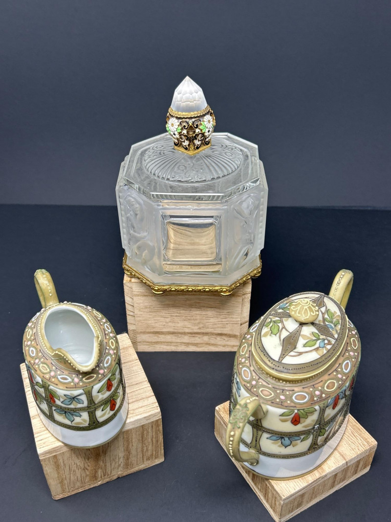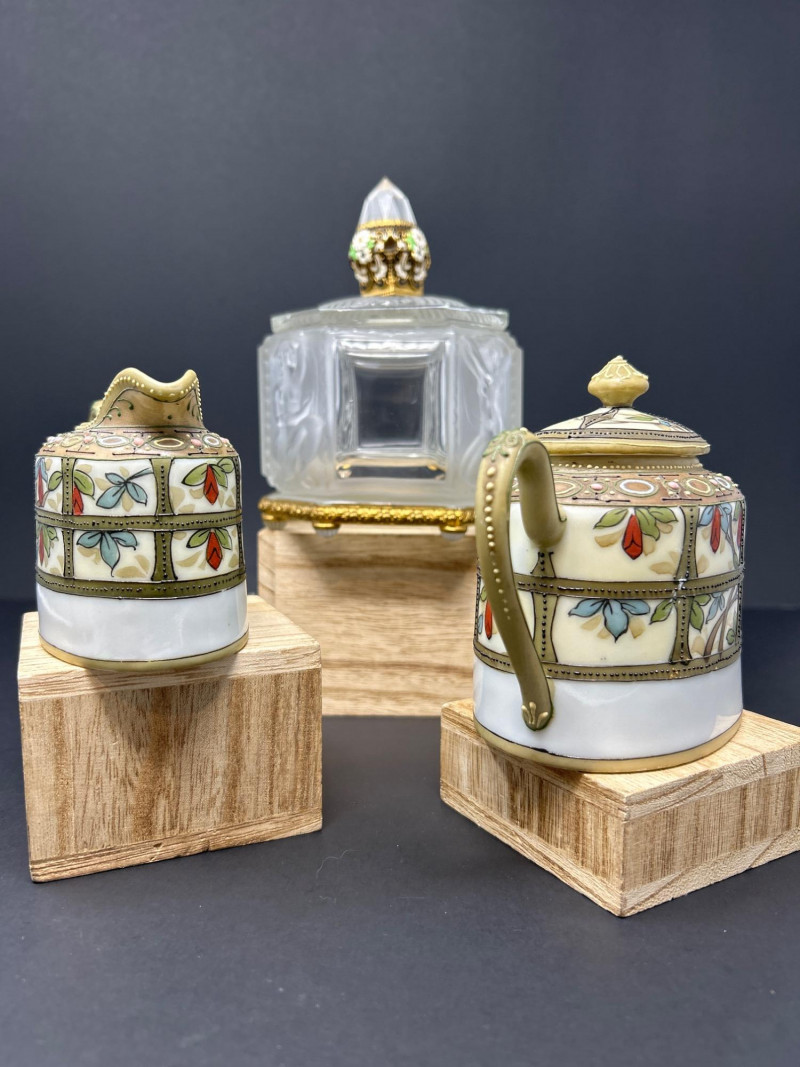 Dimensions: 6.75" tall × 4.75" wide Material: Pressed and frosted glass with gilt metal and enamel accents Design: Octagonal form with relief panels of nude female figures in flowing Art Nouveau style. Topped with a faceted finial lid featuring floral enamel detailing and a gilt filigree collar. Origin: Likely European, early 20th century (c. 1910–1925) Style Notes: A refined example of early 1900s Art Nouveau vanity glass. The figural reliefs and ornate gilt accents reflect the sensuous elegance of the period, reminiscent of French or Czechoslovakian Depose designs. Dimensions: Sugar – 5.5" wide × 4.5" tall Creamer – 4.5" wide × 3.5" tall Material: Hand-painted porcelain with raised moriage and gilt details Markings: "Compliments of Swan Thorson, Great Falls, Mont.” (on bases) Design: Stylized floral and leaf motifs in olive, ivory, blue, and red tones, framed by geometric borders and highlighted with beaded moriage texture and gilt trim. Origin: Japan, Taishō era export porcelain (c. 1910–1920) Style Notes: A fine example of Nippon craftsmanship, likely produced by Morimura Brothers for Western export. Advertising-marked Nippon ware is prized for its artistry and historical provenance.Art Nouveau Frosted Glass Vanity Jar