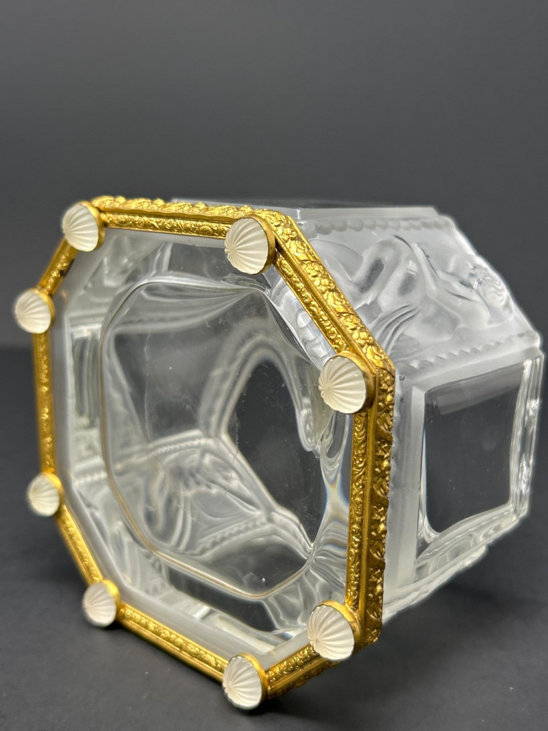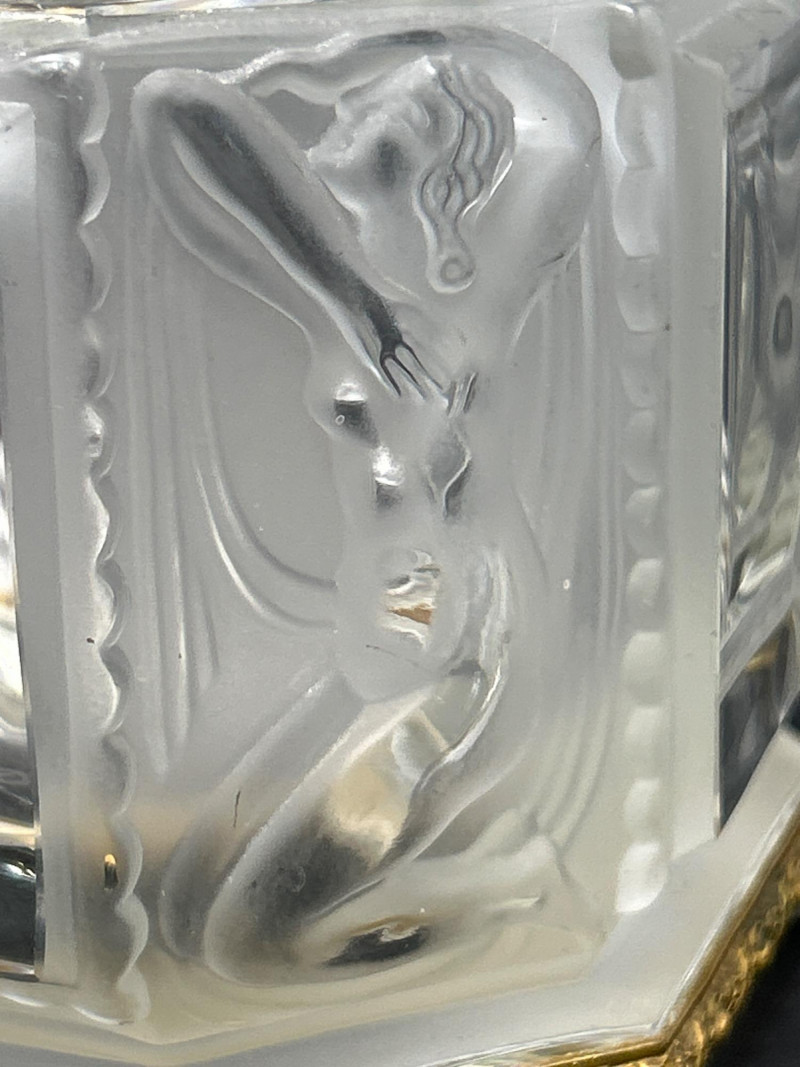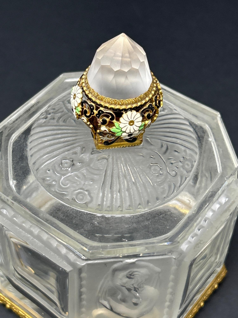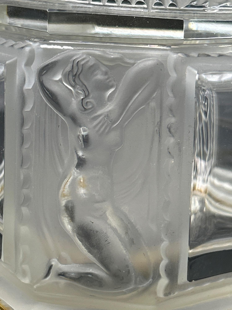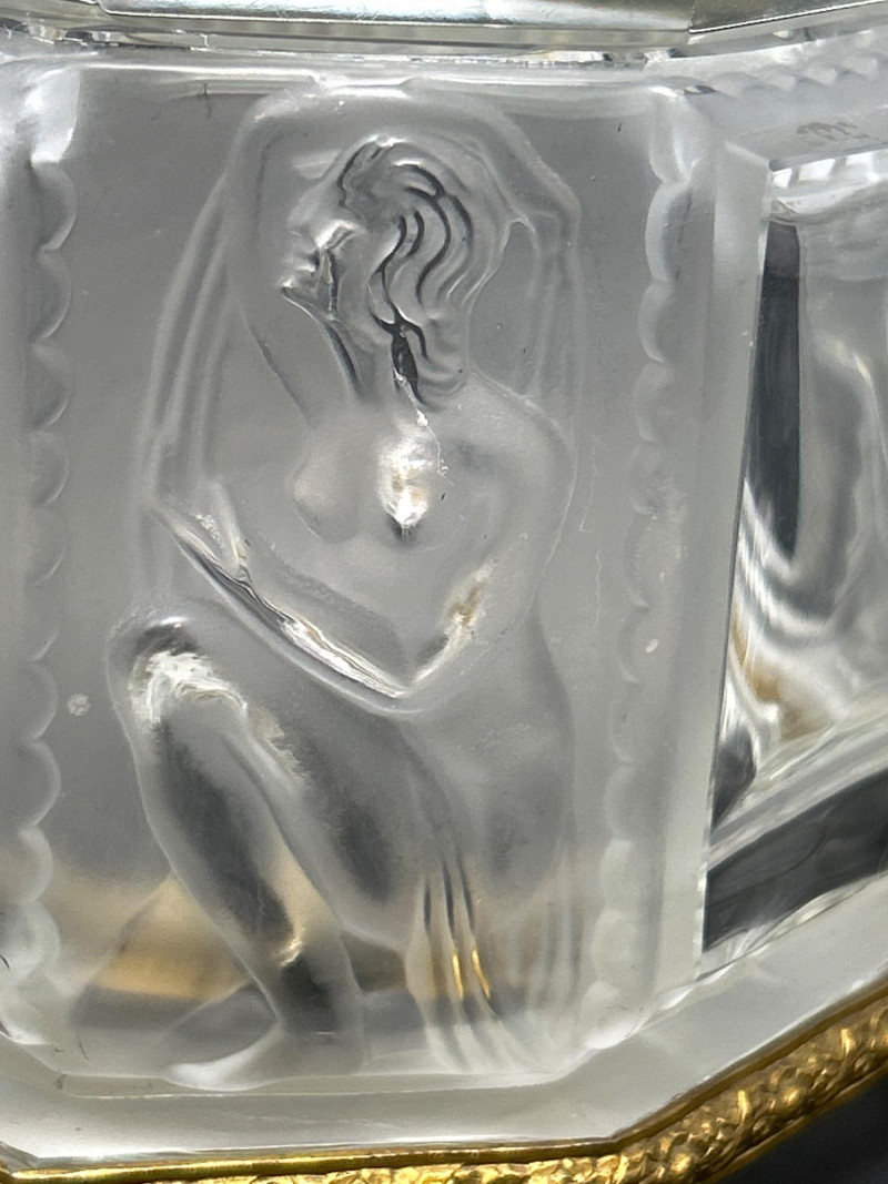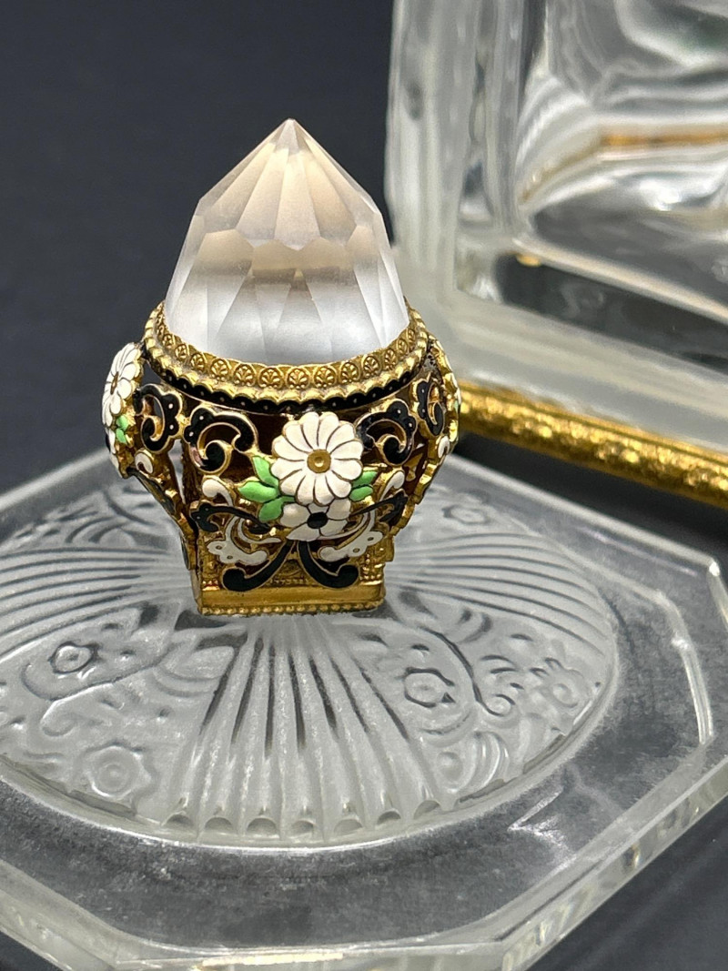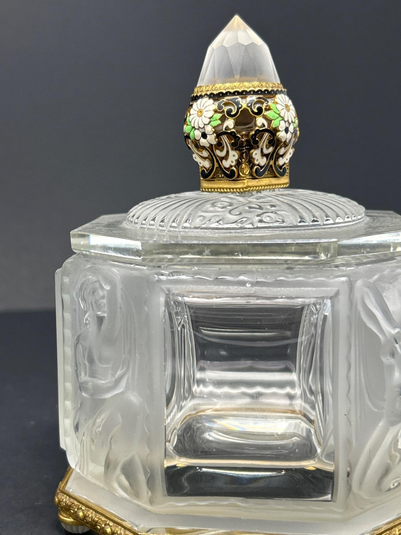 Dimensions: 6.75" tall × 4.75" wide Material: Pressed and frosted glass with gilt metal and enamel accents Design: Octagonal form with relief panels of nude female figures in flowing Art Nouveau style. Topped with a faceted finial lid featuring floral enamel detailing and a gilt filigree collar. Origin: Likely European, early 20th century (c. 1910–1925) Style Notes: A refined example of early 1900s Art Nouveau vanity glass. The figural reliefs and ornate gilt accents reflect the sensuous elegance of the period, reminiscent of French or Czechoslovakian Depose designs. Dimensions: Sugar – 5.5" wide × 4.5" tall Creamer – 4.5" wide × 3.5" tall Material: Hand-painted porcelain with raised moriage and gilt details Markings: "Compliments of Swan Thorson, Great Falls, Mont.” (on bases) Design: Stylized floral and leaf motifs in olive, ivory, blue, and red tones, framed by geometric borders and highlighted with beaded moriage texture and gilt trim. Origin: Japan, Taishō era export porcelain (c. 1910–1920) Style Notes: A fine example of Nippon craftsmanship, likely produced by Morimura Brothers for Western export. Advertising-marked Nippon ware is prized for its artistry and historical provenance.Art Nouveau Frosted Glass Vanity Jar