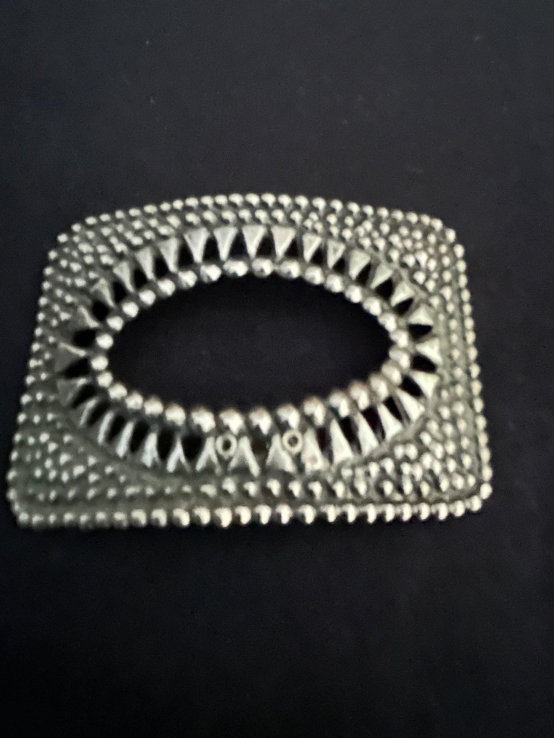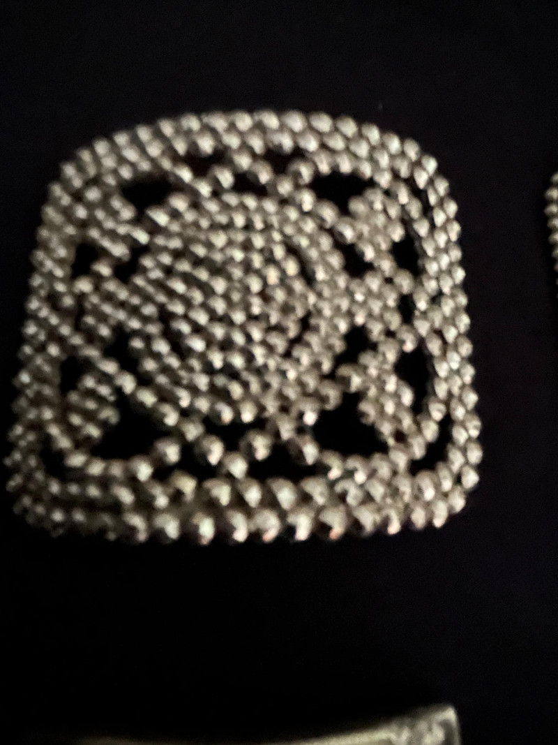 Silver-tone square buckle with rounded corners and raised steel beadwork in a symmetrical floral motif. Mesh-Edged Rectangular Clip