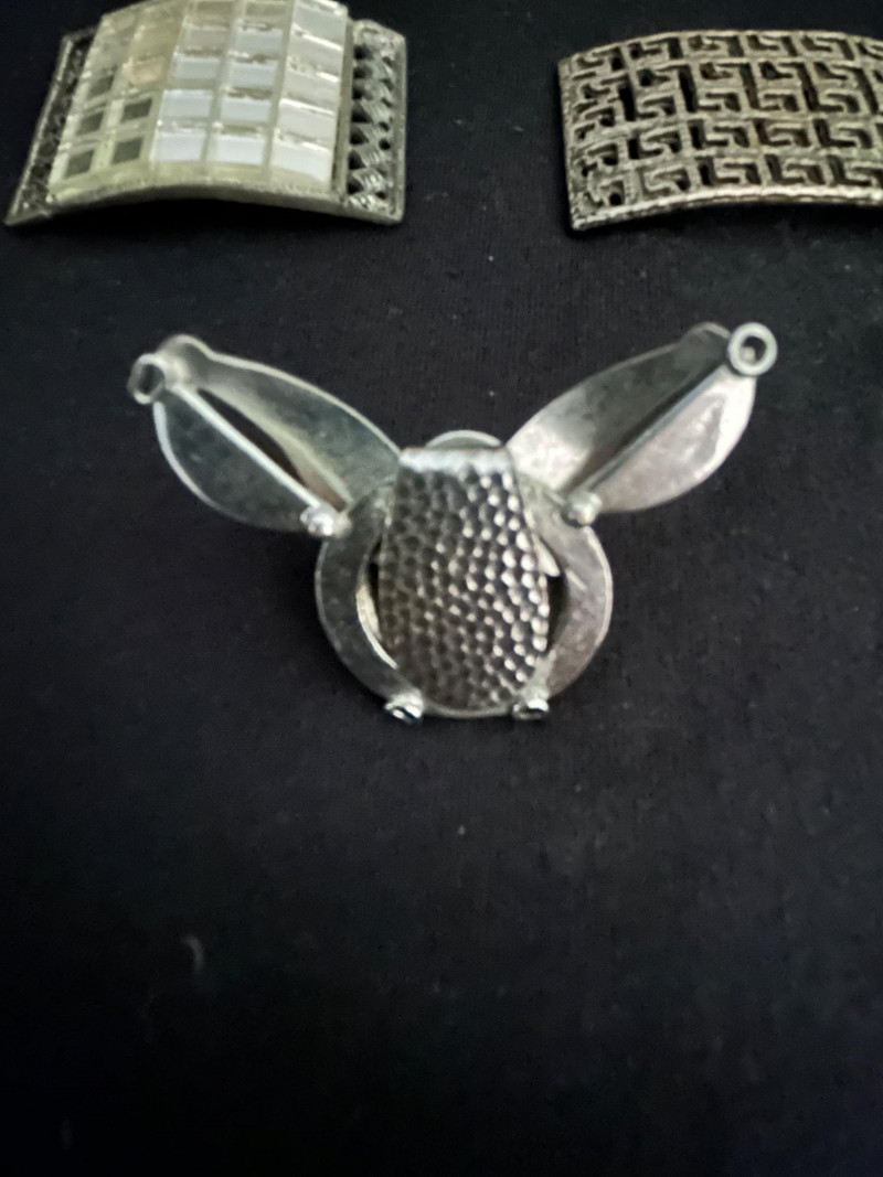 Sculptural form with three rounded extensions and a textured central panel. Abstract and mid-century modern in tone—possibly a shoe clip or garment fastener. Dimensions: Range from approx. 2" to 3.5" across.