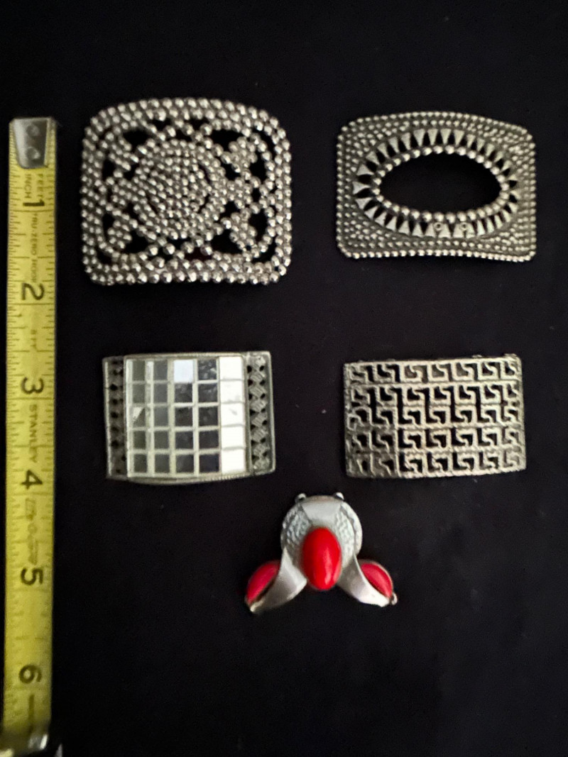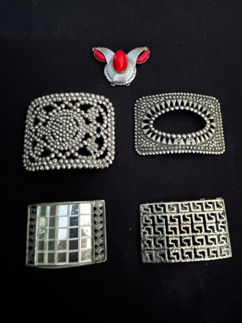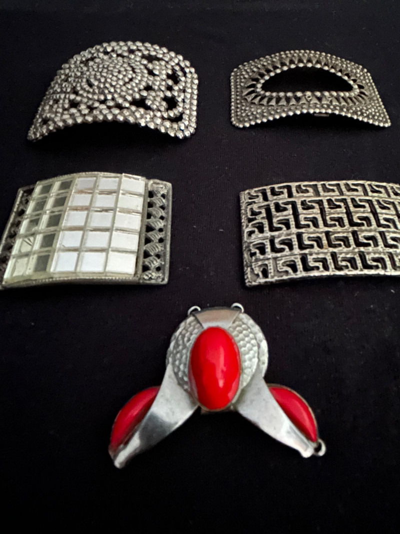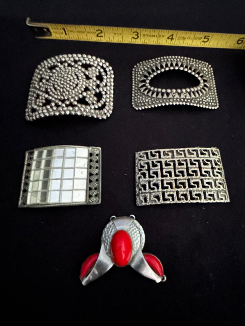 A versatile collection of five vintage shoe buckles and ornamental clips, each showcasing distinct mid-century metalwork styles. This mixed lot includes floral steel beading, geometric motifs, and sculptural forms—ideal for jewelry making, costume design, or repurposed fashion. Lot Highlights: Steel Beaded Buckle – Floral Mandala Design