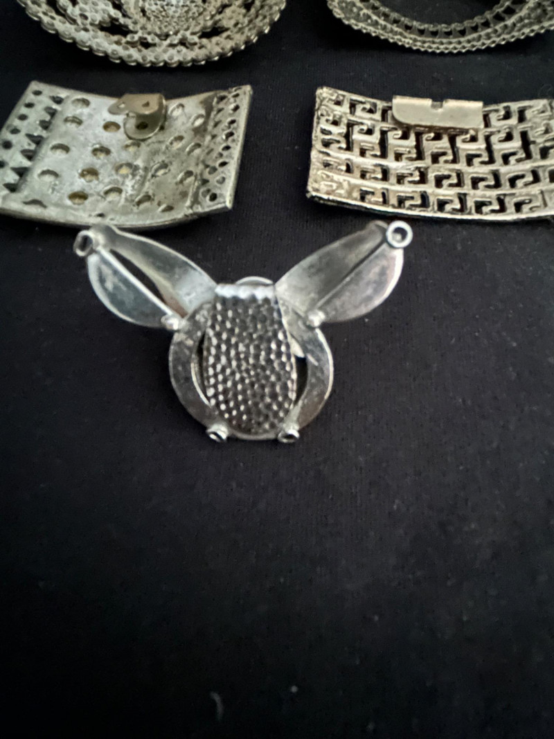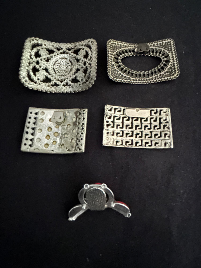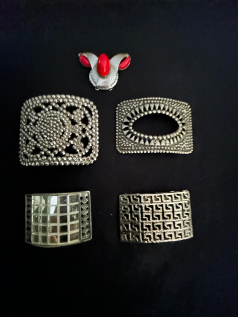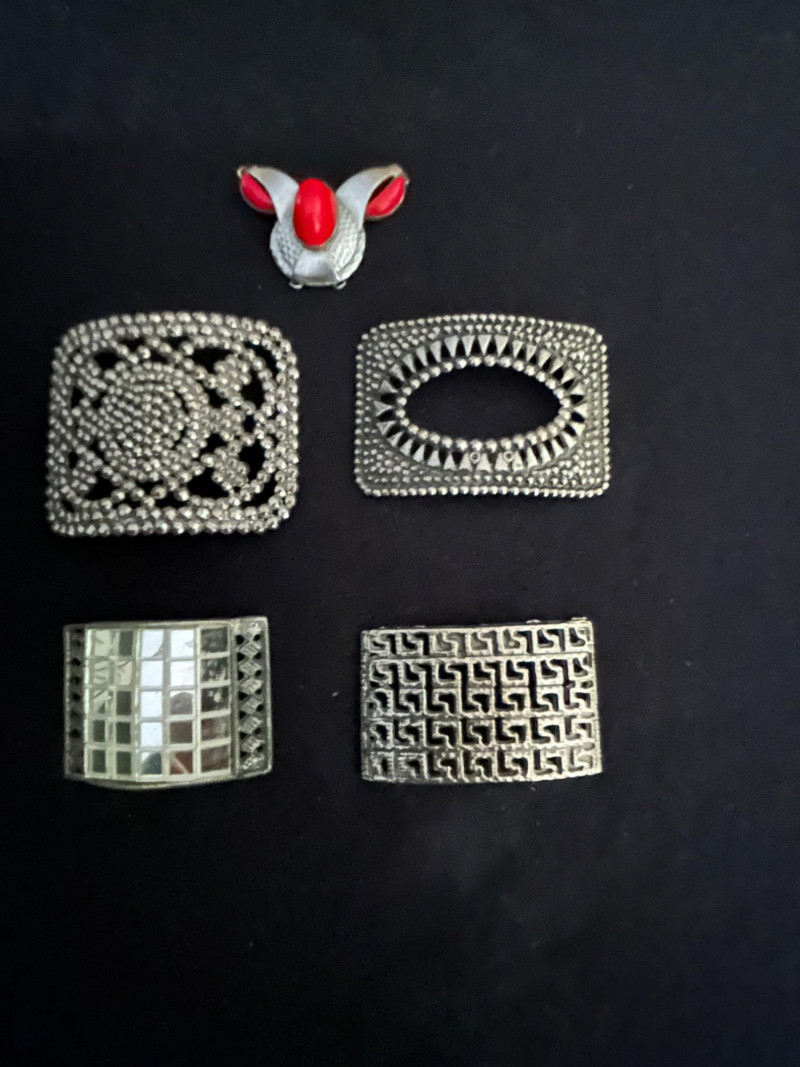 A versatile collection of five vintage shoe buckles and ornamental clips, each showcasing distinct mid-century metalwork styles. This mixed lot includes floral steel beading, geometric motifs, and sculptural forms—ideal for jewelry making, costume design, or repurposed fashion. Lot Highlights: Steel Beaded Buckle – Floral Mandala Design