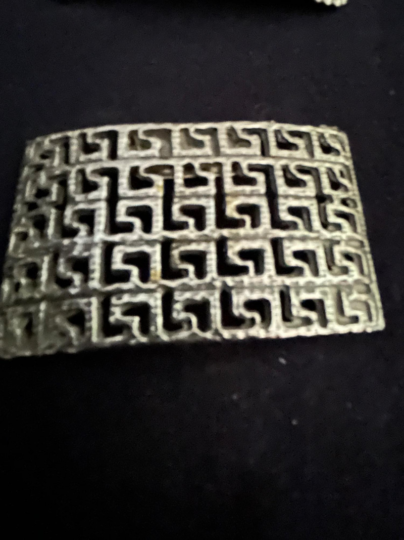 Rectangular form with circular cutouts and a top clasp. Minimalist and modernist, possibly used on shoes. Greek Key Clip – Art Deco Revival Classic interlocking meander pattern in silver-tone metal. A timeless motif associated with Art Deco revival and neoclassical fashion. Tri-Lobed Decorative Clasp
