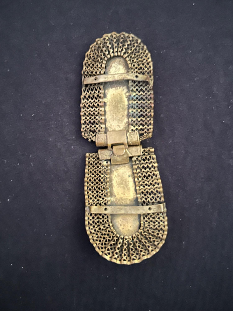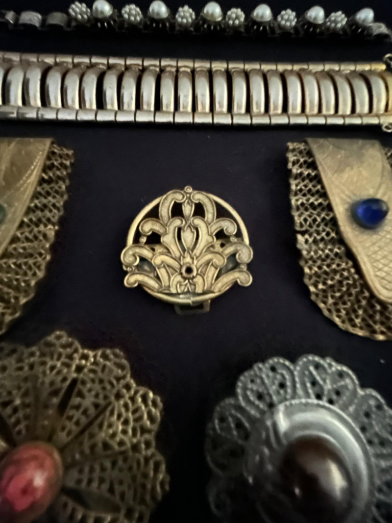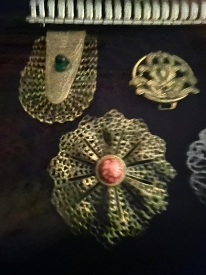 Design: Elaborate openwork filigree with a large, speckled glass cabochon surrounded by smaller accents.
