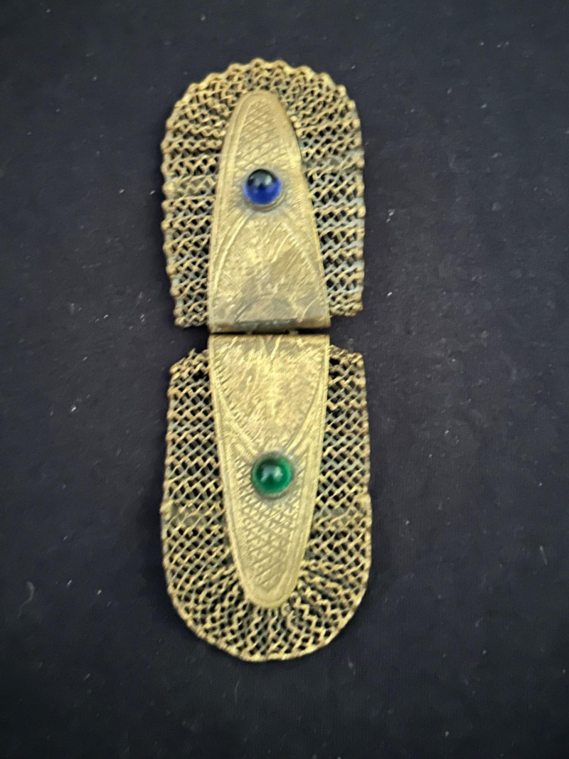 Style Notes: A sculptural piece similar to antique gilt brass buttons, collectible for its intricate floral detailing. Pair of Brass Filigree Dress Clips with Blue and Green Cabochons