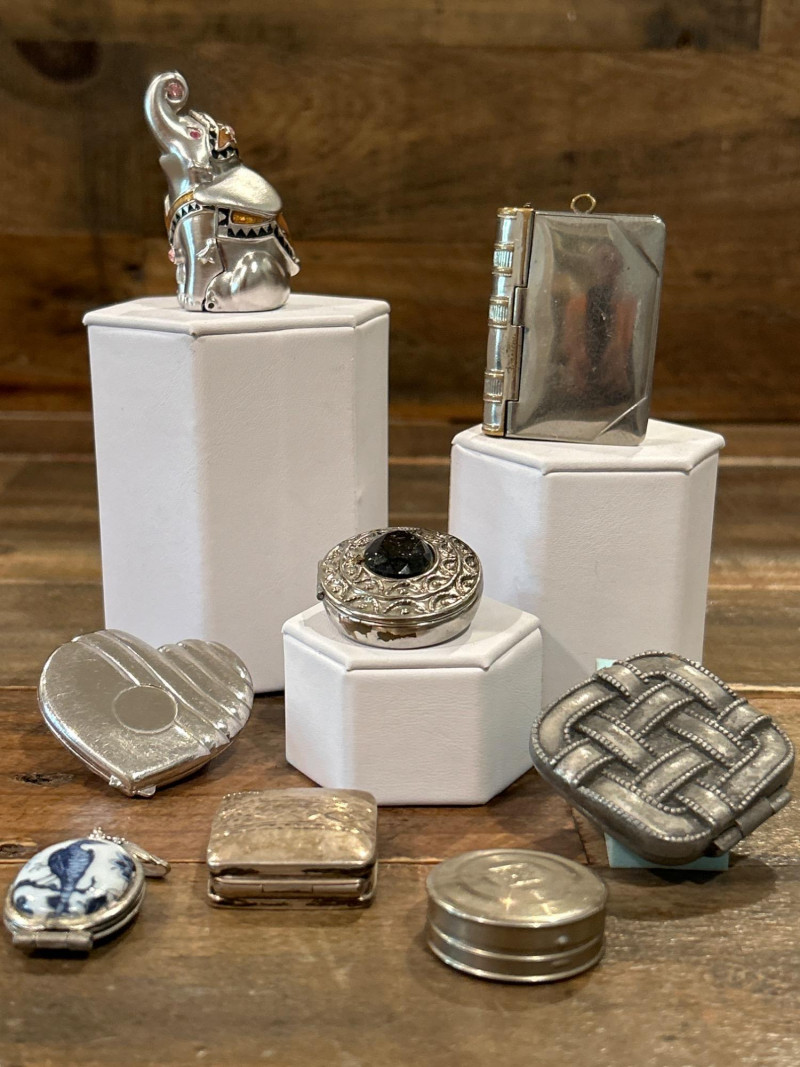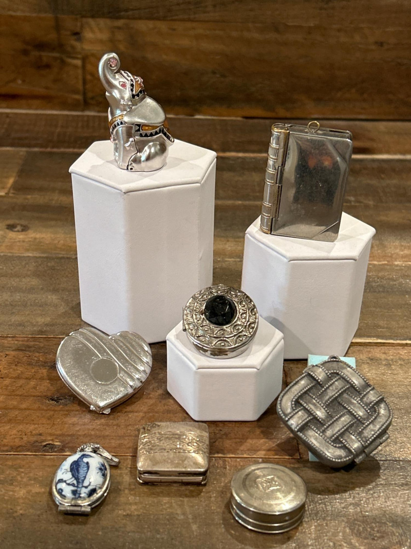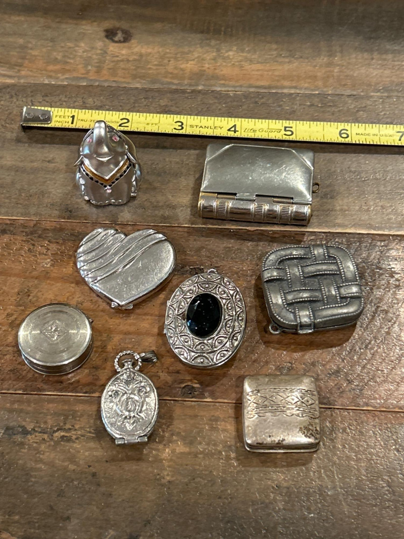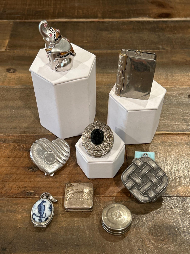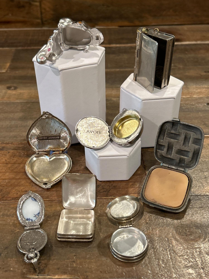 Lot # 112 - Collection of Eight Vintage Compacts, Perfume Lockets & Trinket Boxes