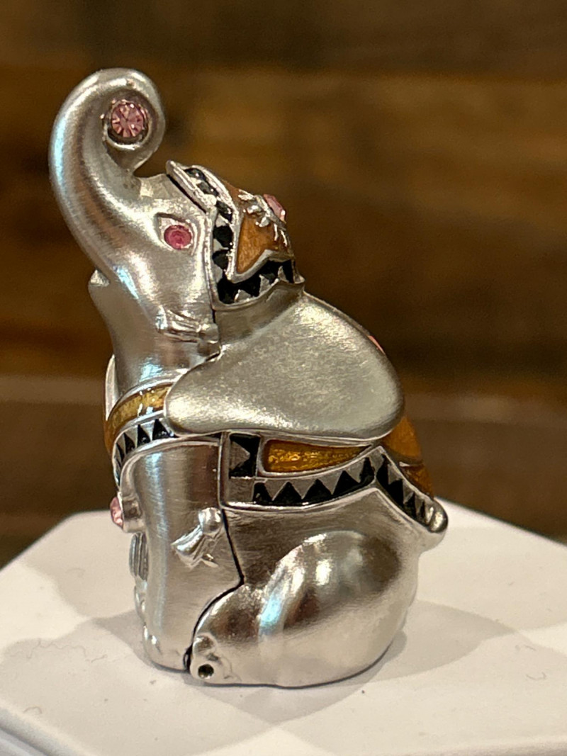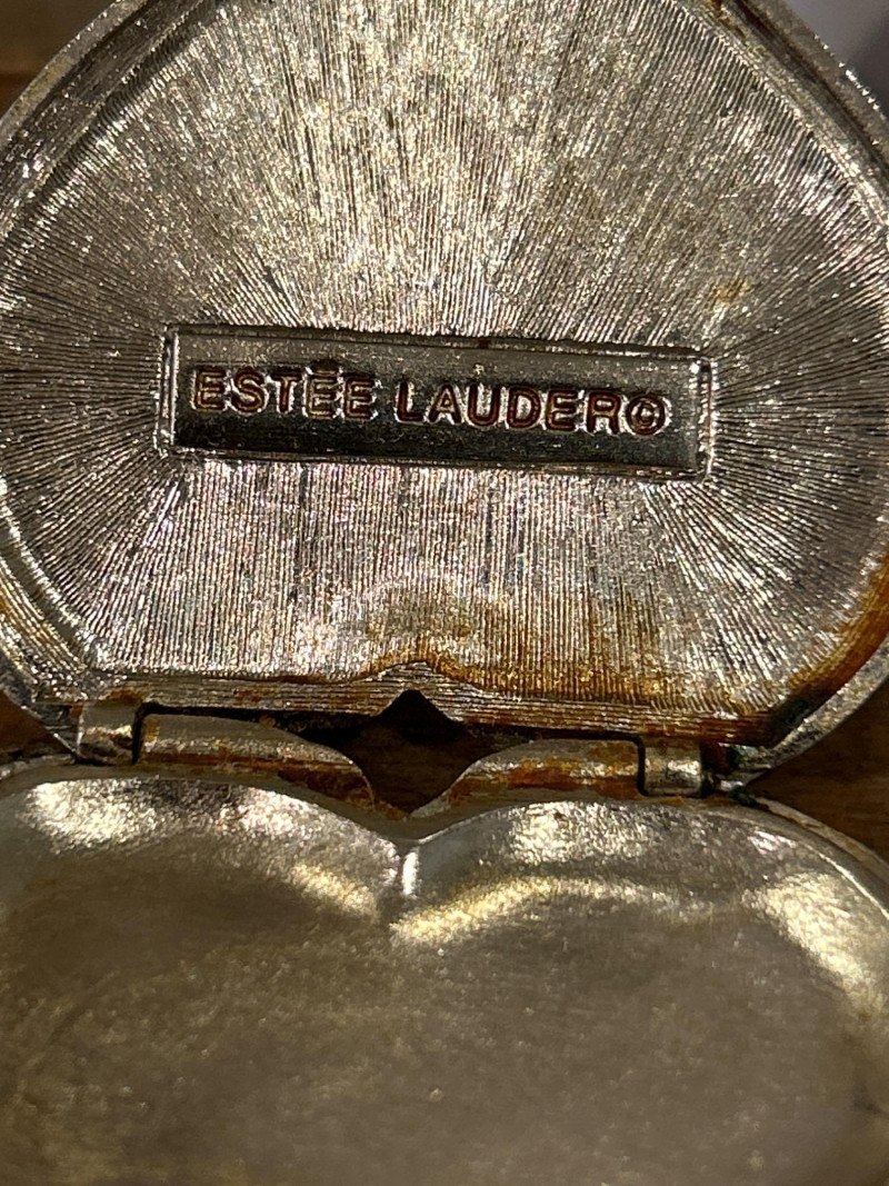 This diverse grouping includes collectible brands such as Estée Lauder, Avon, Goldette, and Richard Hudnut, alongside finely crafted artisan compacts. Each showcases detailed workmanship and design motifs reflecting its decade. Estée Lauder “Lucky Elephant” Solid Perfume Compact