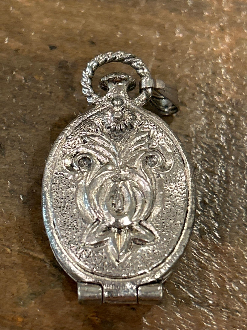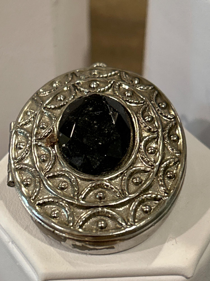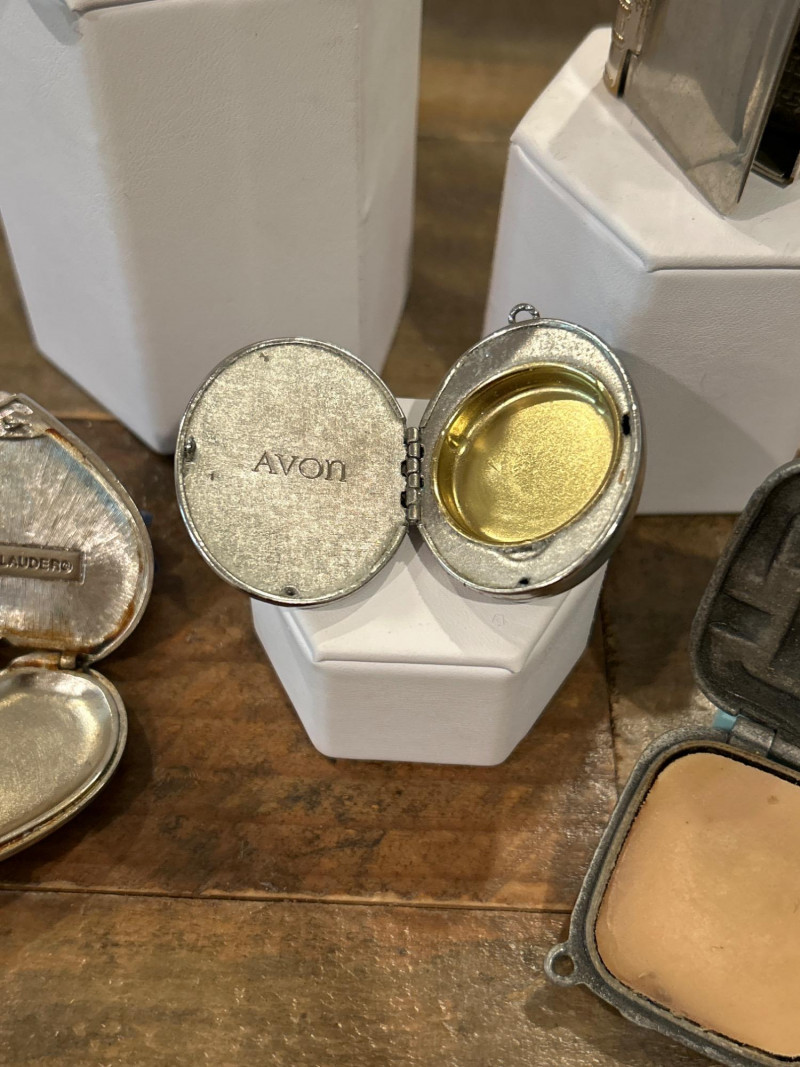 Era: c. 1930s Collecting Note: A classic pre-war compact by one of America’s earliest cosmetic houses, celebrated for its bold geometric design. Avon Silver-Tone Perfume Locket with Black Faceted Stone