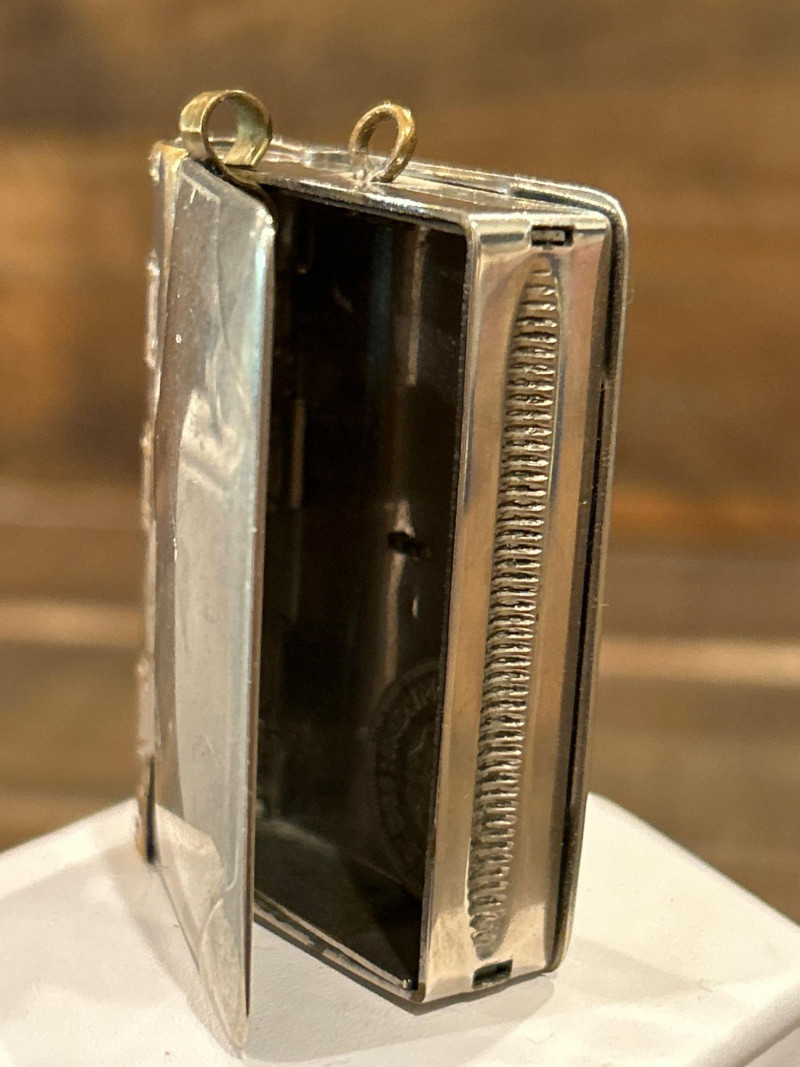 Collecting Note: Popular in Avon’s fashion jewelry lines, combining Gothic-inspired detailing with functional perfume storage. Silver-Plated Book-Form Vesta Case / Match Holder