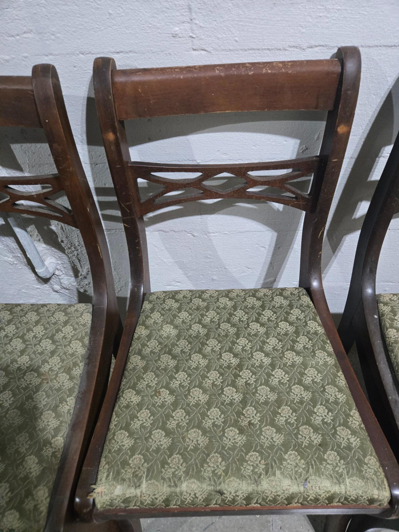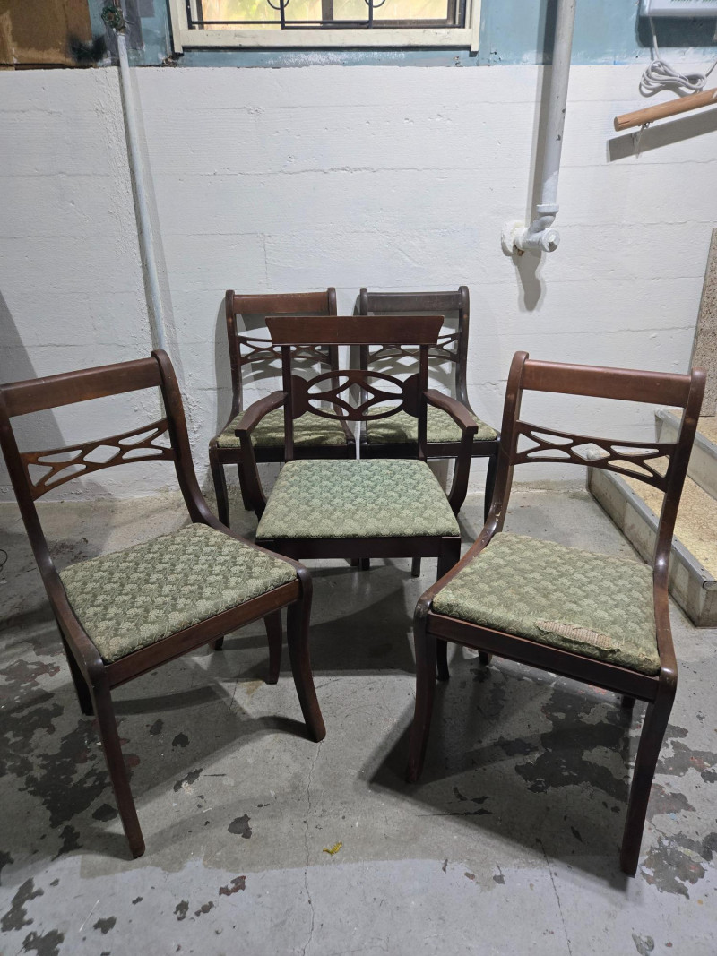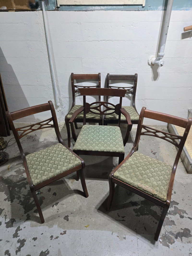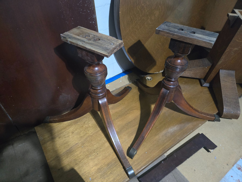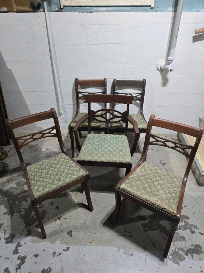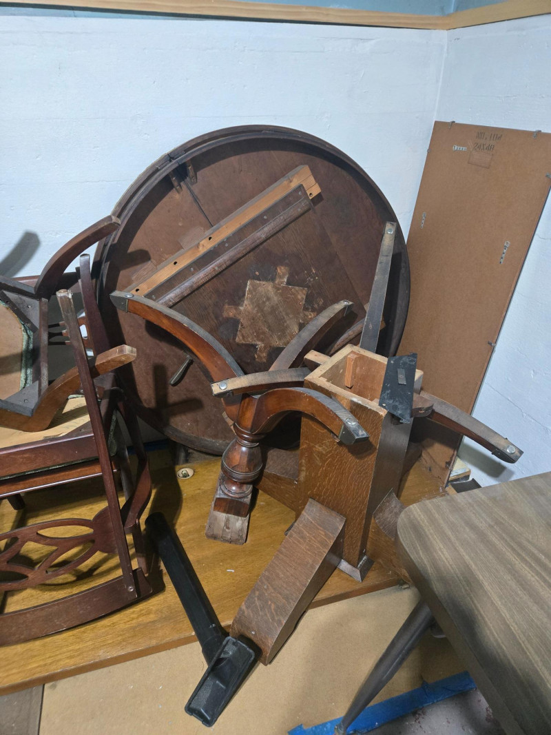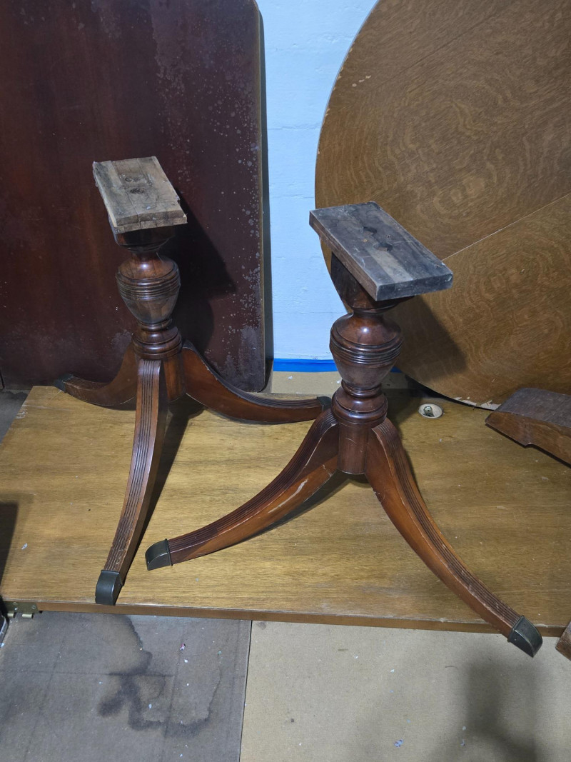 Five antique wooden dining chairs arranged in a semi-circle on a concrete floor, The last 13 photos are pictures of 2 dining room tables and their 'legs'. The legs look like they are in pretty good shape, the 2 tables, 1 round & 1 oblong need some TLC, yours for free if you win this lot. These chairs have a classic, possibly Victorian or Edwardian style, making them appealing for vintage collectors or DIY refurbishing projects. The last 12 photos are shots of 2 dismantled tables (of which one most likely goes with these chars), the pilar legs look in pretty good shape, but the tabletops need some TLC. Free to the person that wins this lot if they want them. IF YOU ARE TALING THE TABLES, PLEASE BRING STRONG HELP, THERE WILL BE NO ONE HERE TO HELP YOU