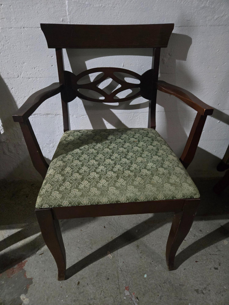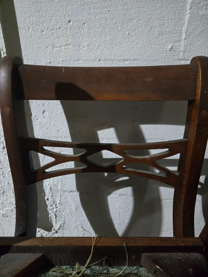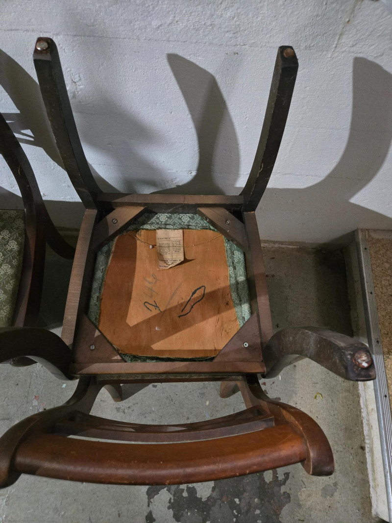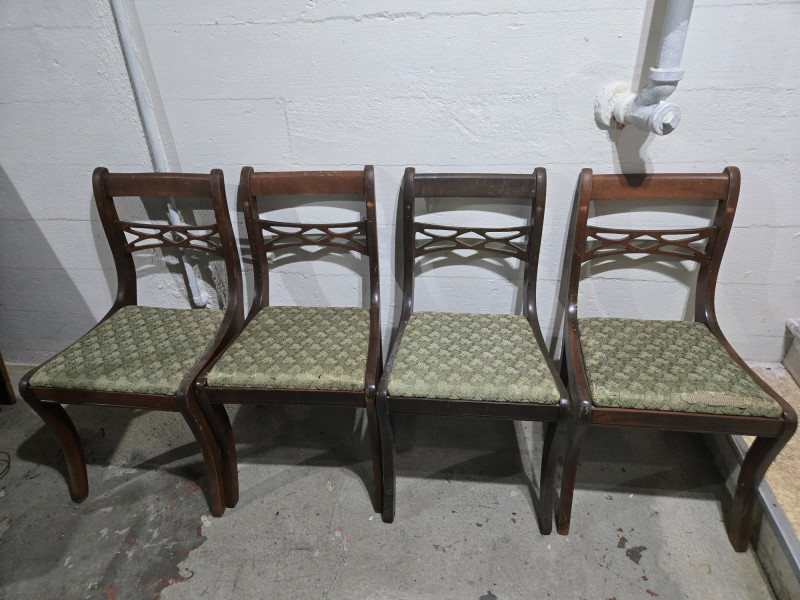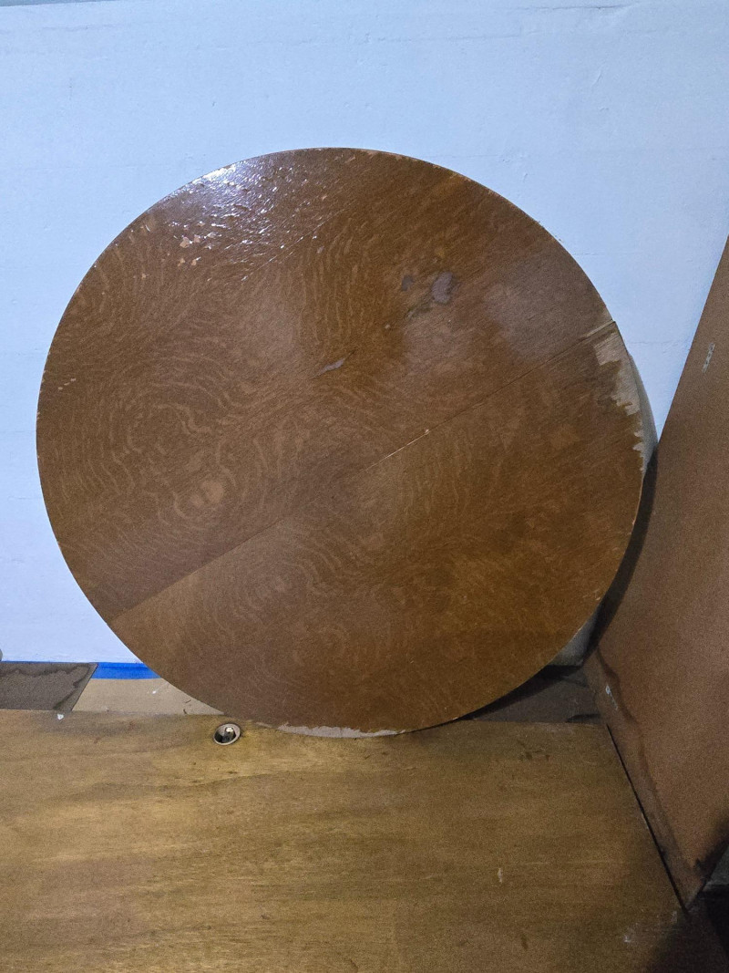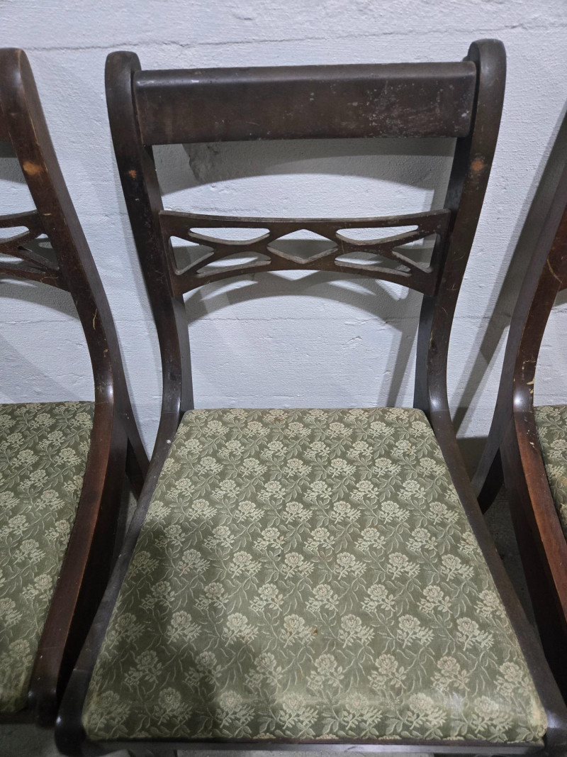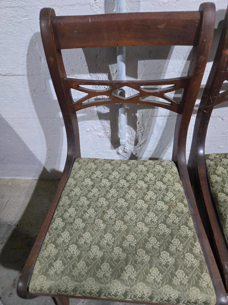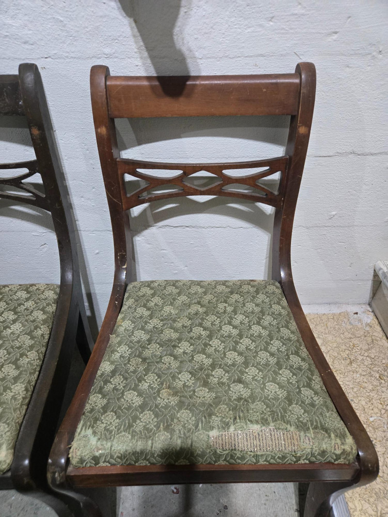 Five antique wooden dining chairs arranged in a semi-circle on a concrete floor, The last 13 photos are pictures of 2 dining room tables and their 'legs'. The legs look like they are in pretty good shape, the 2 tables, 1 round & 1 oblong need some TLC, yours for free if you win this lot. These chairs have a classic, possibly Victorian or Edwardian style, making them appealing for vintage collectors or DIY refurbishing projects. The last 12 photos are shots of 2 dismantled tables (of which one most likely goes with these chars), the pilar legs look in pretty good shape, but the tabletops need some TLC. Free to the person that wins this lot if they want them. IF YOU ARE TALING THE TABLES, PLEASE BRING STRONG HELP, THERE WILL BE NO ONE HERE TO HELP YOU