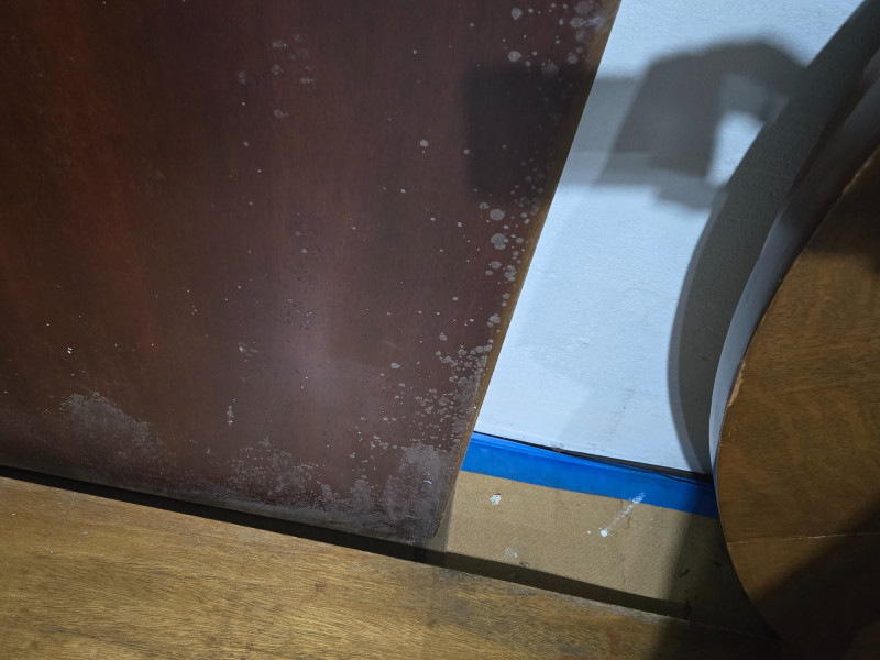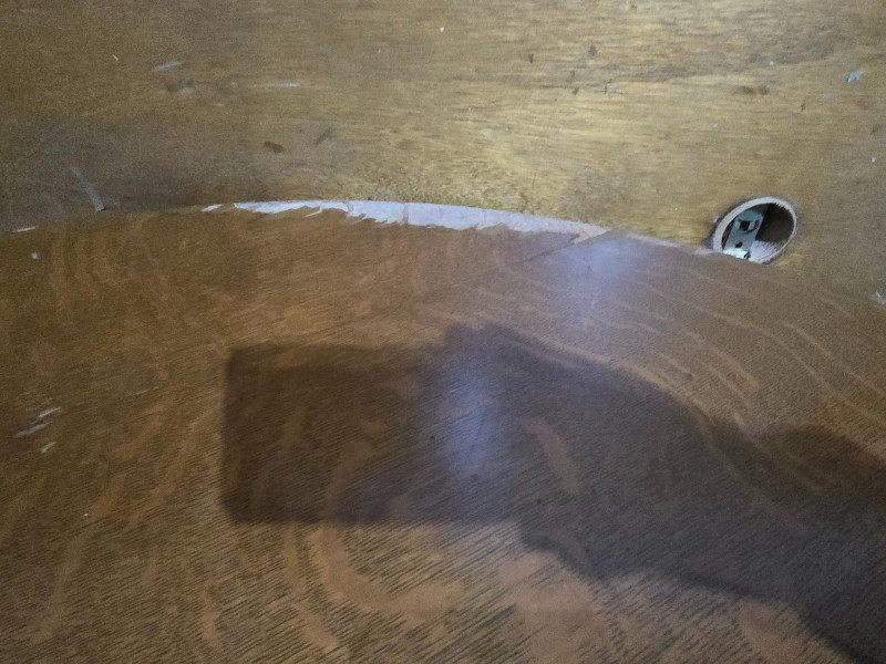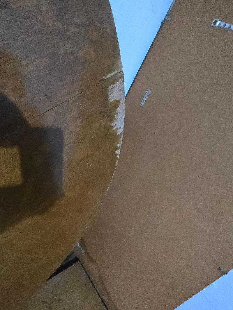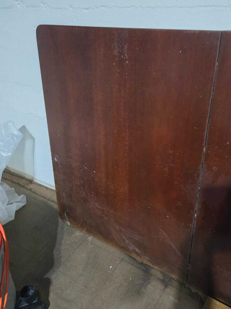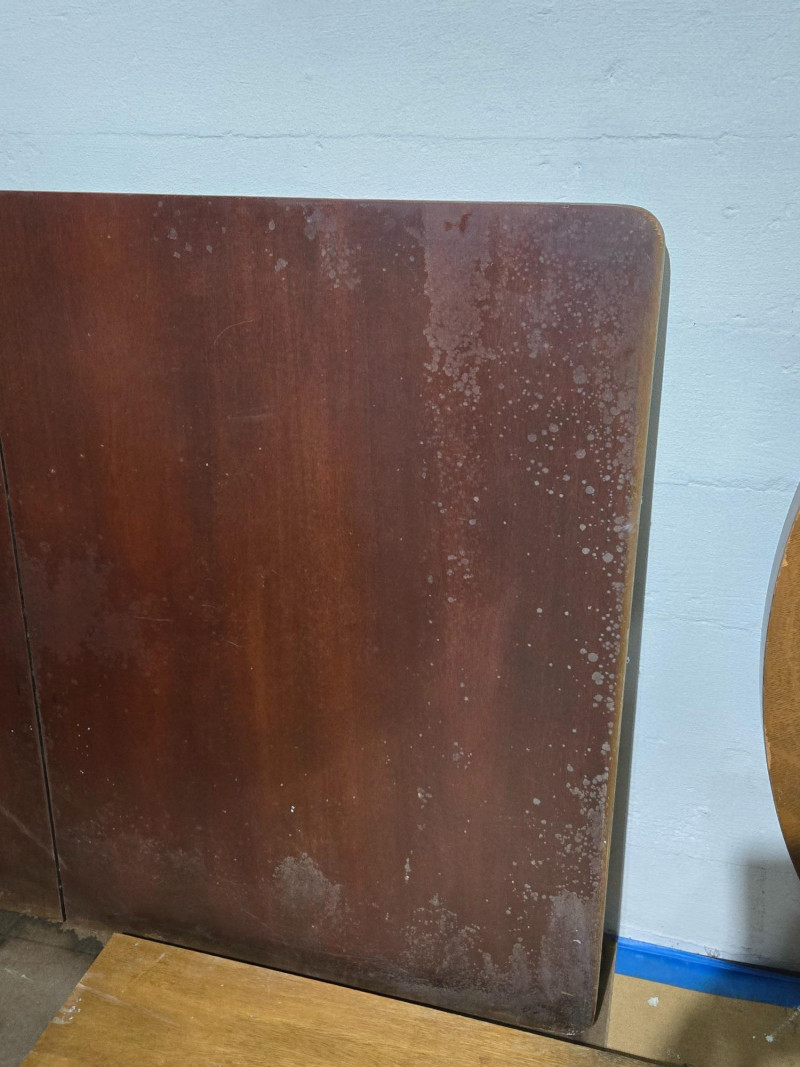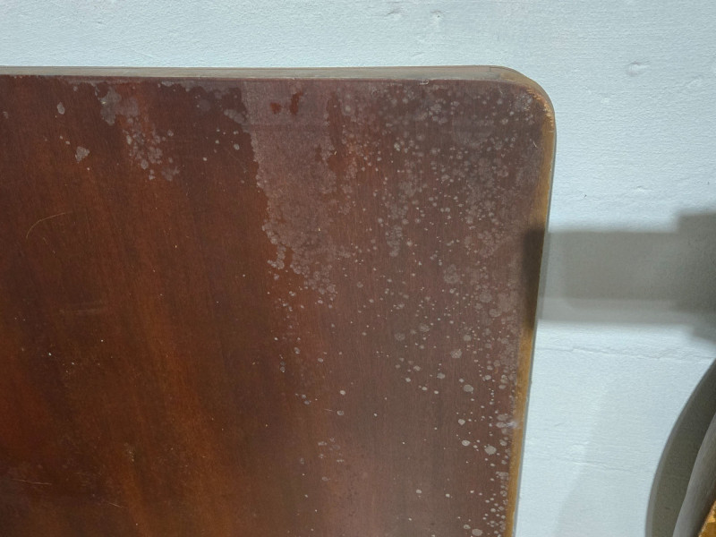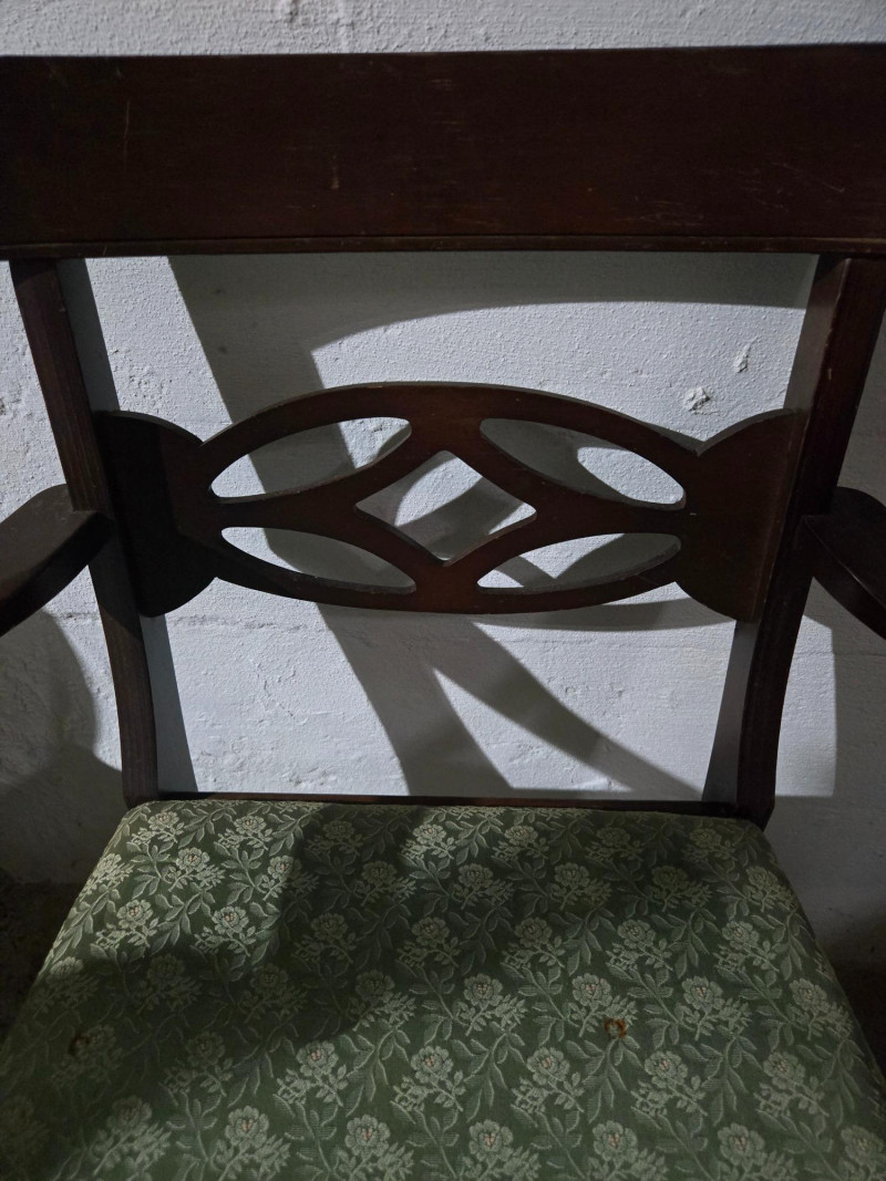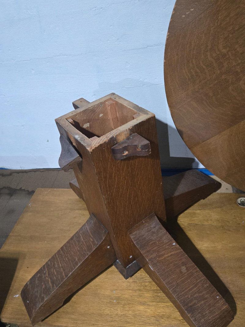 Five antique wooden dining chairs arranged in a semi-circle on a concrete floor, The last 13 photos are pictures of 2 dining room tables and their 'legs'. The legs look like they are in pretty good shape, the 2 tables, 1 round & 1 oblong need some TLC, yours for free if you win this lot. These chairs have a classic, possibly Victorian or Edwardian style, making them appealing for vintage collectors or DIY refurbishing projects. The last 12 photos are shots of 2 dismantled tables (of which one most likely goes with these chars), the pilar legs look in pretty good shape, but the tabletops need some TLC. Free to the person that wins this lot if they want them. IF YOU ARE TALING THE TABLES, PLEASE BRING STRONG HELP, THERE WILL BE NO ONE HERE TO HELP YOU