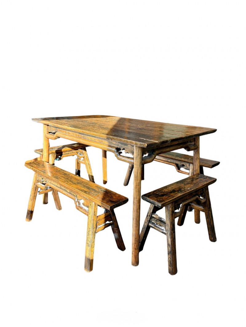 Approximate Dimensions: Table: 60" L × 32" W × 30" H Benches (each): 44" L × 10" W × 18" H Exquisite antique Chinese kitchen table with matching stools, crafted in elm wood in the Ming-style tradition. This set comes with an official Certificate of Antique issued by the Ning Po Art & Craft Merchants Association (China), dated July 5, 2001, which attributes the pieces to the Ch’ing (Qing) Dynasty period and estimates them to be approximately one hundred years old at the time of certification. The craftsmanship features classic Ming-style joinery, straight tapered legs, and understated geometric stretchers, reflecting the elegant restraint characteristic of Chinese design from the late imperial era. The elmwood displays a rich natural patina, testifying to both age and authenticity. Details: Origin: Northern China Wood: Solid Elm Style: Ming-style, attributed to the Ch’ing Dynasty Includes: One table and 4 matching stools/benches Certification: Official Certificate of Antique (issued 2001, Ref. No. 0196045) Condition: Excellent antique condition with age-appropriate wear and patina Historical Note: