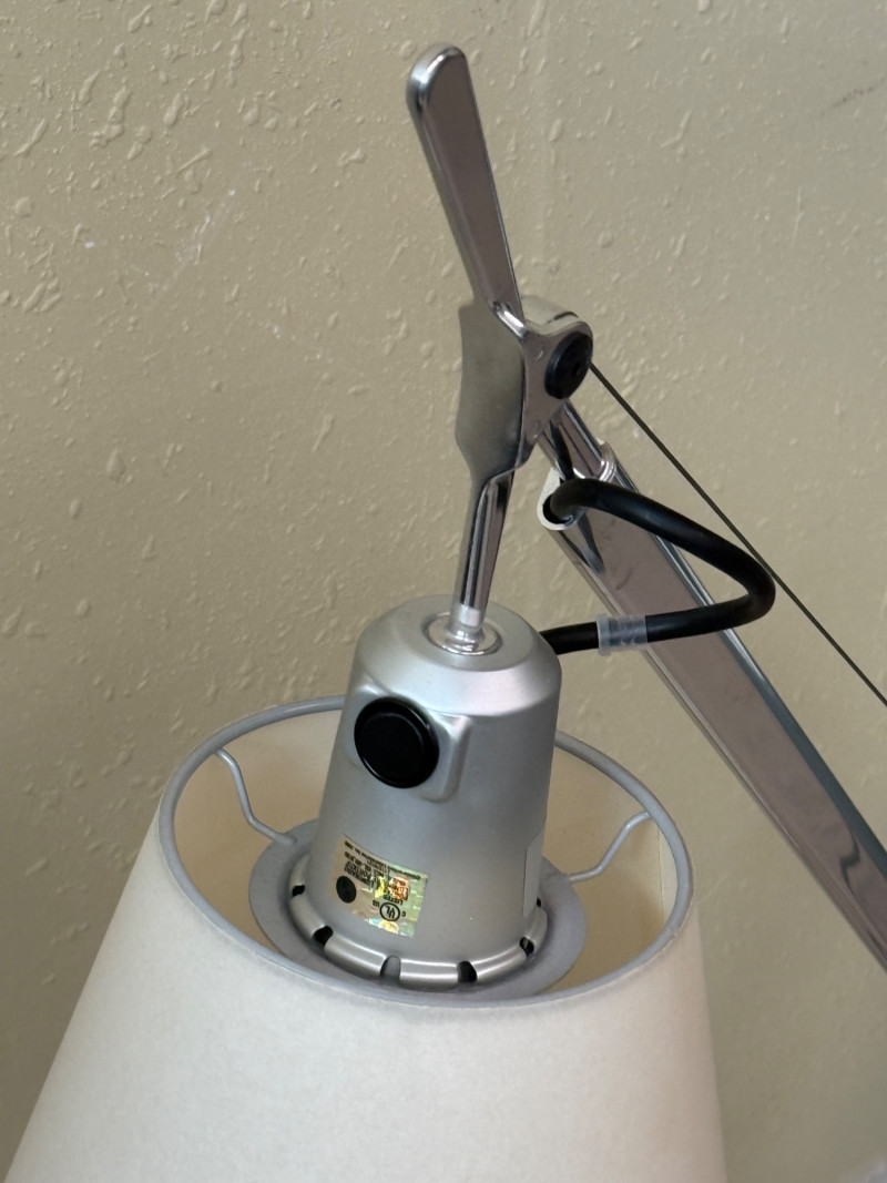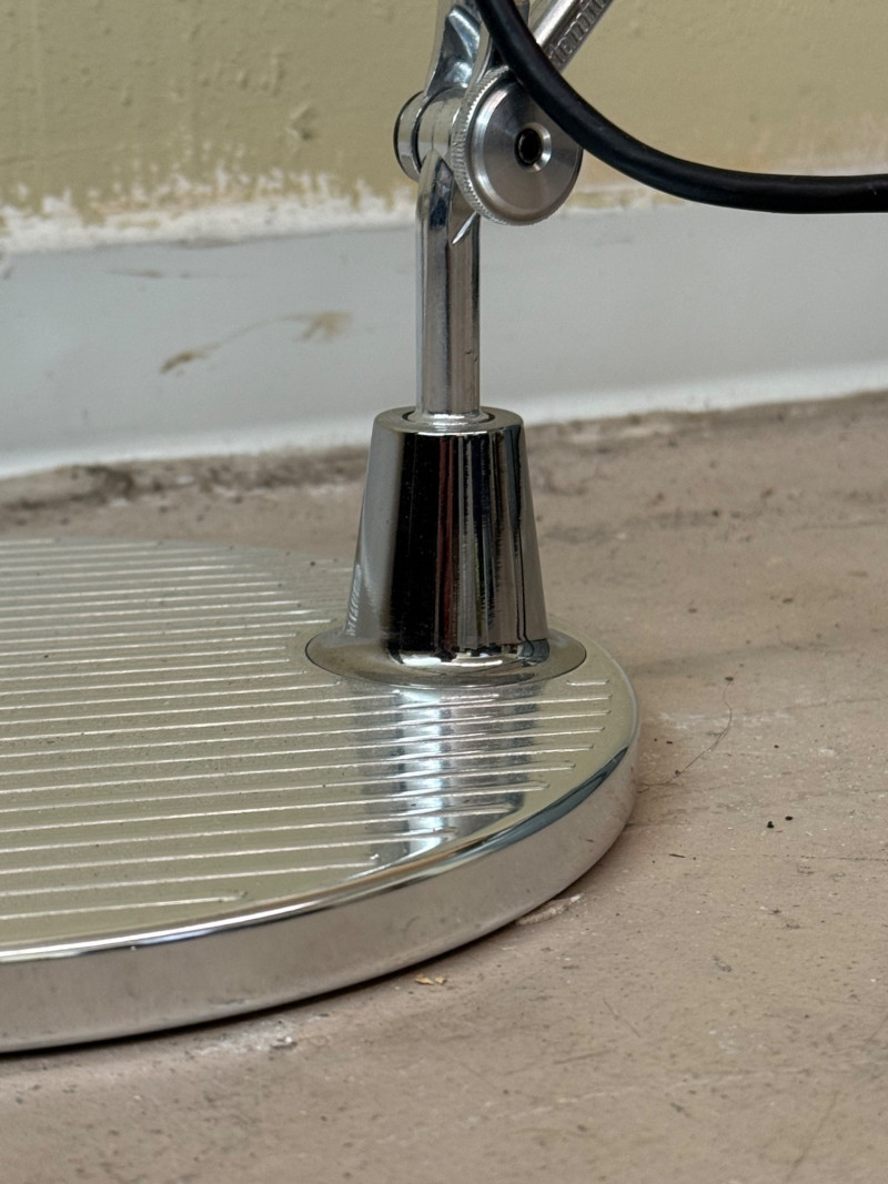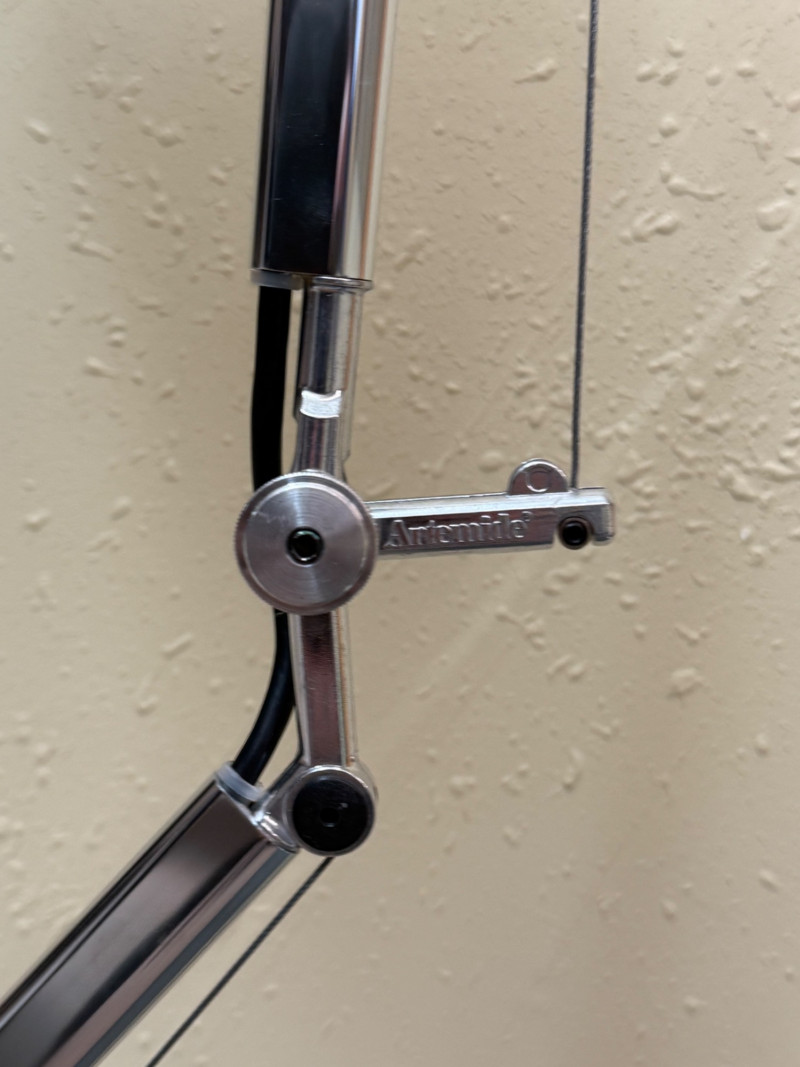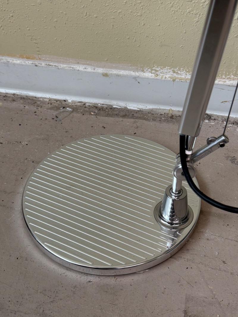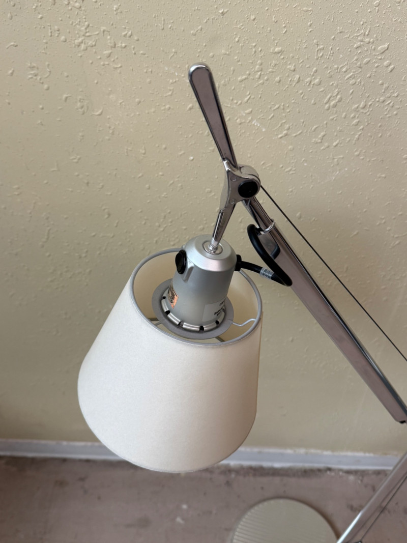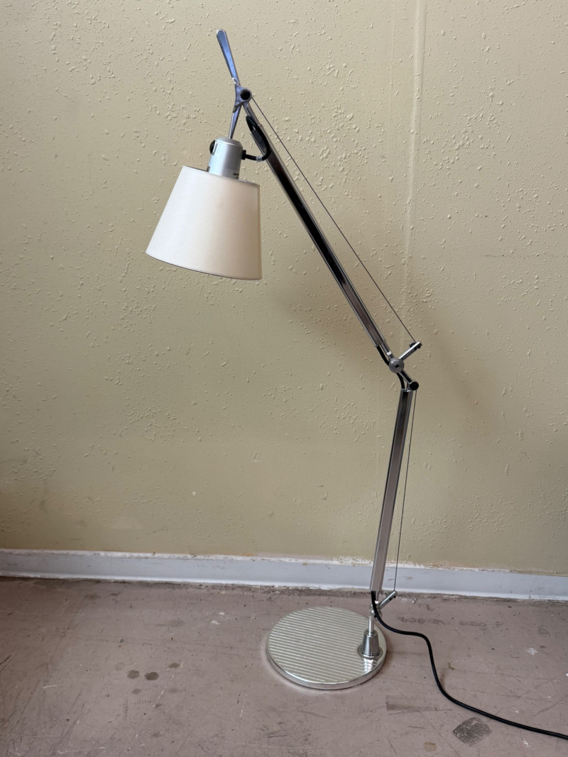 Artemide Tolomeo Basculante Reading Floor Lamp — Designed by Giancarlo Fassina & Michele De Lucchi A modern design icon by Artemide, the Tolomeo Basculante Reading Floor Lamp exemplifies Italian craftsmanship and engineering precision. Created by renowned designers Giancarlo Fassina and Michele De Lucchi, this piece merges timeless aesthetics with functional innovation. The articulated aluminum arm system allows seamless adjustability, while the parchment shade diffuses light with warm, even glow — perfect for reading, workspaces, or sophisticated interiors. Its minimalist chrome finish and counterbalanced frame make it as sculptural as it is practical. Brand: Artemide (Italy) Designers: Giancarlo Fassina & Michele De Lucchi Model: Tolomeo Basculante Reading Floor Lamp Materials: Polished aluminum frame, parchment diffuser Retail Price: $580+ USD Condition: Excellent working condition, minor wear consistent with use Dimensions: Approx. 52” H × 33” D (adjustable reach) A statement piece of Italian modernism — refined, versatile, and enduringly collectible.