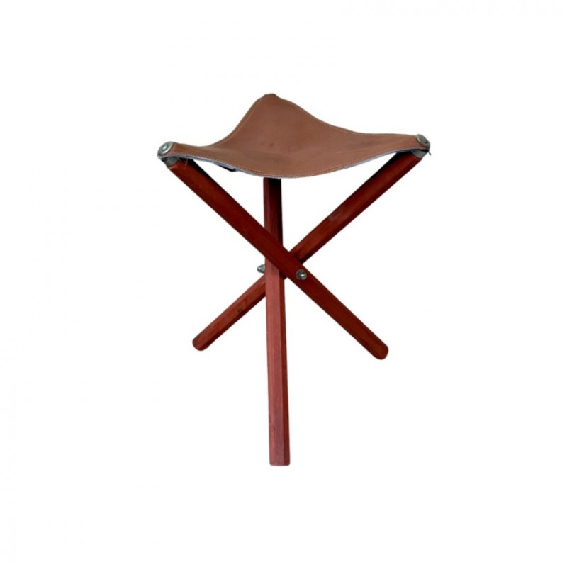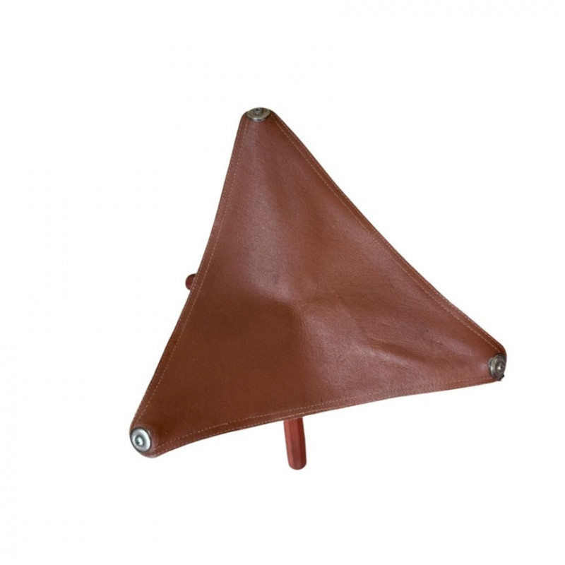Vintage French Hunting Tripod Chair – Leather Seat & Wood Frame Stylish vintage French folding tripod chair, designed in the classic hunting and fishing style. Features a sturdy solid wood frame with a warm finish and a leather or leather-like seat secured by metal rivets at each corner. Compact, foldable, and full of rustic European charm, this piece reflects the craftsmanship of traditional French field furniture. Perfect as a functional accent chair, minimalist side piece, or decorative prop with timeless appeal. Style: French hunting / fishing tripod chair Materials: Wood frame, leather-like seat, metal hardware Design: Folding tripod construction for easy portability Condition: Excellent vintage condition with minor wear consistent with age Dimensions: Approx. 18” H × 13” W
