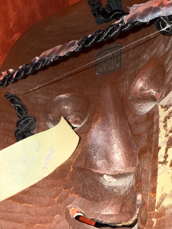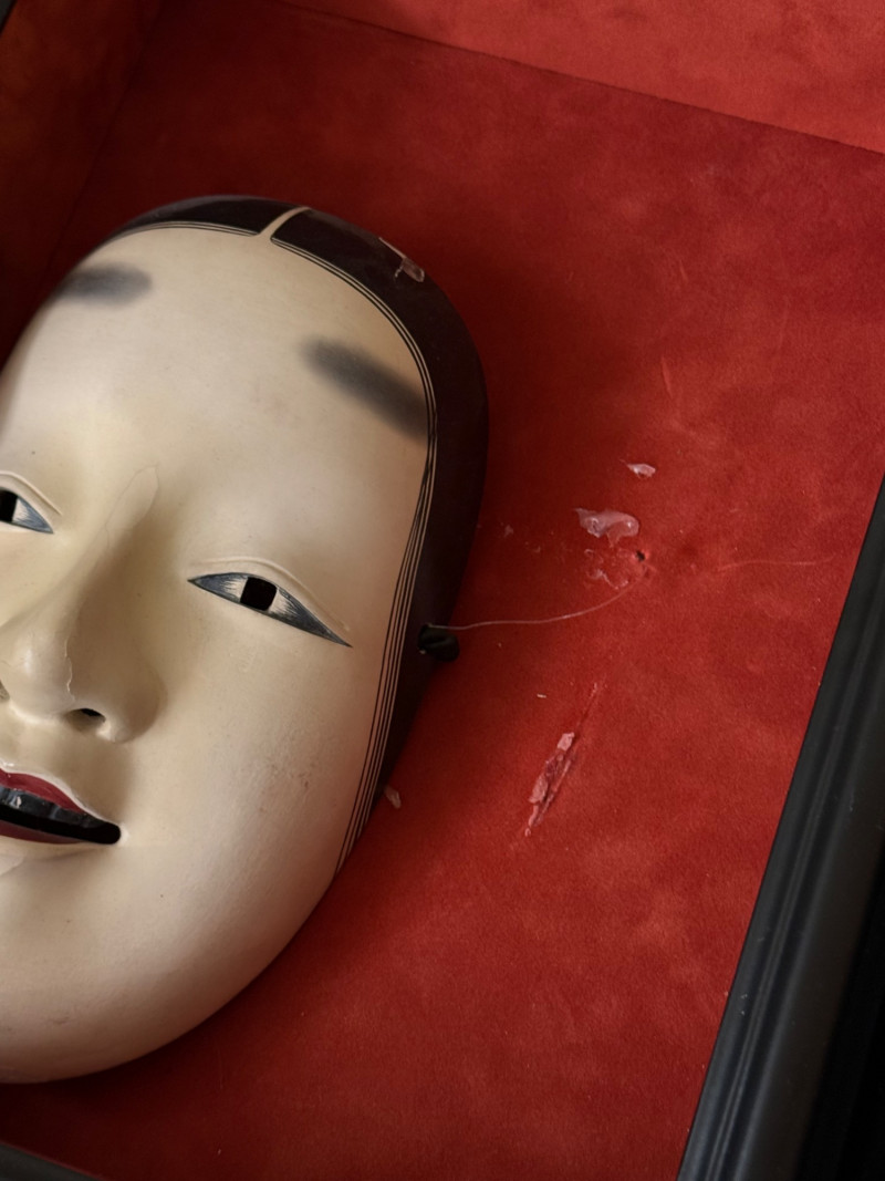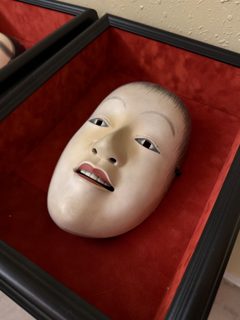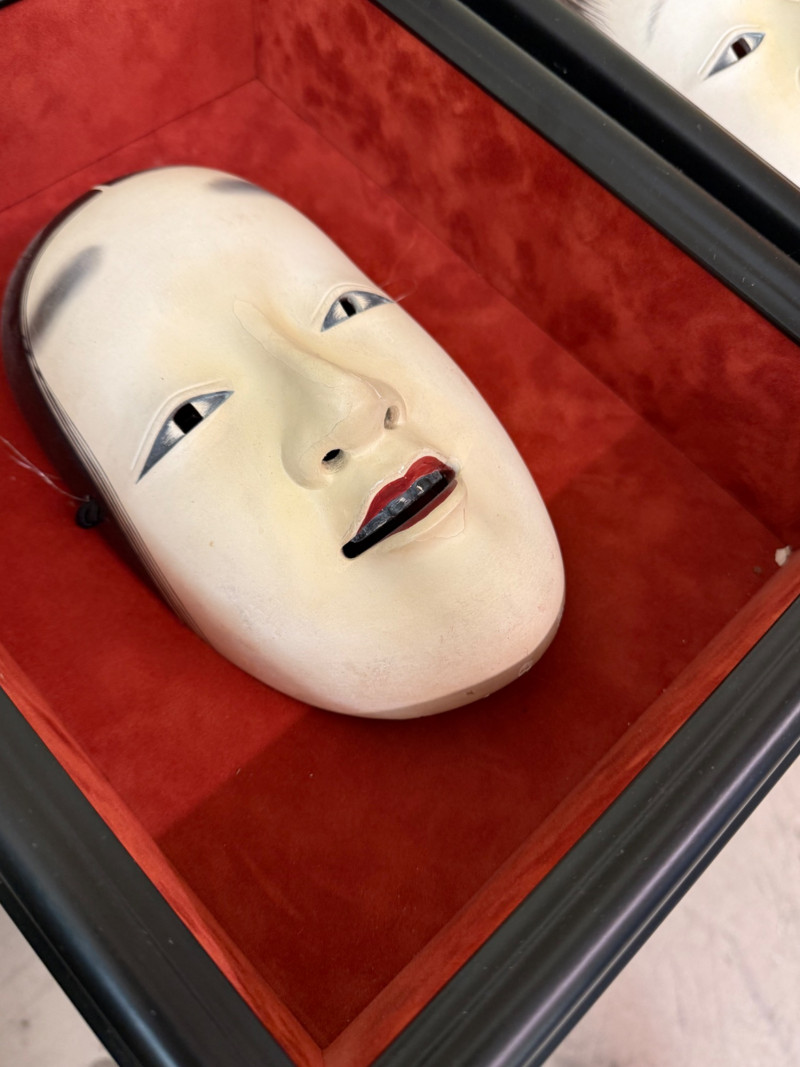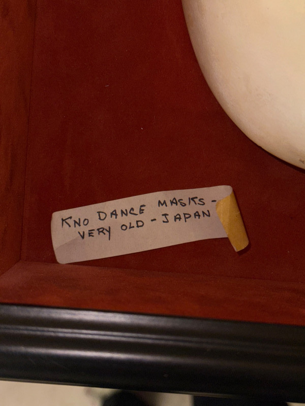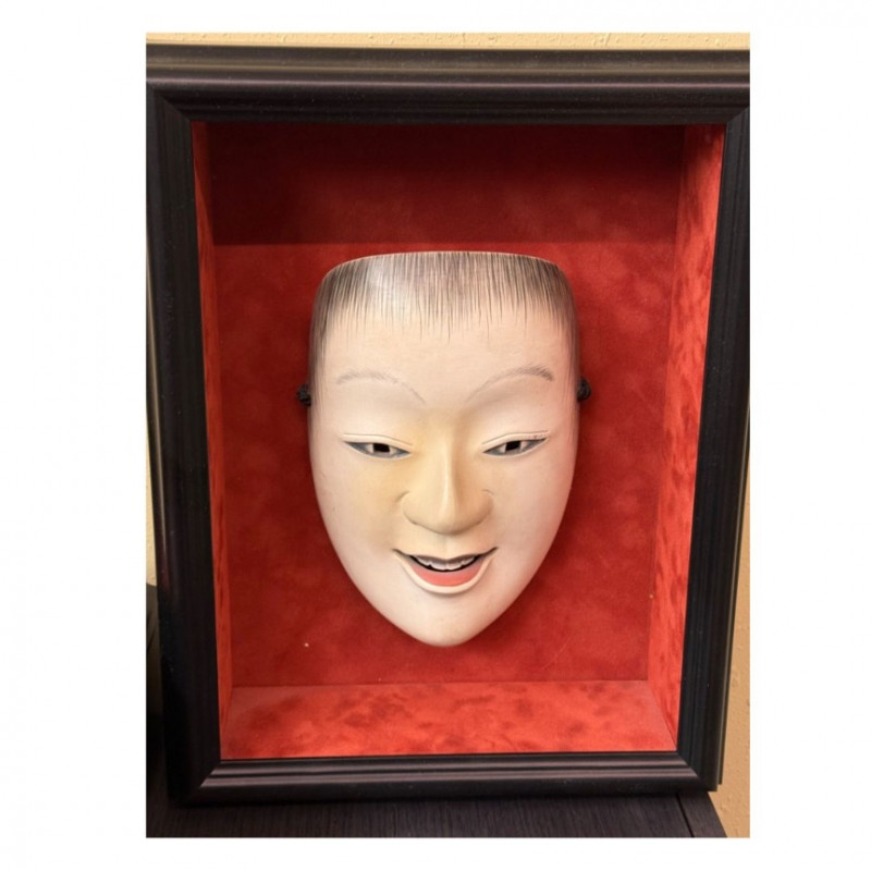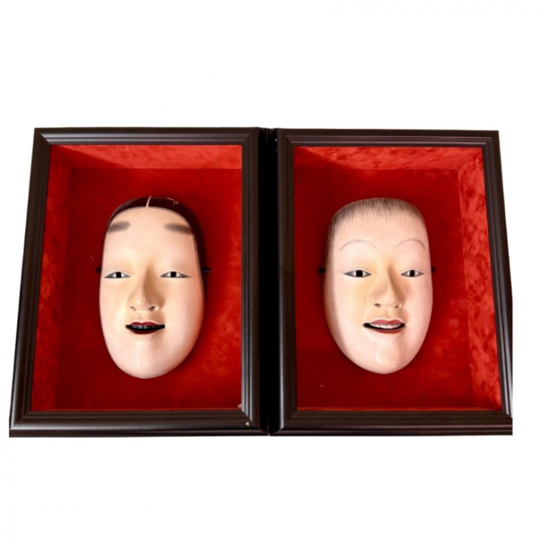 Single Zoh-Onna masks attributed to artisans like Takada Fuki are valued around $1,100–$1,200 each on major art marketplaces. This framed pair, with light restoration, would be valued at approximately $1,500–$1,800.