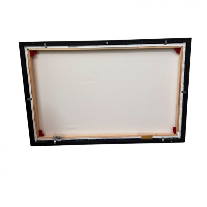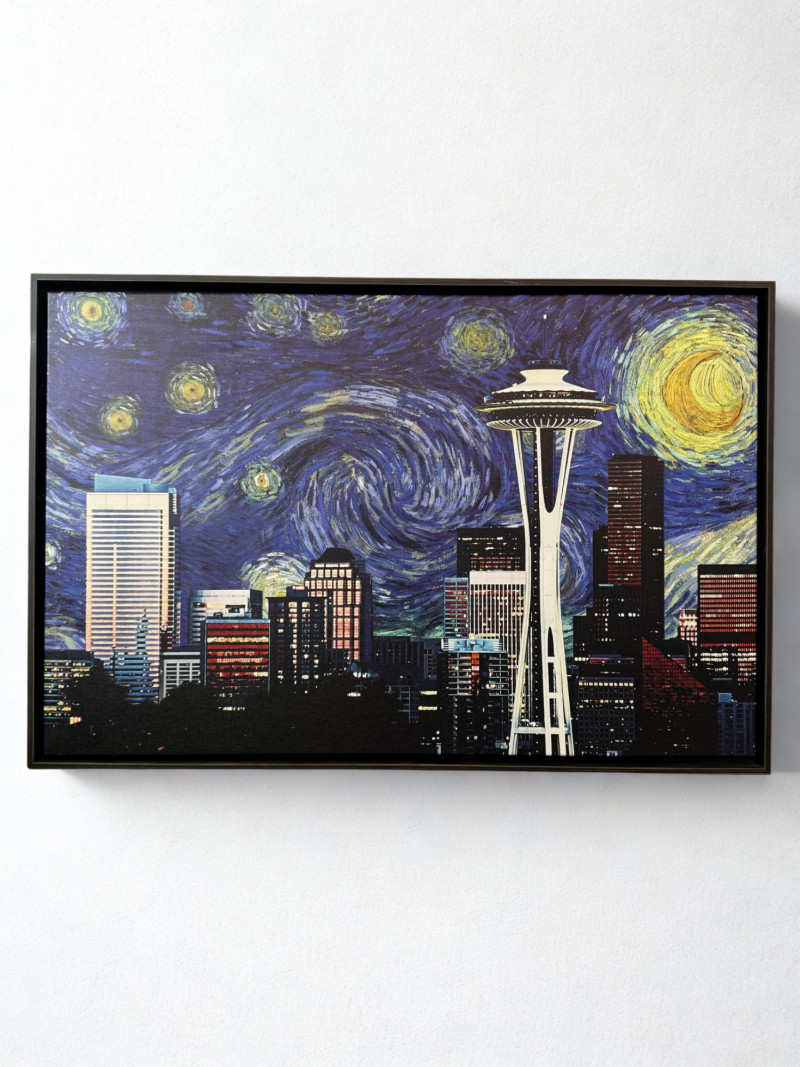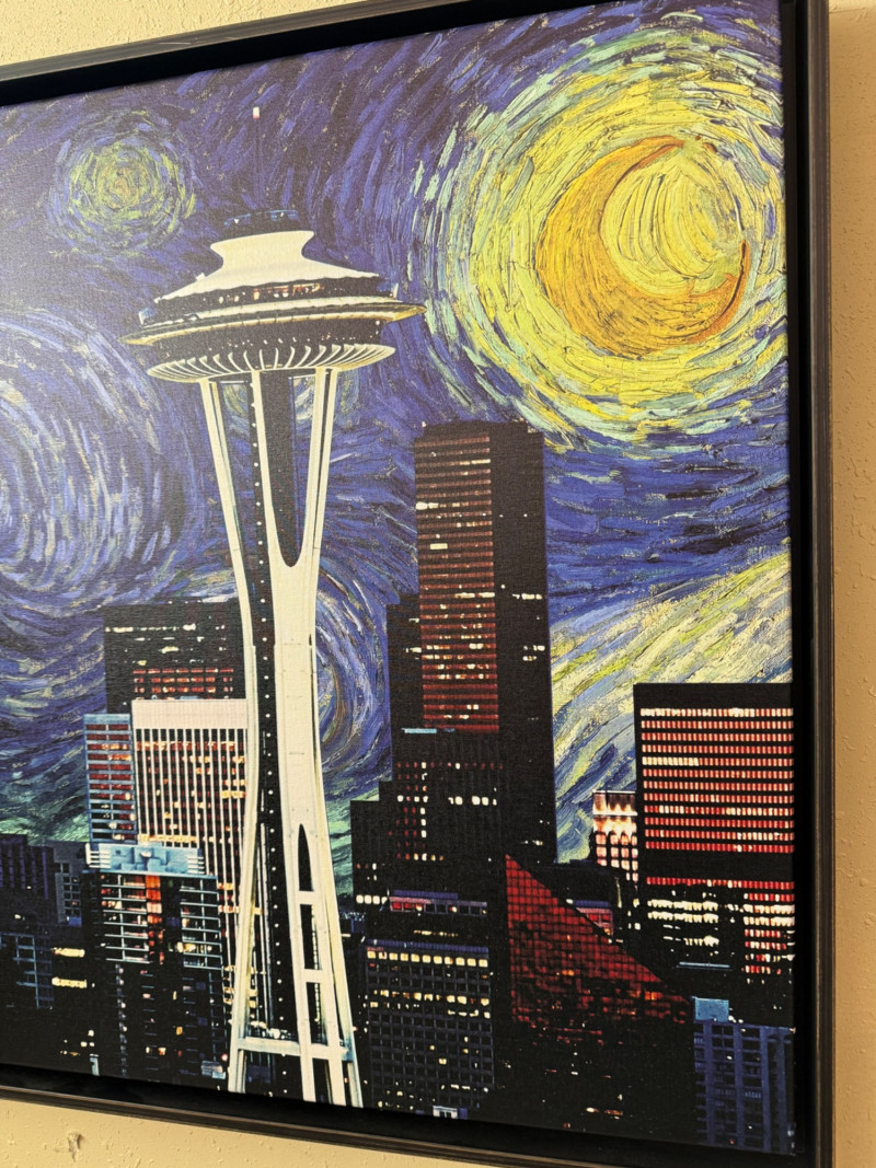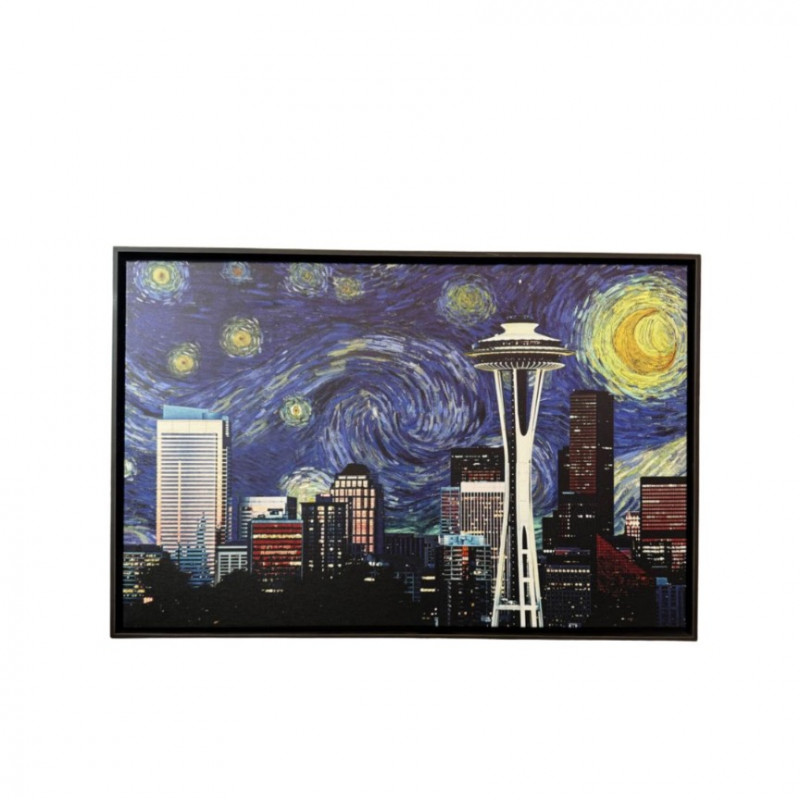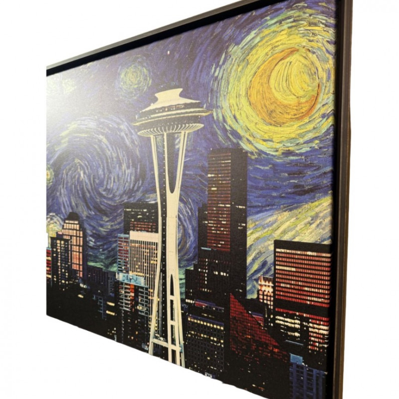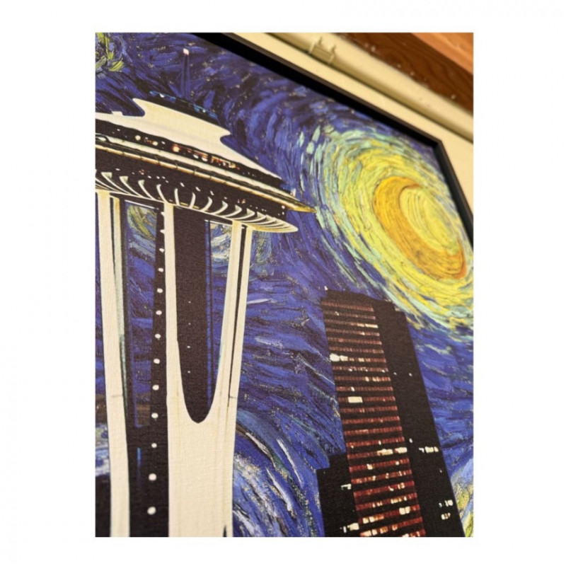 “Seattle Starry Night” Framed Art Print Vibrant framed art print blending Van Gogh’s “Starry Night” with the Seattle skyline — a striking fusion of classic art and modern cityscape. Features the iconic Space Needle beneath swirling celestial skies in vivid blues and yellows. Medium: Printed on textured canvas Frame: Black contemporary wood frame Condition: Excellent Dimensions: Approx. 41” W