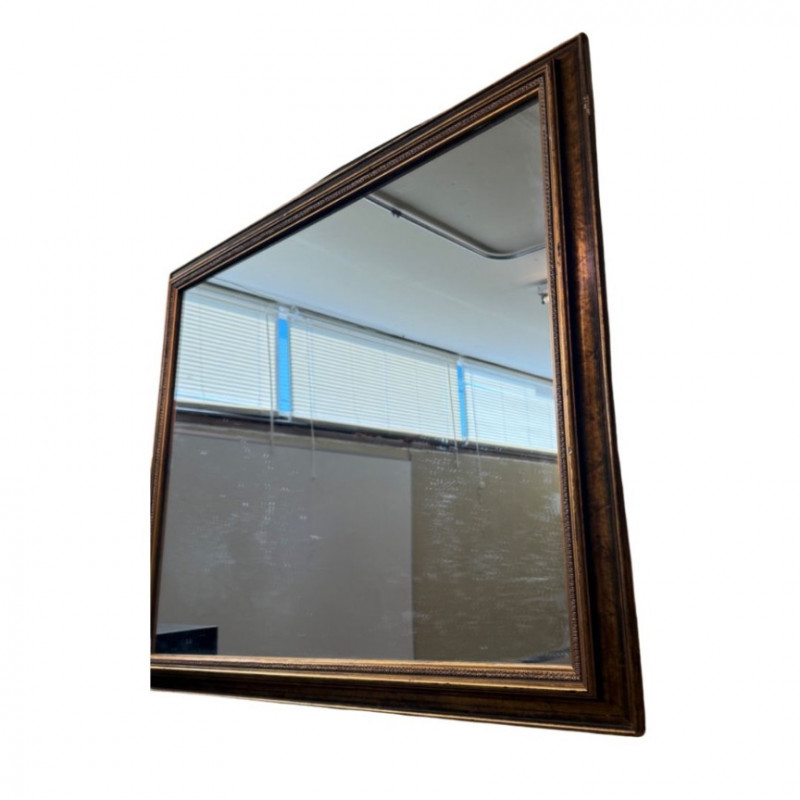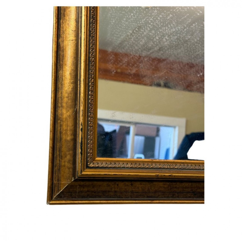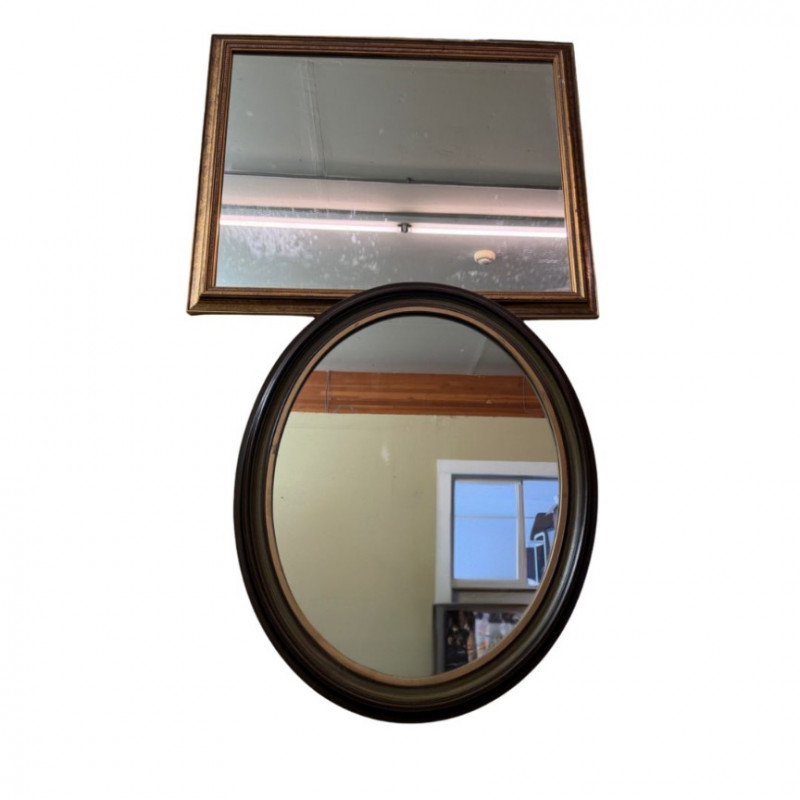Pair of Wall Mirrors – Rectangular & Round (Set of 2) Elegant and versatile, this pair of wall mirrors includes one rectangular mirror with a warm gold-toned frame and one round mirror with a deep bronze finish. The contrasting shapes create a dynamic yet cohesive look, perfect for an entryway, dressing area, or gallery wall arrangement. Includes: 1 rectangular mirror, 1 round mirror Materials: Framed glass with wood or composite molding Finish: Antique gold and dark bronze Condition: Excellent, minor wear consistent with age Dimensions (approx): Rectangular mirror: 33" W × 27.5" H Round mirror: 32" diameter Display together for a curated designer look or style separately to add light and depth throughout your space.