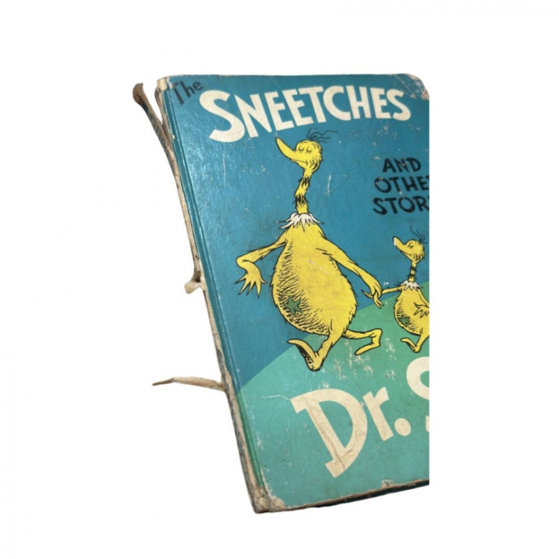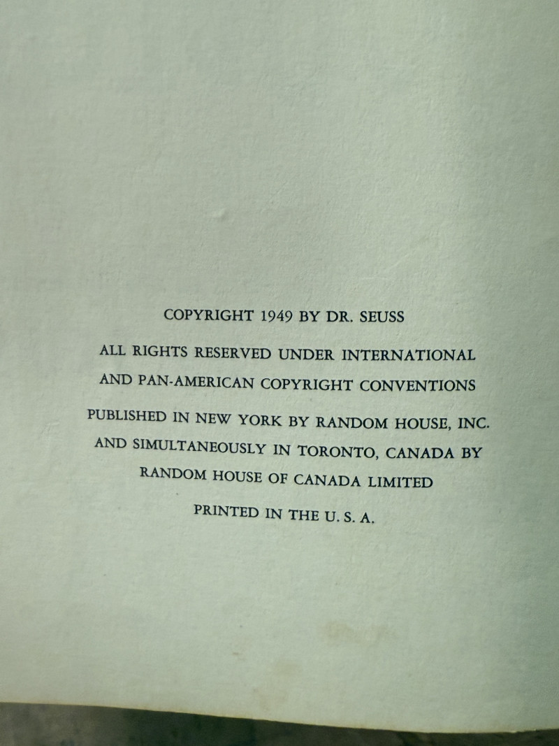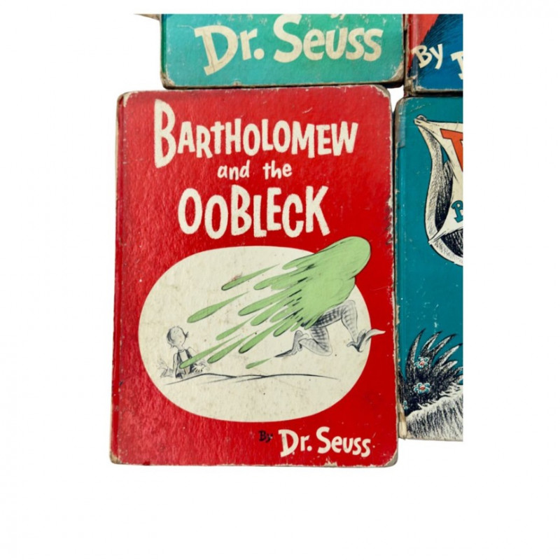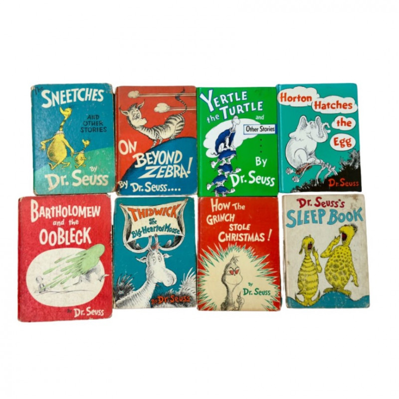 Vintage Dr. Seuss Book Collection — Random House Hardcovers (1940s–60s) Lot of eight vintage Dr. Seuss hardcover books published by Random House, including titles such as The Sneetches and Other Stories, On Beyond Zebra!, Yertle the Turtle, Horton Hatches the Egg, Bartholomew and the Oobleck, Thidwick the Big-Hearted Moose, How the Grinch Stole Christmas!, and Dr. Seuss’s Sleep Book. Several early and mid-century printings (one copyright 1949 by Dr. Seuss / Random House Inc.), printed in the U.S.A. These beloved classics feature Dr. Seuss’s whimsical illustrations and timeless rhymes, making them a charming addition to any vintage children’s book collection. Condition: All show signs of age and wear including scuffs, binding separation on a few volumes, and cover wear — please see photos for details. Early Random House editions of Seuss titles are highly collectible and sought after by vintage book collectors.