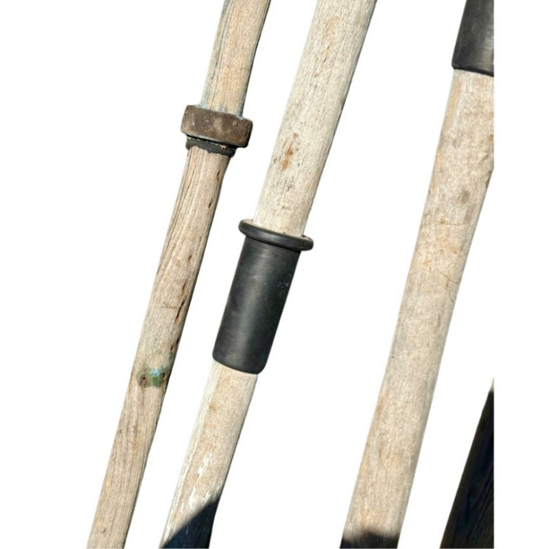 Beautiful set of four vintage solid wood boat oars featuring a naturally aged gray patina and original metal oarlocks. Each shows authentic wear and texture from years of use, adding character and coastal charm. Ideal for display in lake cabins, boathouses, or nautical-inspired interiors.