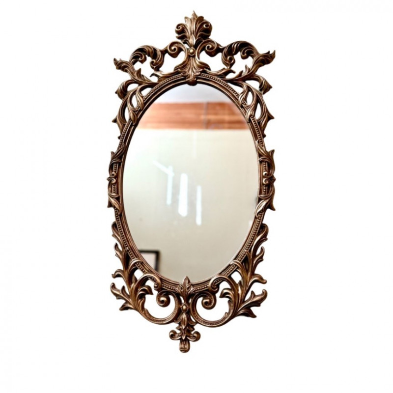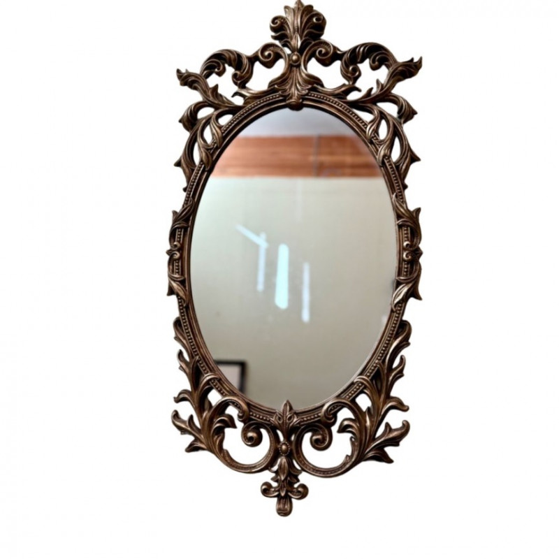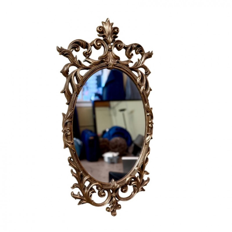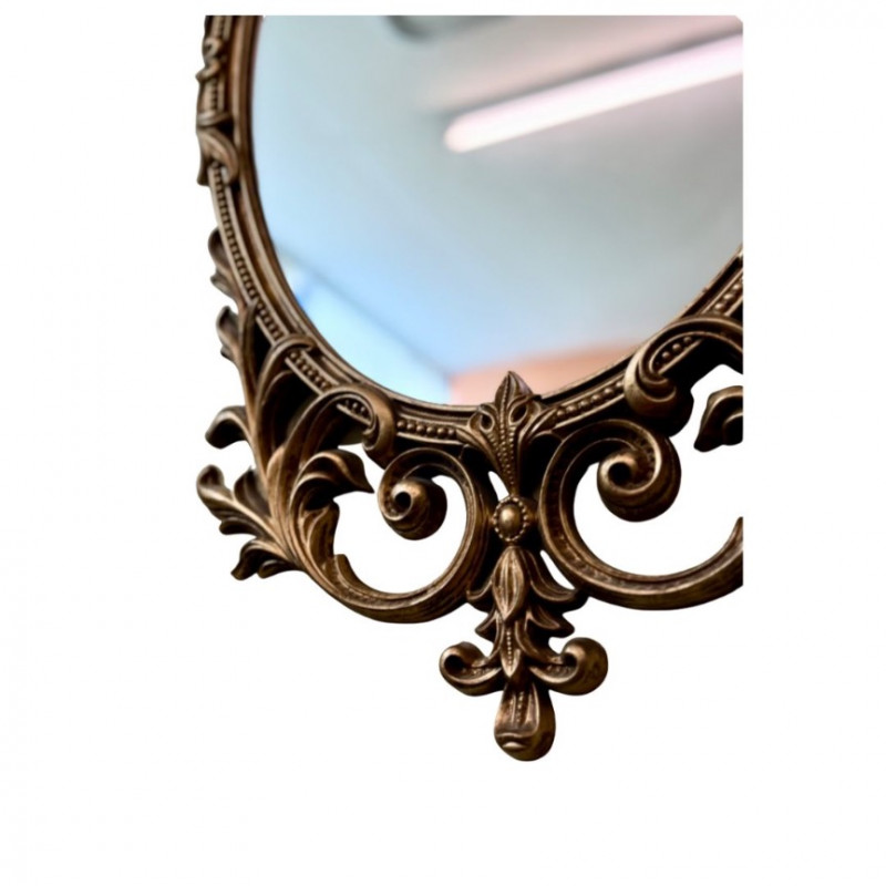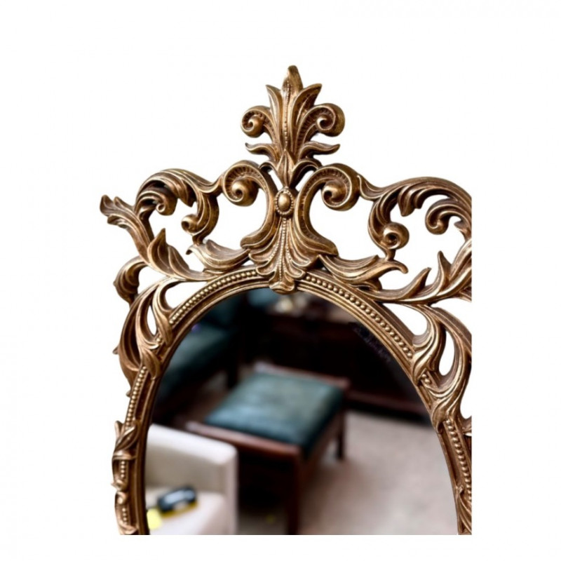 Vintage Turner Ornate Gilt Wall Mirror — Oval Frame (32” x 15”) Elegant vintage Turner wall mirror featuring an ornate oval frame in antique gold gilt finish with scrolling acanthus leaf motifs and a decorative crest. This mid-century piece exudes Hollywood Regency charm and adds sophistication to any entryway, bedroom, or gallery wall. Brand: Turner Era: Mid-Century (c. 1950s–60s) Material: Composite with gold gilt finish Color: Antique gold / beige tones Condition: Excellent vintage condition; minor wear consistent with age Measurements: Approx. 32” H × 15” W A collectible Turner mirror known for its ornate silhouette and timeless glamour.