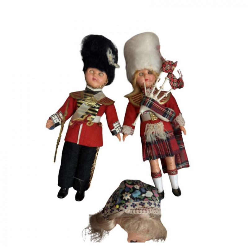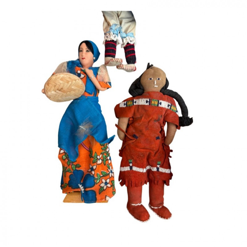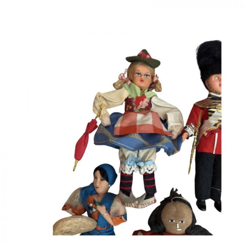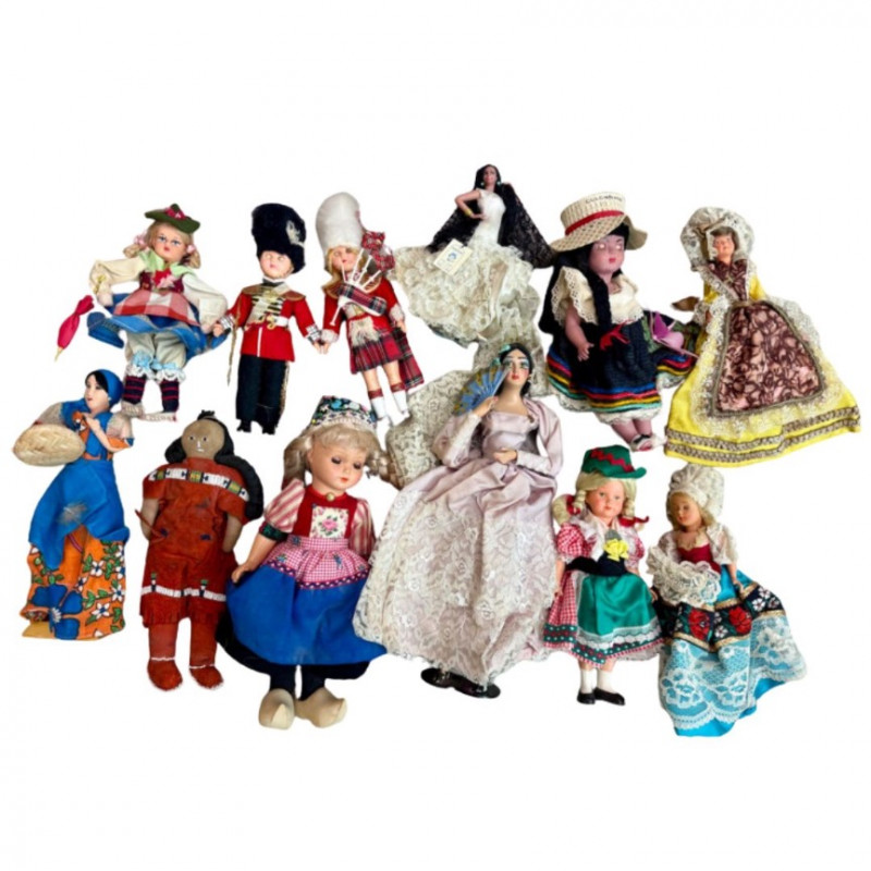 Collection of Vintage International Costume Dolls — Mid-Century to 1970s Highlights include dolls representing Scotland, England, Germany, Italy, Mexico, Colombia, and Native American heritage, among others — offering a colorful and nostalgic glimpse into global craftsmanship and mid-century souvenir art. Type: Vintage international costume doll collection