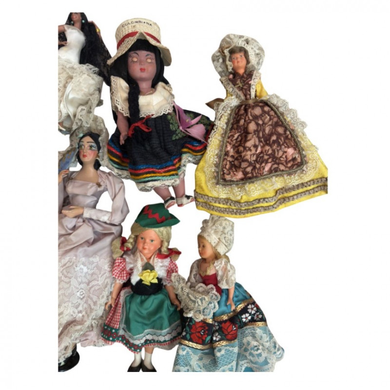 Charming assortment of vintage international costume dolls, each dressed in traditional attire representing countries and cultures around the world. This curated set includes dolls made from a mix of composition, cloth, and plastic, many featuring hand-painted faces, intricate fabric detailing, and miniature accessories.