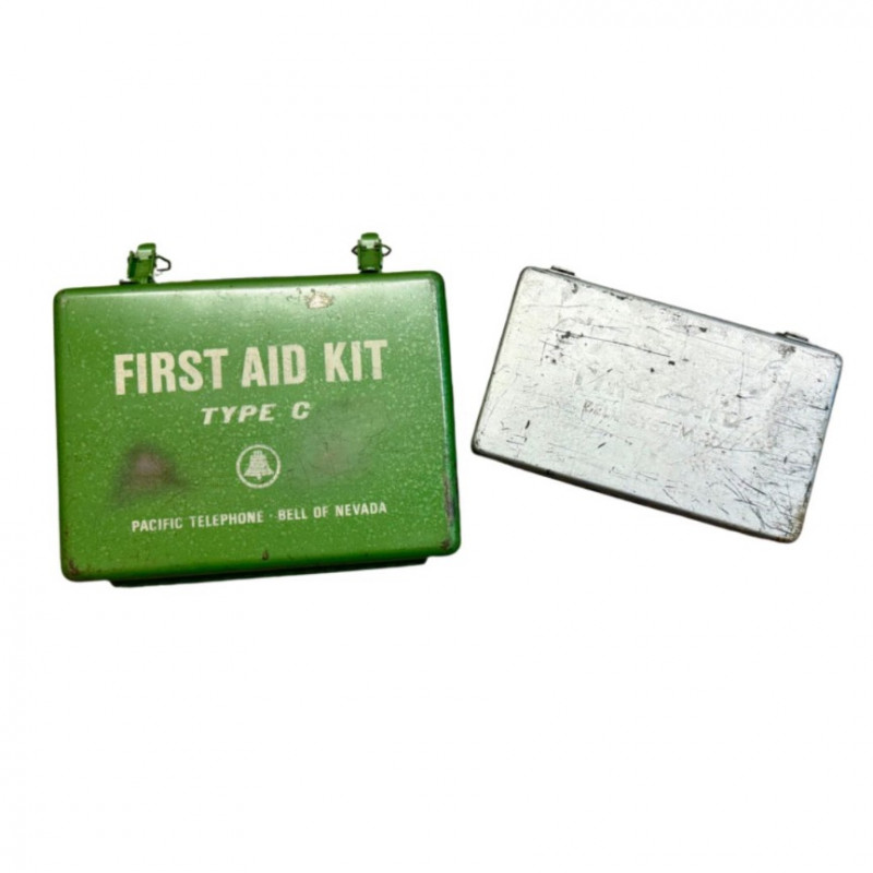 Pair of collectible mid-20th century industrial first aid kits, including one rare Pacific Telephone – Bell of Nevada Type C kit in green enamel and one Bell System silver metal case. These rugged steel containers were originally issued for field technicians and utility workers.