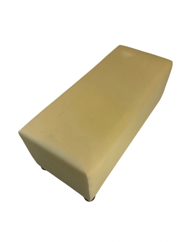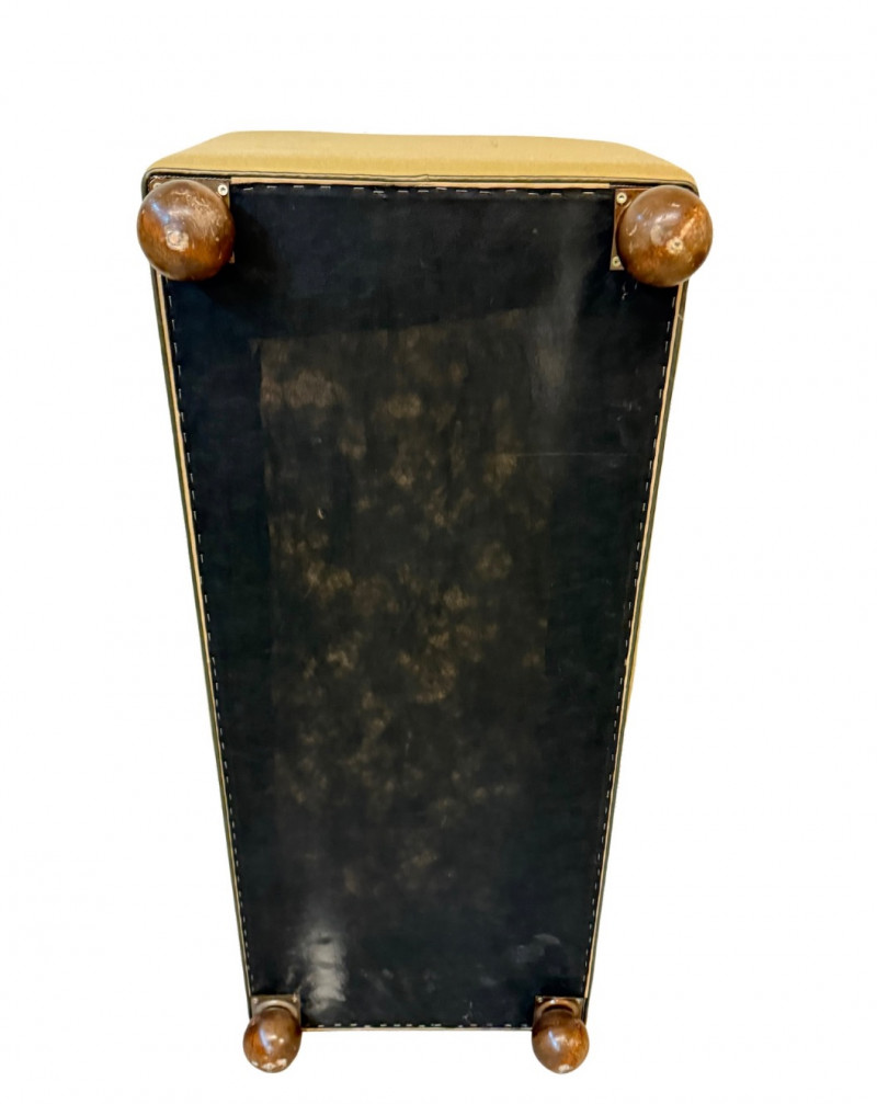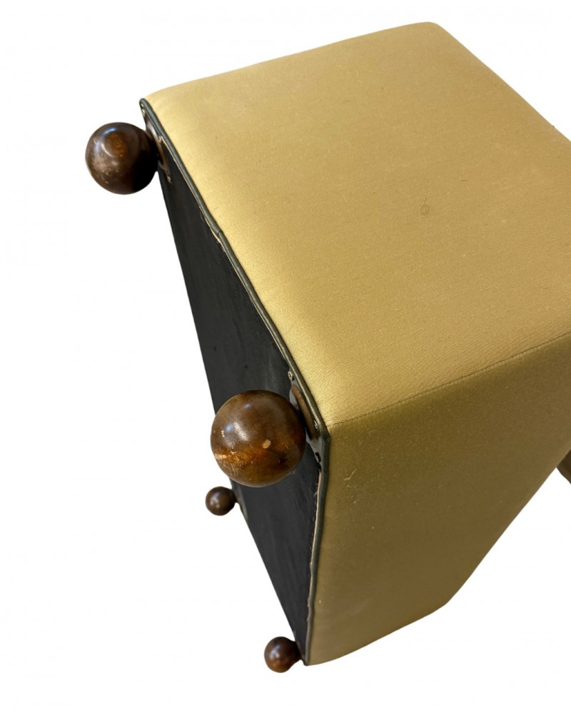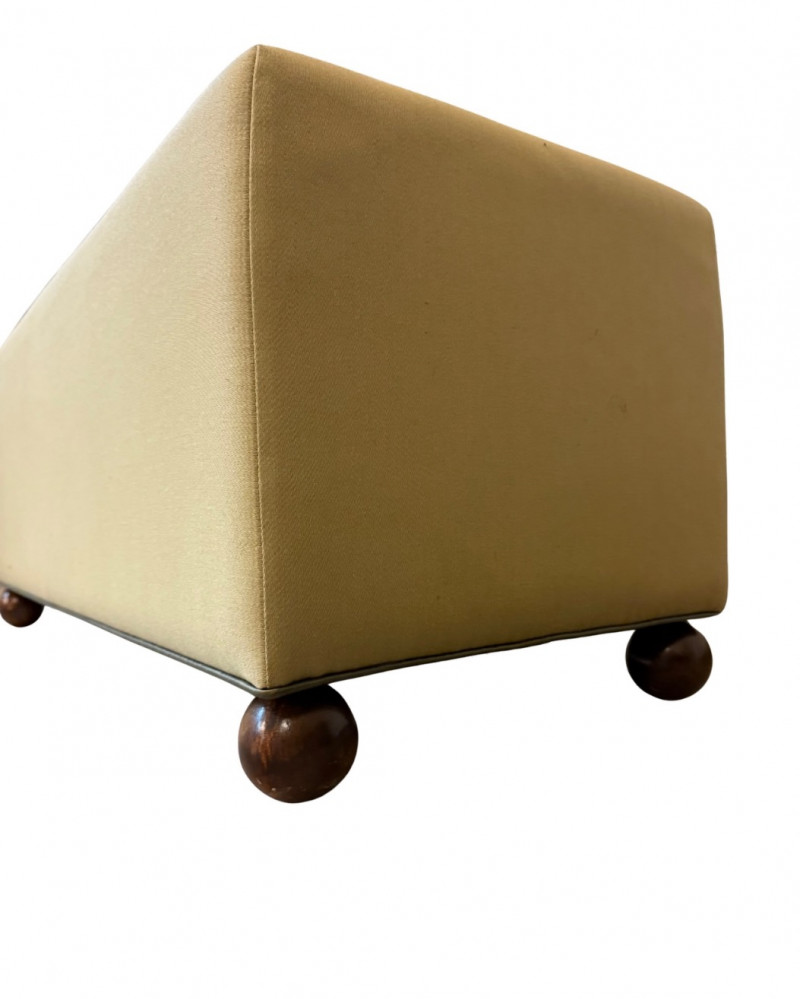Charming mid-century modern ottoman featuring smooth olive-gold upholstery and distinctive rounded wooden ball feet. The clean cube form and playful base give this piece a sculptural yet functional presence — perfect as a footrest, accent seat, or low side table. Crafted with solid construction and timeless simplicity, the ottoman’s soft neutral tone pairs easily with both warm wood interiors and modern minimalist décor. Era: Mid-Century Modern, c. 1960s–1970s