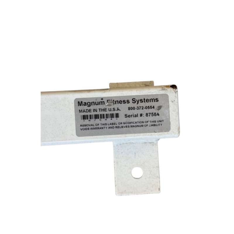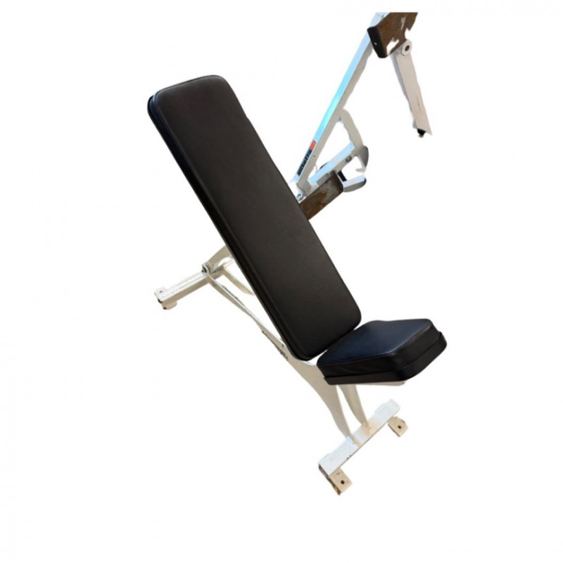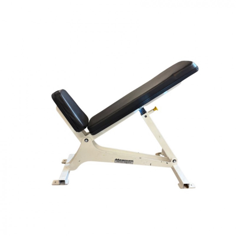 Sturdy Magnum Fitness Systems adjustable weight bench, built for commercial gym environments and heavy use. The bench features a solid steel frame with multiple incline positions, durable black vinyl upholstery, and a white powder-coated finish. Ideal for dumbbell or barbell training, core work, and upper body exercises. Excellent stability and ergonomic padding for comfort and support. Shows typical cosmetic wear consistent with use, but functions perfectly. Measurements: Brand: Condition: Estimated Value: