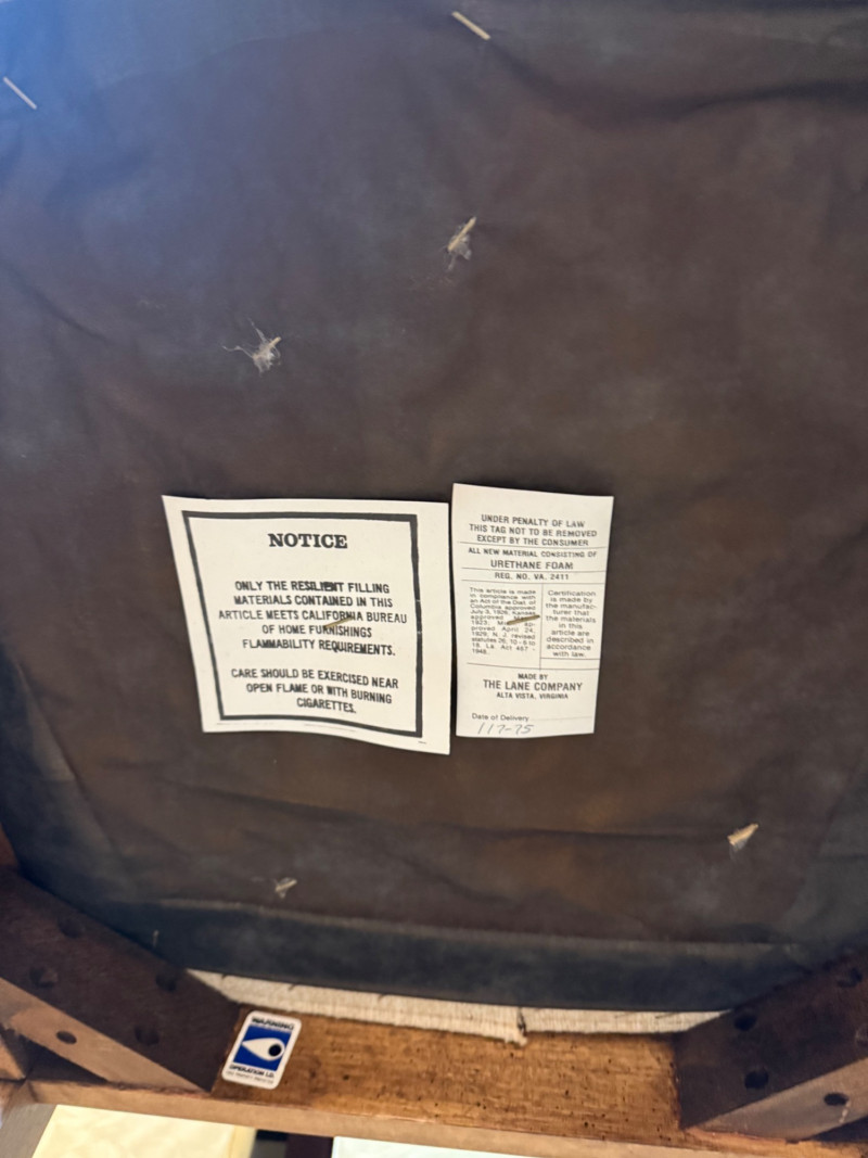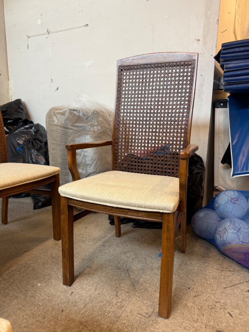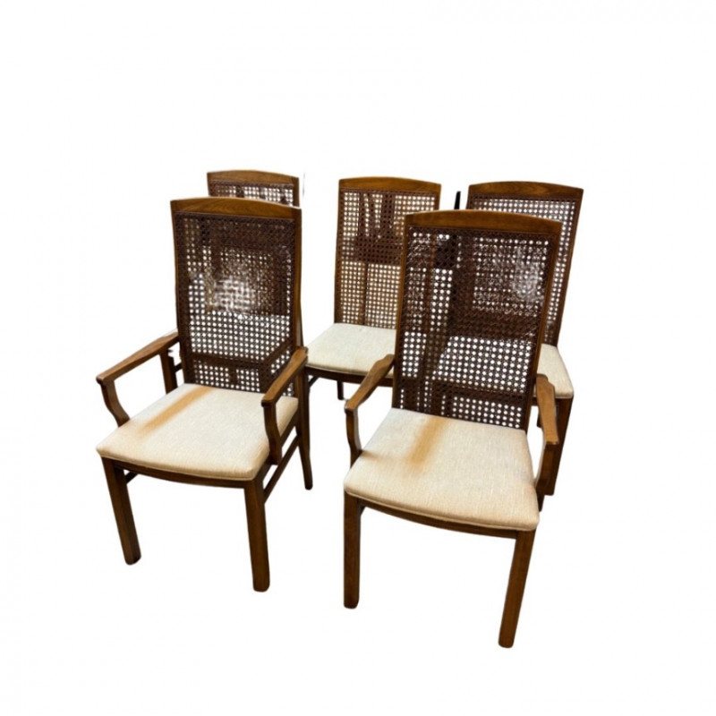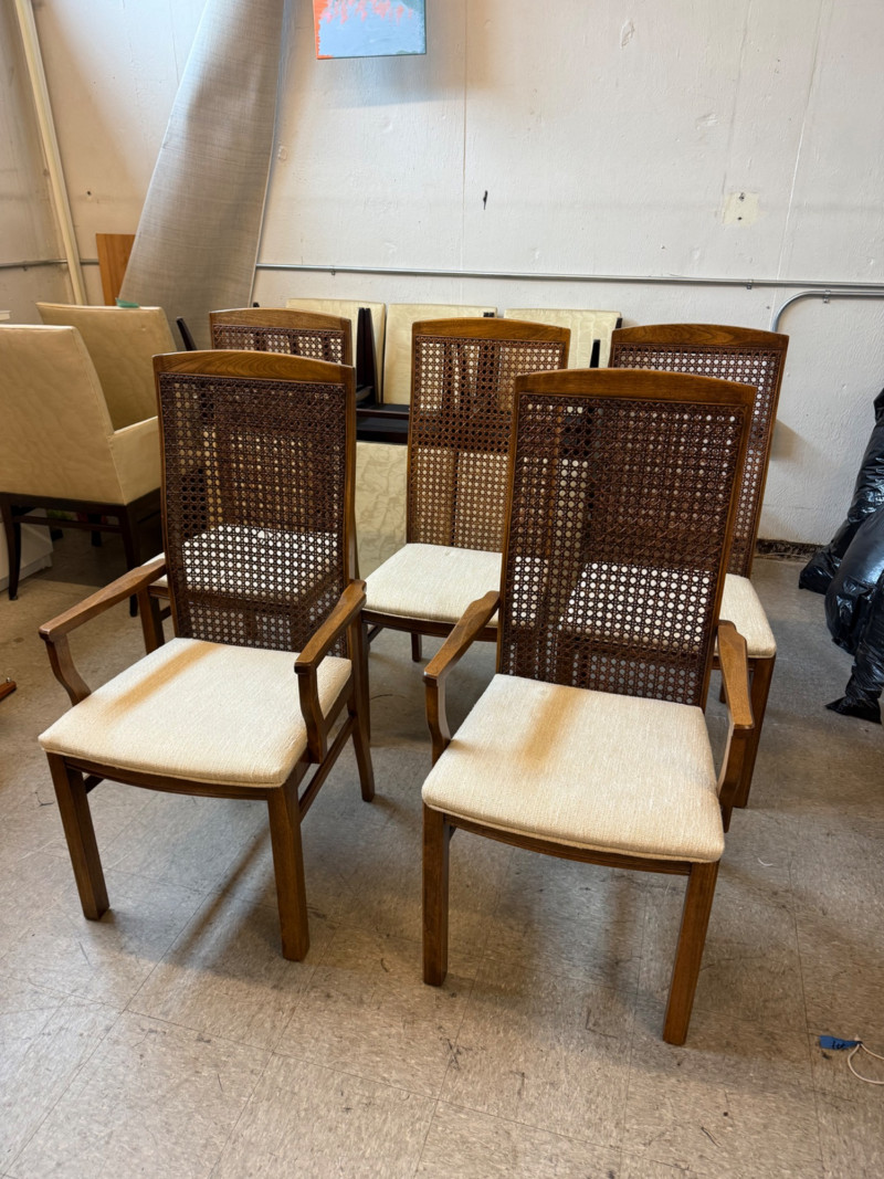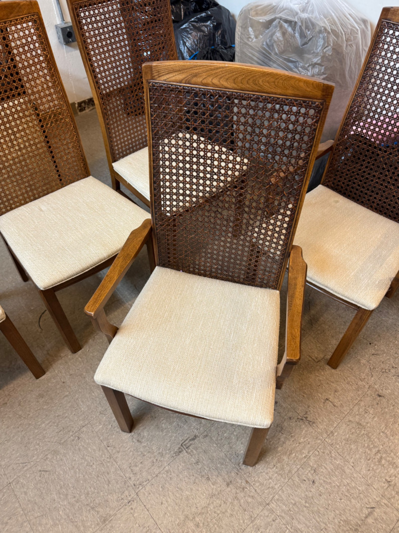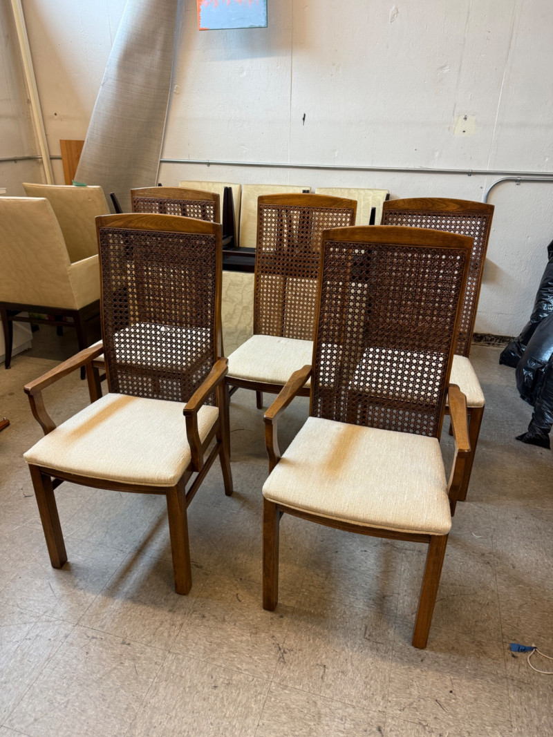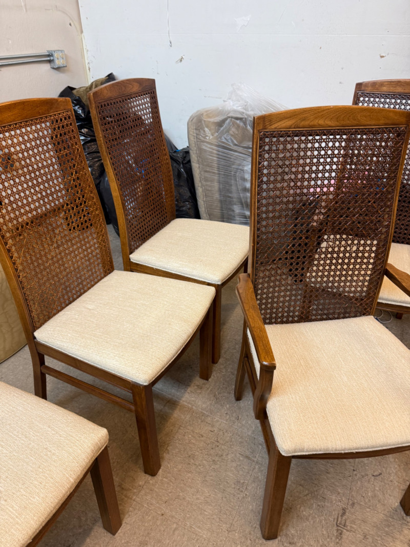 Description: Set includes 6 total chairs — 2 armchairs and 4 side chairs. Each piece retains the original Lane Company label and 1975 manufacturing date stamp. Condition: Measurements: Retail Value:Set of 6 Vintage Lane Company Dining Chairs — Cane Back with Upholstered Seats (1975)