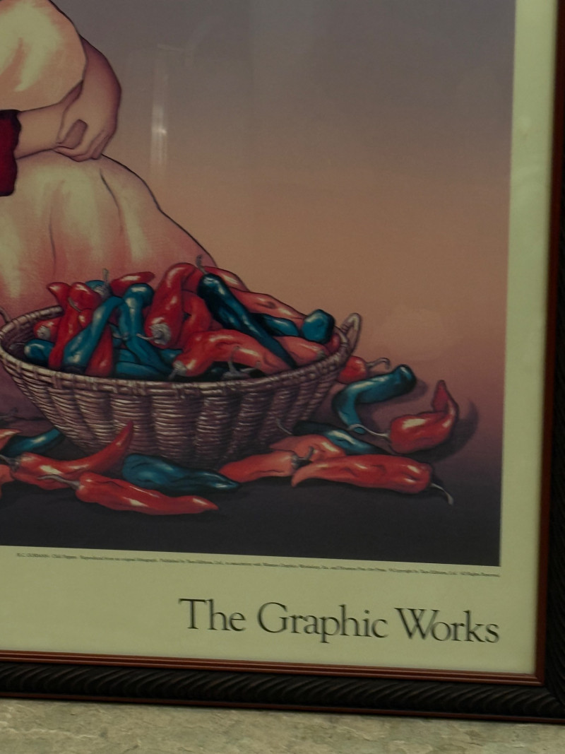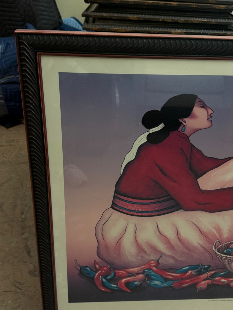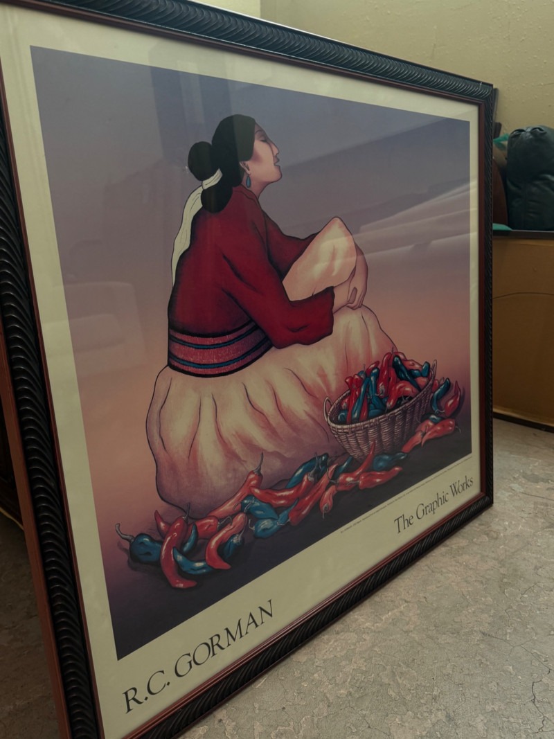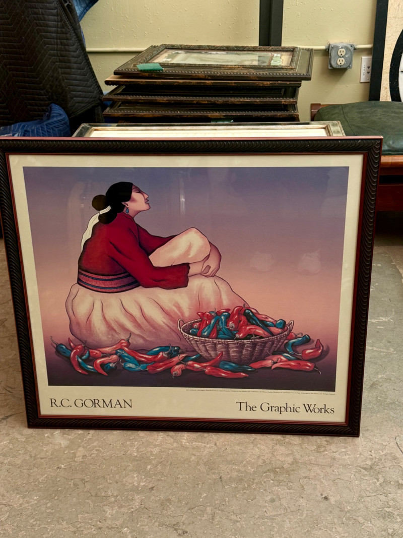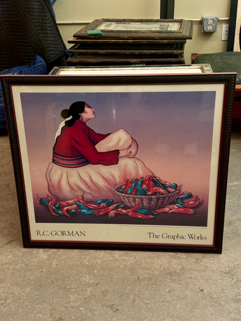 Vibrant framed exhibition poster featuring the work of renowned Navajo artist R.C. Gorman, titled “The Graphic Works.” This piece showcases Gorman’s signature style — elegant, contemplative female figures wrapped in traditional dress, surrounded by earthy tones and organic forms. The imagery reflects the artist’s deep connection to Native culture and the Southwest landscape.