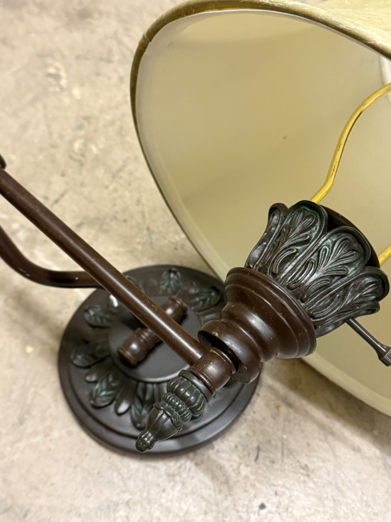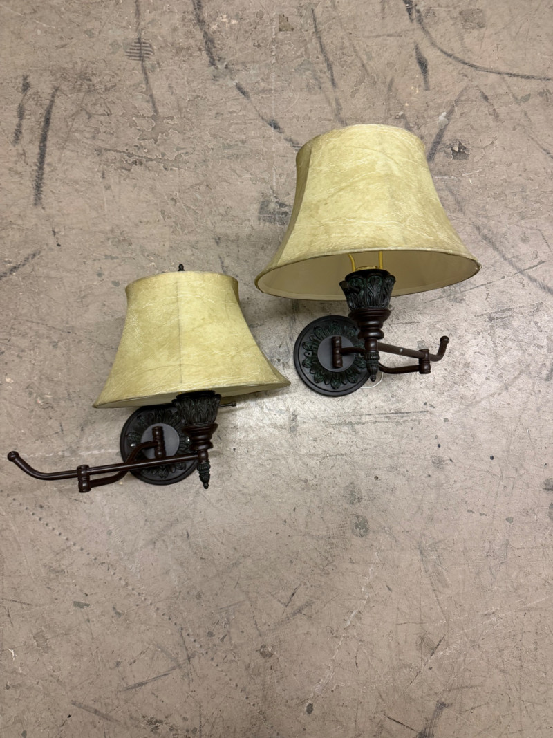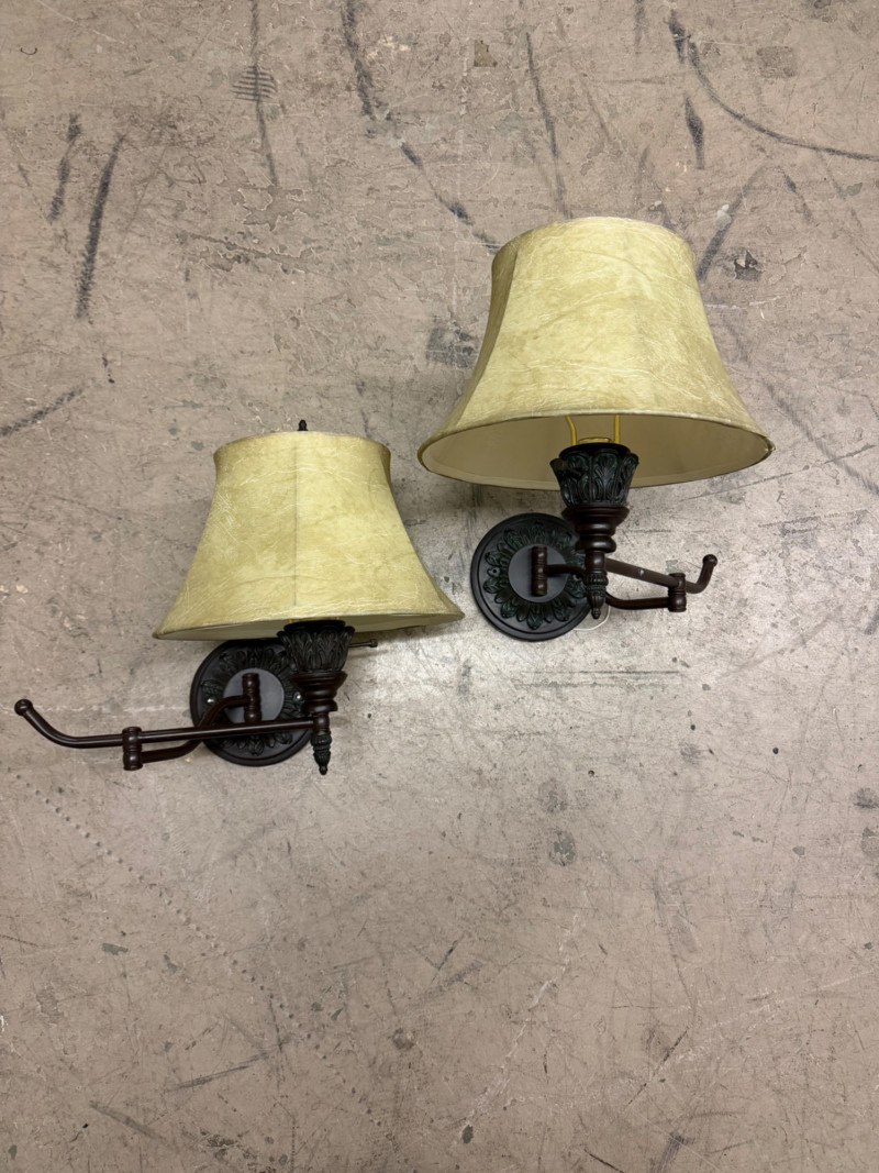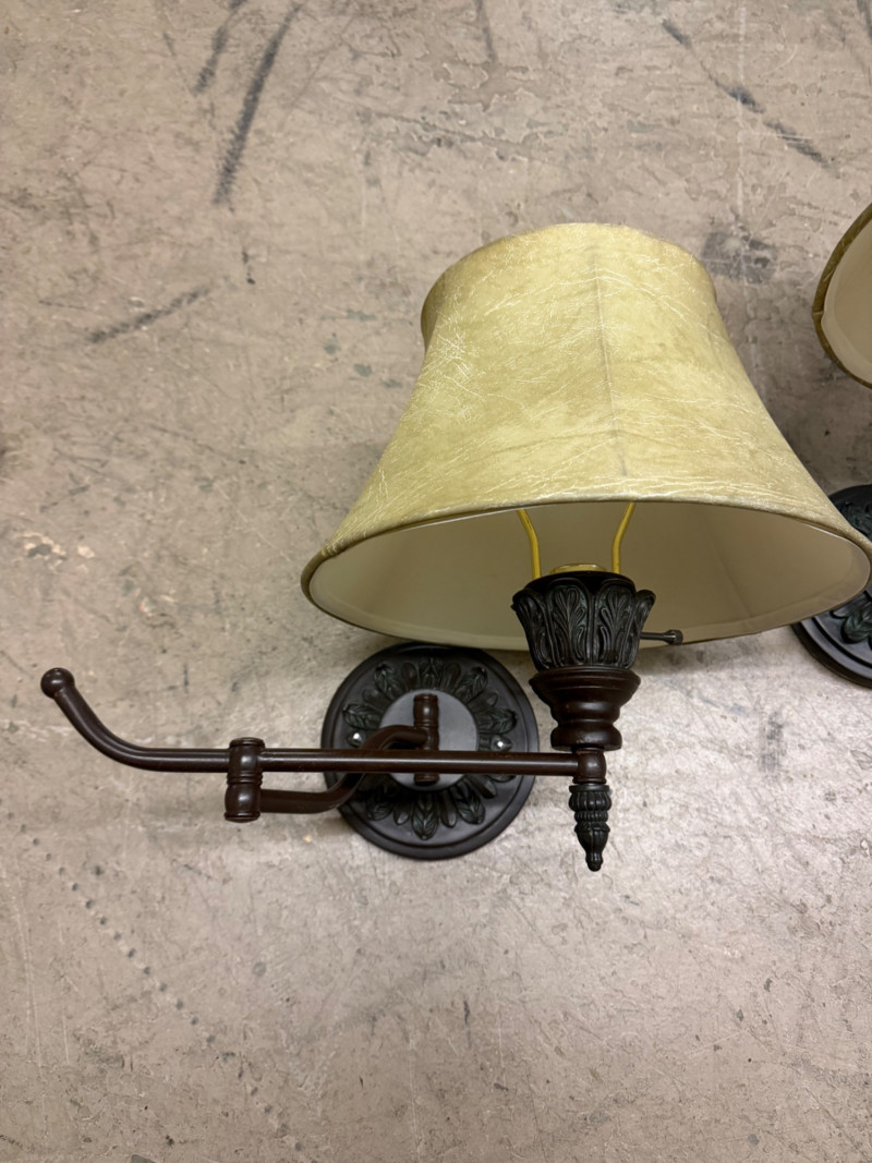 Elegant pair of vintage bronze wall sconces featuring detailed acanthus leaf accents, gently flared fabric shades, and swing-arm extensions. Each sconce offers warm, ambient light with classic traditional charm — perfect for bedroom, hallway, or living room settings. The soft parchment-style shades complement the dark bronze finish beautifully, creating a timeless and refined look. Condition: Measurements: Retail Value: