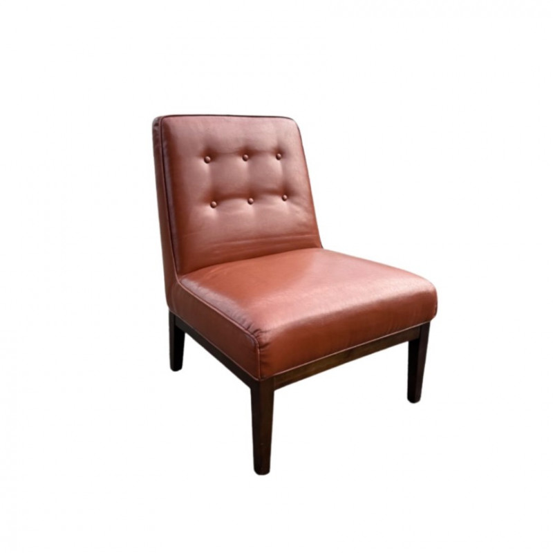 Handsome mid-century inspired leather slipper chair featuring rich burnt cognac brown upholstery with button-tufted backrest and dark wood legs. The clean, low-profile silhouette makes it ideal for a reading nook, office, or lounge space. Crafted with quality faux leather for easy maintenance and timeless appeal. Its minimalist frame pairs beautifully with both vintage and modern interiors. Measurements: Condition: