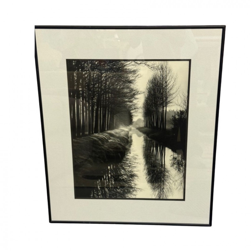 Description: Printed on high-quality photographic paper and professionally framed with a neutral mat and black gallery frame. A timeless addition for collectors of fine art photography or modernist design. Condition: Measurements: Retail Value:Brett Weston “Trees and Canal, Holland” — Framed Black and White Photograph