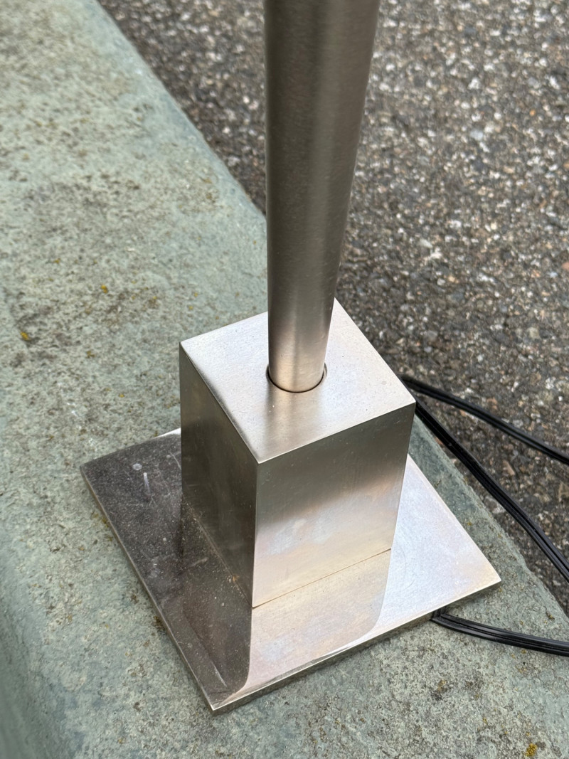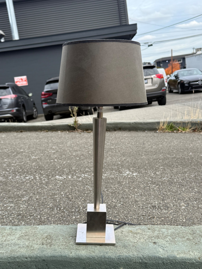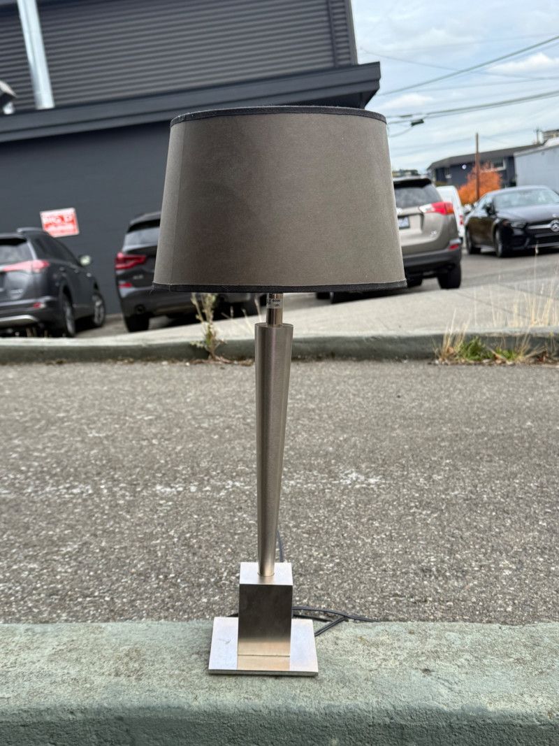 Description: A high-end piece known for its craftsmanship and timeless silhouette, the Swedge lamp adds understated sophistication to any space, whether used on a desk, console, or bedside. Measurements: Condition: Retail Value:R Hughes “Swedge” Table Lamp — Modern Brushed Nickel Finish with Black Shade