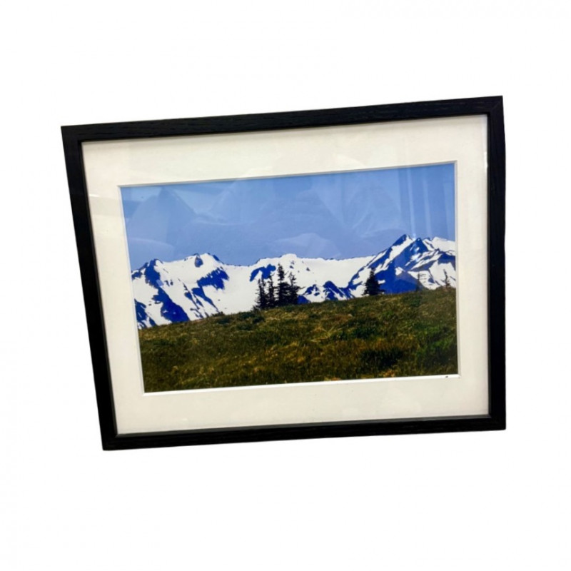 Striking color photograph capturing the snow-capped Olympic Mountains under a vivid blue sky, viewed across an alpine meadow. Framed under glass with a clean modern presentation. Details: Subject: Olympic Mountain Range, Washington State Medium: Color photographic print on glossy paper Frame: Contemporary black wood frame with white mat Era: Late 20th century / early 2000s (unsigned) Condition: Excellent — print is crisp and color-saturated; minor wear to frame corners consistent with age. Dimensions (approx.): 14” W × 11” H (framed) Historical Note:Framed Landscape Photograph — Olympic Mountains, Washington