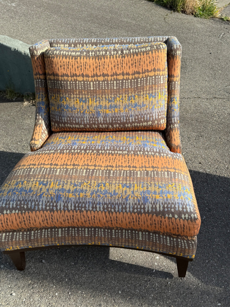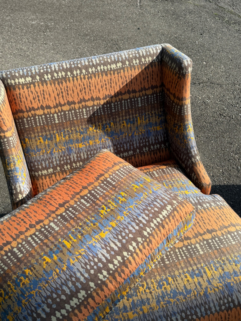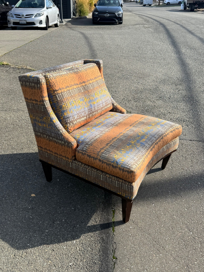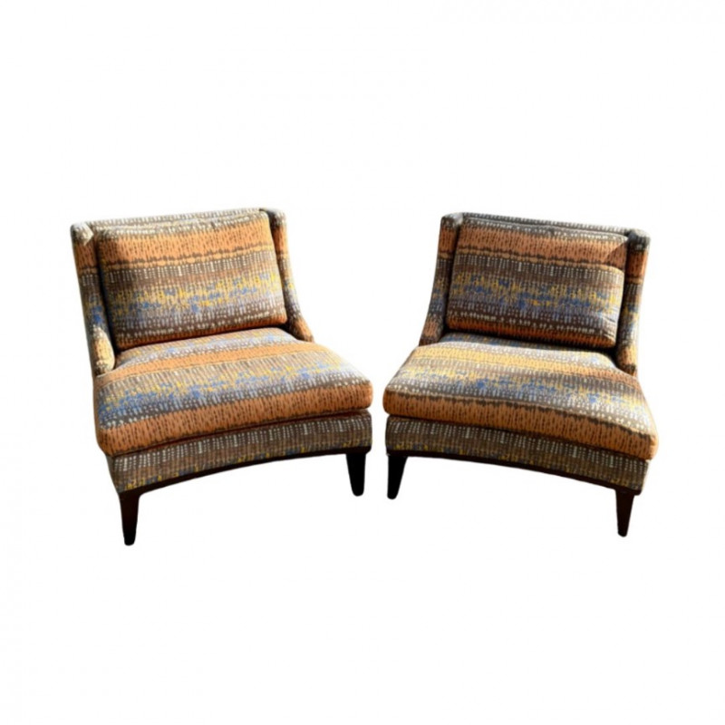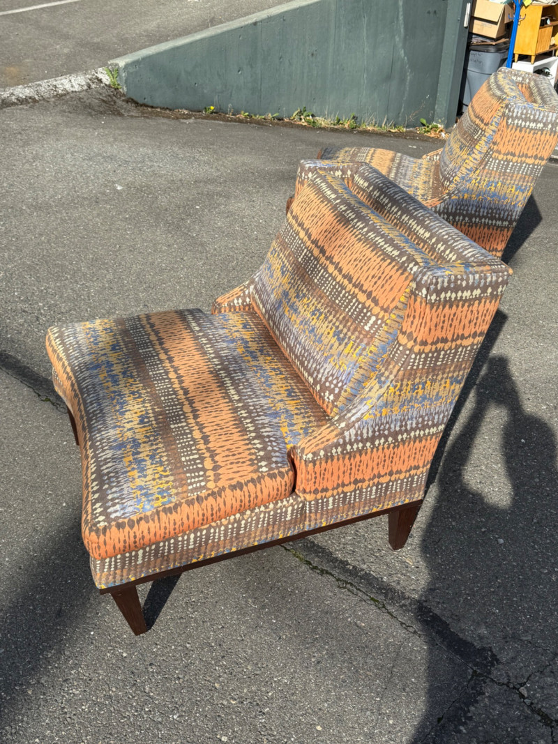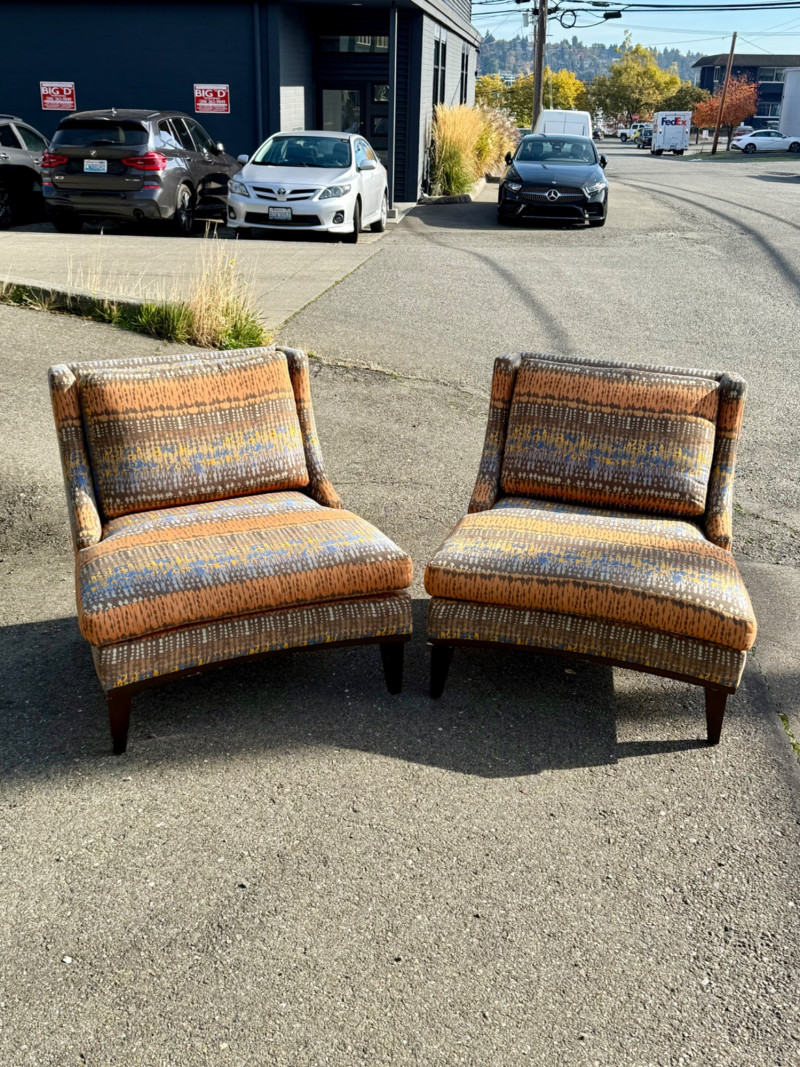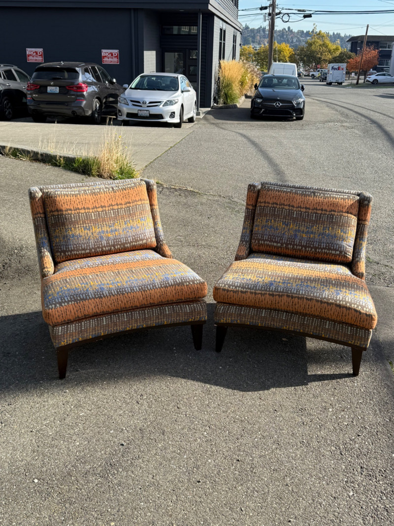 Sophisticated pair of Burton James armless slipper chairs, featuring sculptural low profiles and tapered wood legs. Upholstered in a woven multitone fabric of burnt orange, taupe, and slate blue with a textured jacquard finish — a perfect blend of retro and contemporary design. Historical Note: Made in the USA. Excellent structural condition with minor expected wear to fabric consistent with age and light use. Approx. 31” H × 28” W × 32” D Estimated Value: $1,200–$1,800 (pair retail new $3,000+)Pair of Burton James Mid-Century Modern Slipper Chairs — Handcrafted in the USA