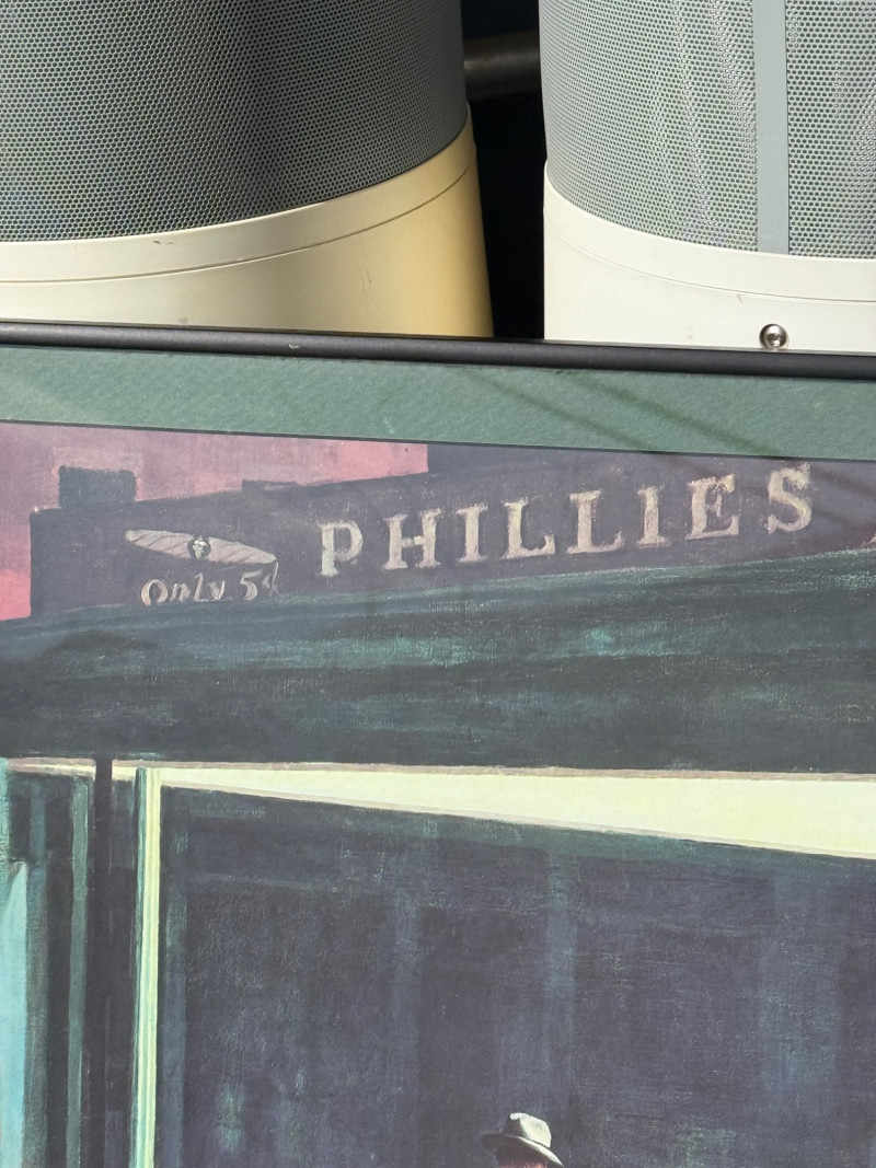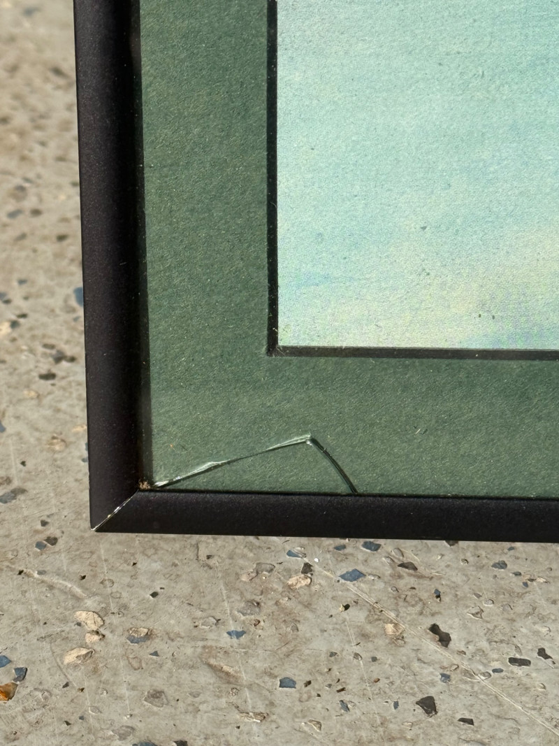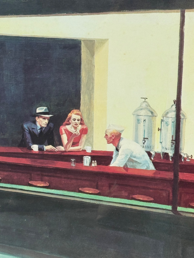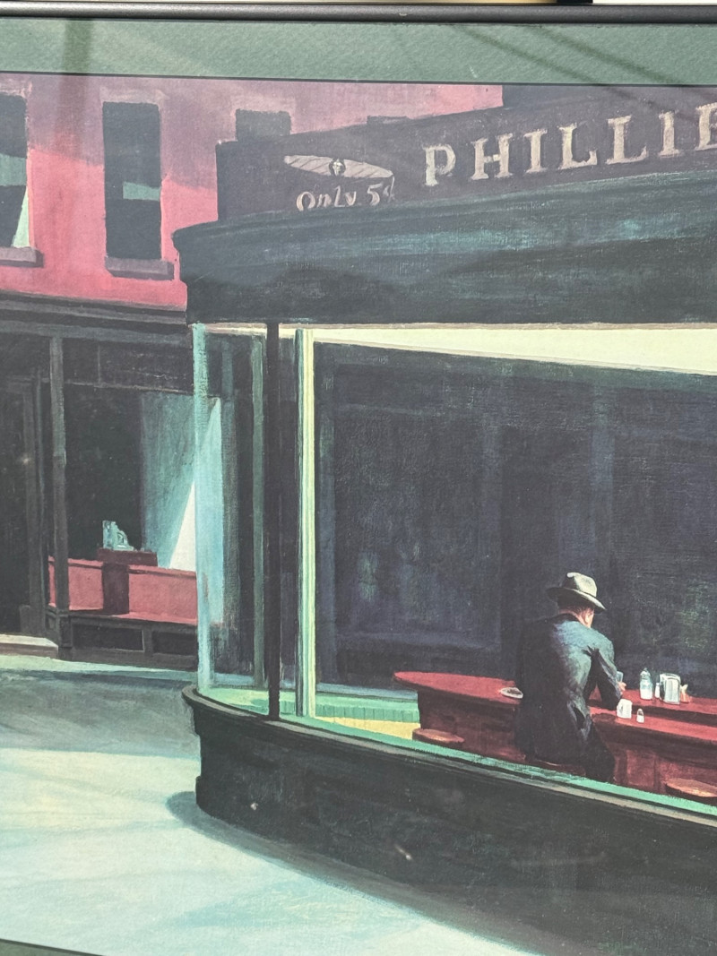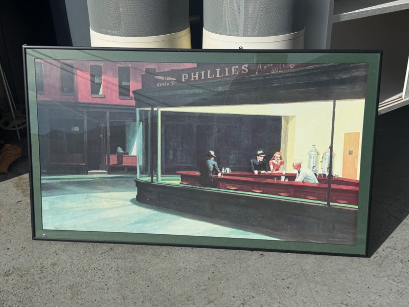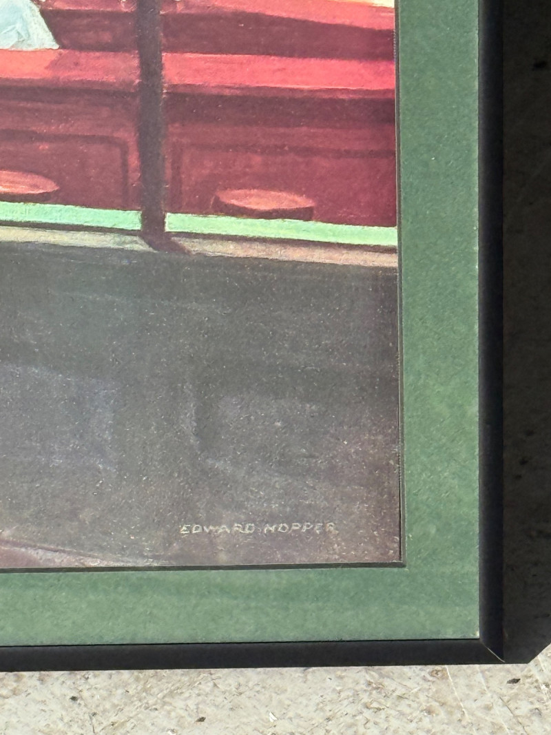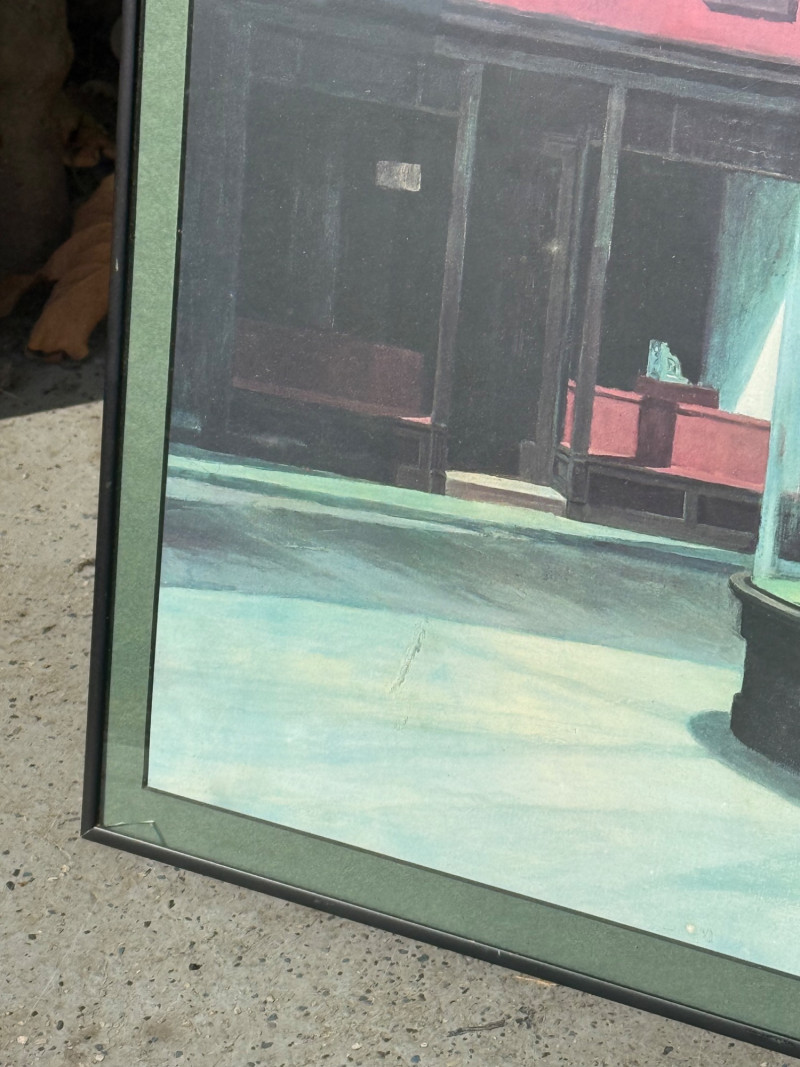 Large framed print of Edward Hopper’s “Nighthawks,” originally painted in 1942 and now held in the Art Institute of Chicago. This iconic image captures the quiet isolation of urban nightlife — a luminous diner scene that has become a cornerstone of American art and pop culture. Details: Artist: Edward Hopper (American, 1882–1967) Title: “Nighthawks” (reproduction print) Medium: Lithographic print on paper Frame: Slim black metal with green matting under glass Condition: Excellent vintage condition; minimal surface wear; vibrant color retention. Small glass crack on bottom left-see photos Era: Likely 1980s–1990s reproduction Dimensions (approx.): 36” W × 24” H (framed) Historical Note:Framed Print — Edward Hopper “Nighthawks” (1942) — Classic American Realism