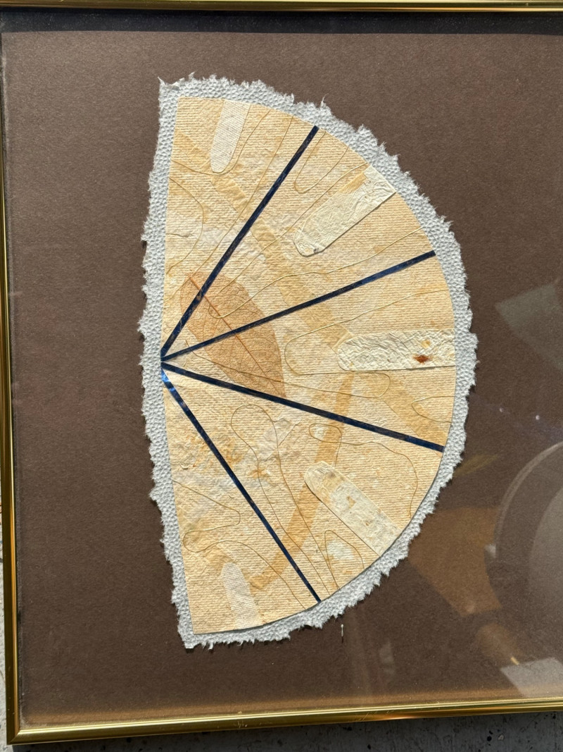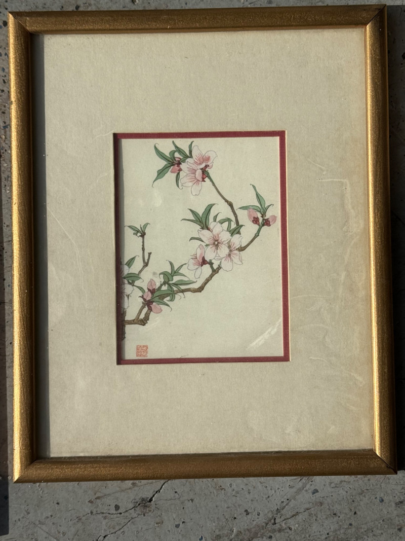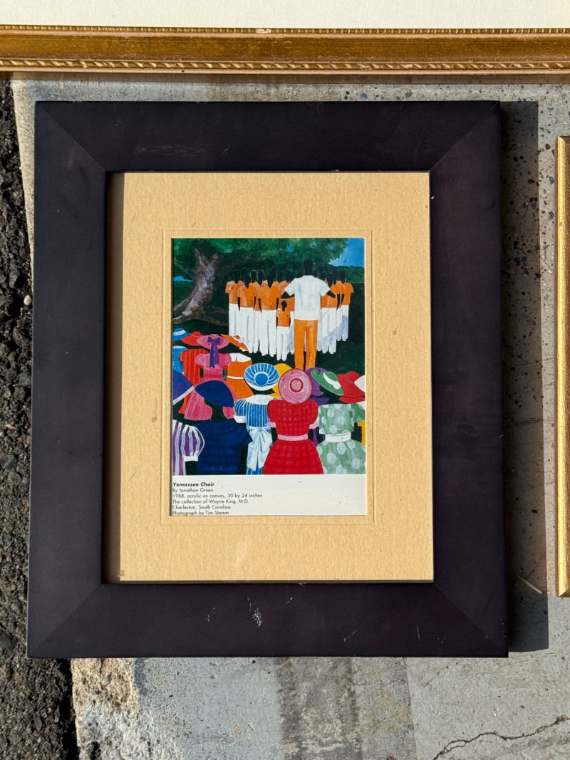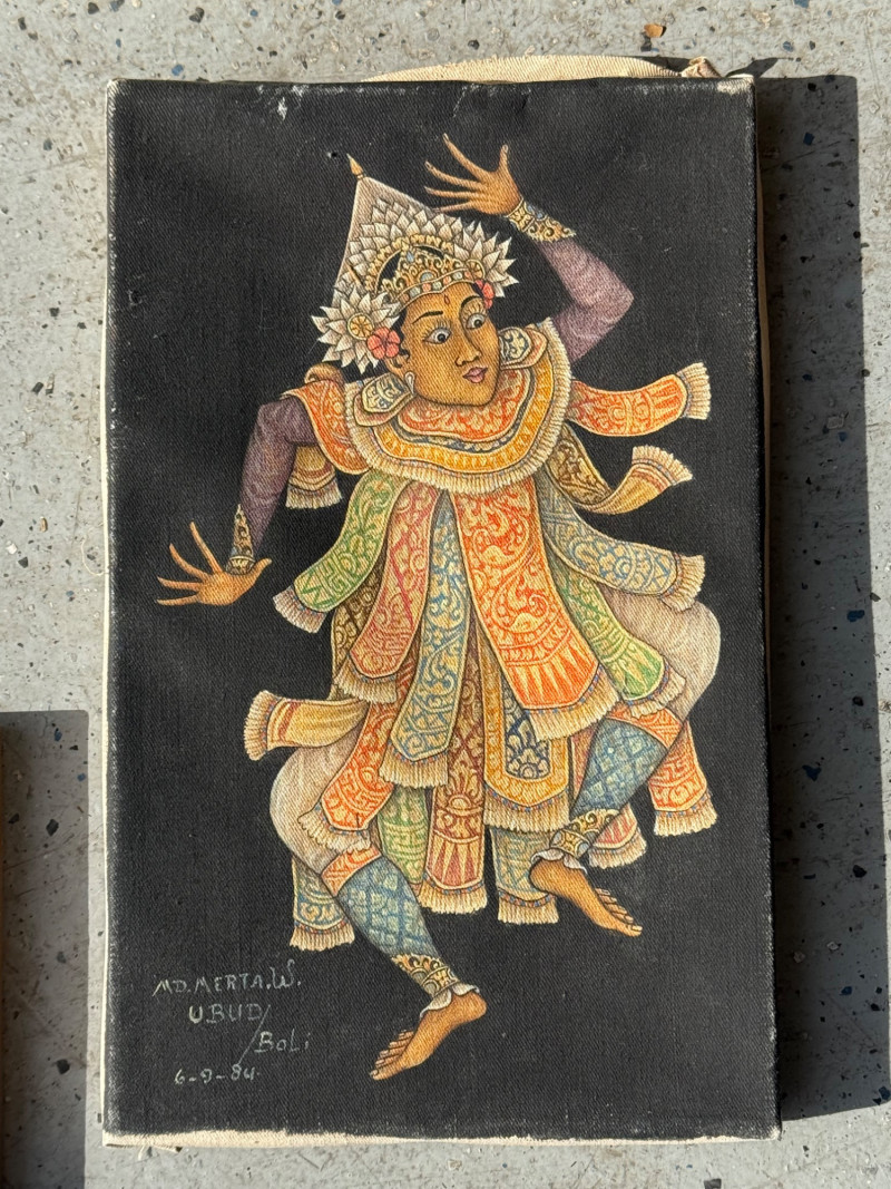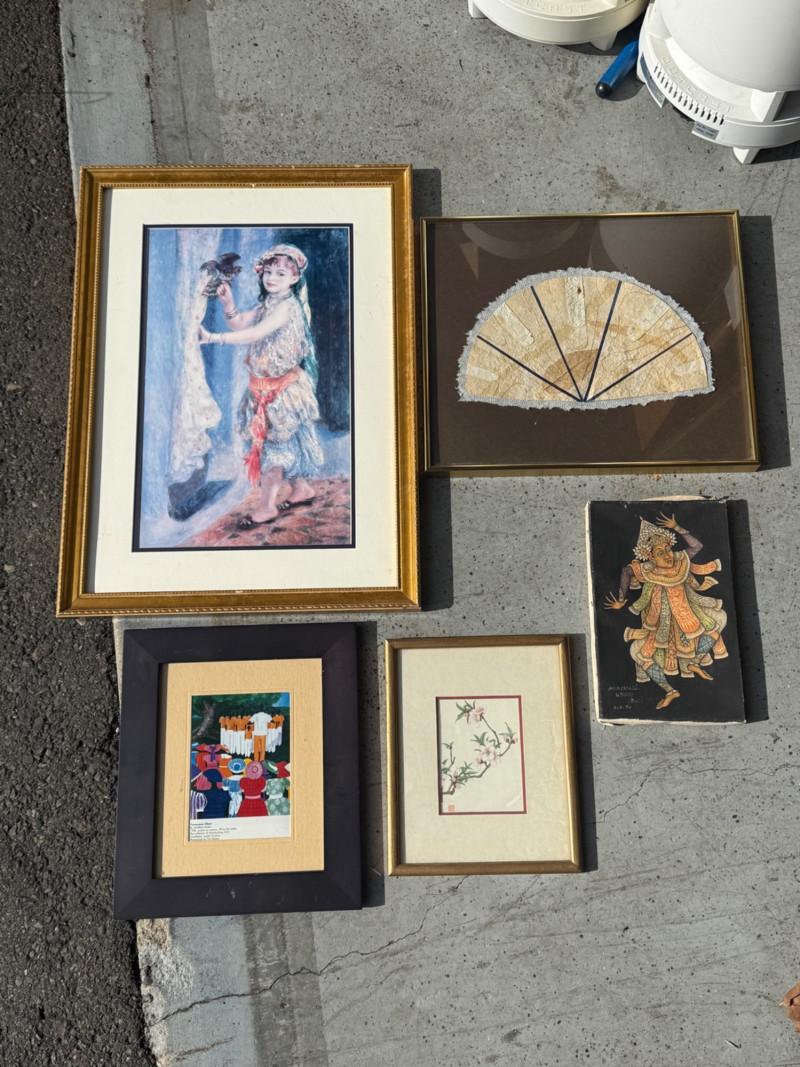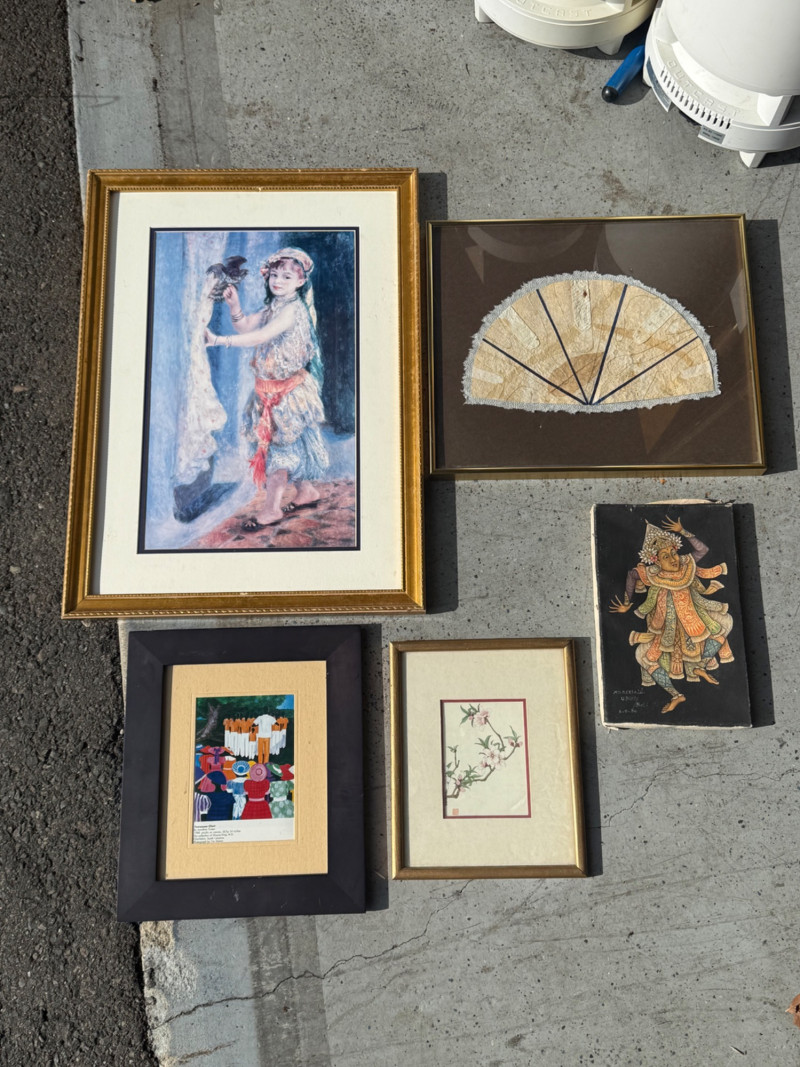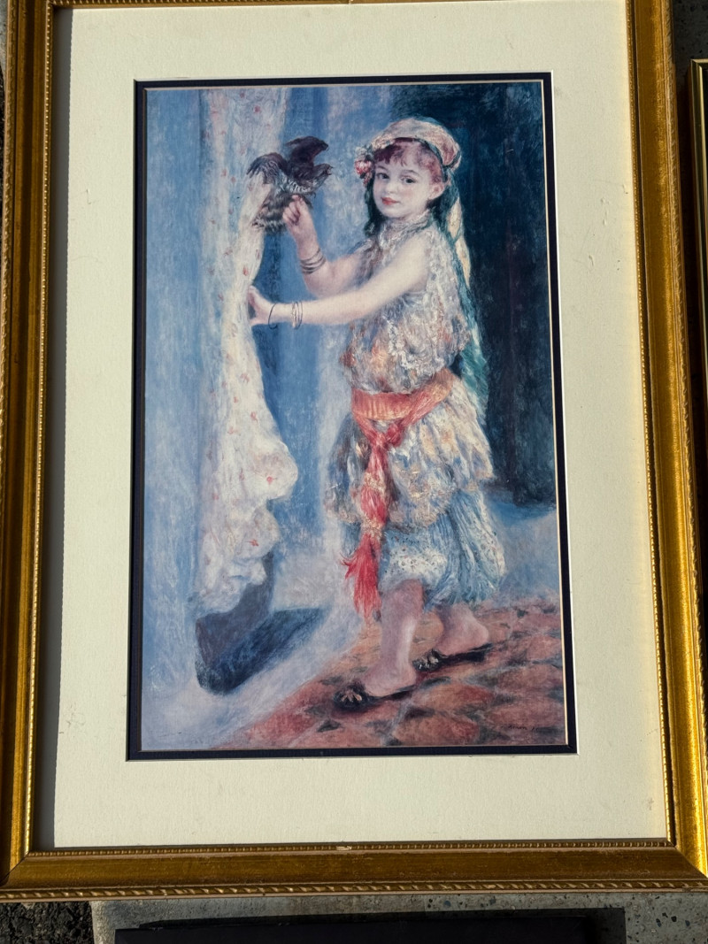 Curated set of five framed artworks spanning styles from European Impressionist reproductions to Asian and African-inspired folk art and textile-based pieces. A unique and colorful assortment ideal for gallery wall arrangements or collectors of multicultural art. Includes: Large gold-framed print of a young girl with bird — likely after Pierre-Auguste Renoir, impressionist reproduction. Framed textured paper fan artwork — handmade mixed-media piece in gold and indigo tones. Framed miniature Asian floral painting — delicate ink and watercolor composition with calligraphy mark. Colorful modern print — depicting monks or villagers in procession, framed with broad black mat. Unframed Indian or Balinese-style figure illustration — hand-painted detail on black background, depicting a traditional dancer or deity. Details: Era: Mid-20th century to contemporary (varied) Mediums: Print, mixed-media, watercolor, and textile paper Frames: Mixed wood and metal in coordinating neutral tones Condition: Good overall — minor wear consistent with age; no major damage to prints or mats Dimensions: Range from 8” × 10” to 18” × 24” Historical Note:Collection of 5 Framed Global Art Prints and Mixed Media Works — Eclectic Cultural Decor