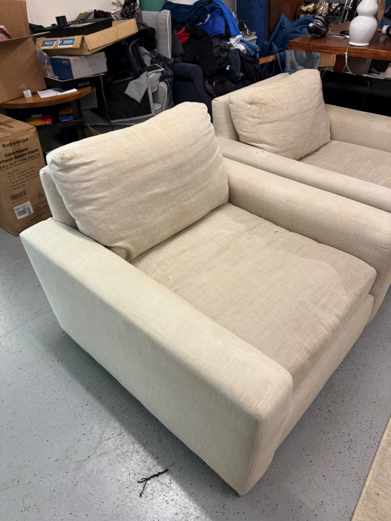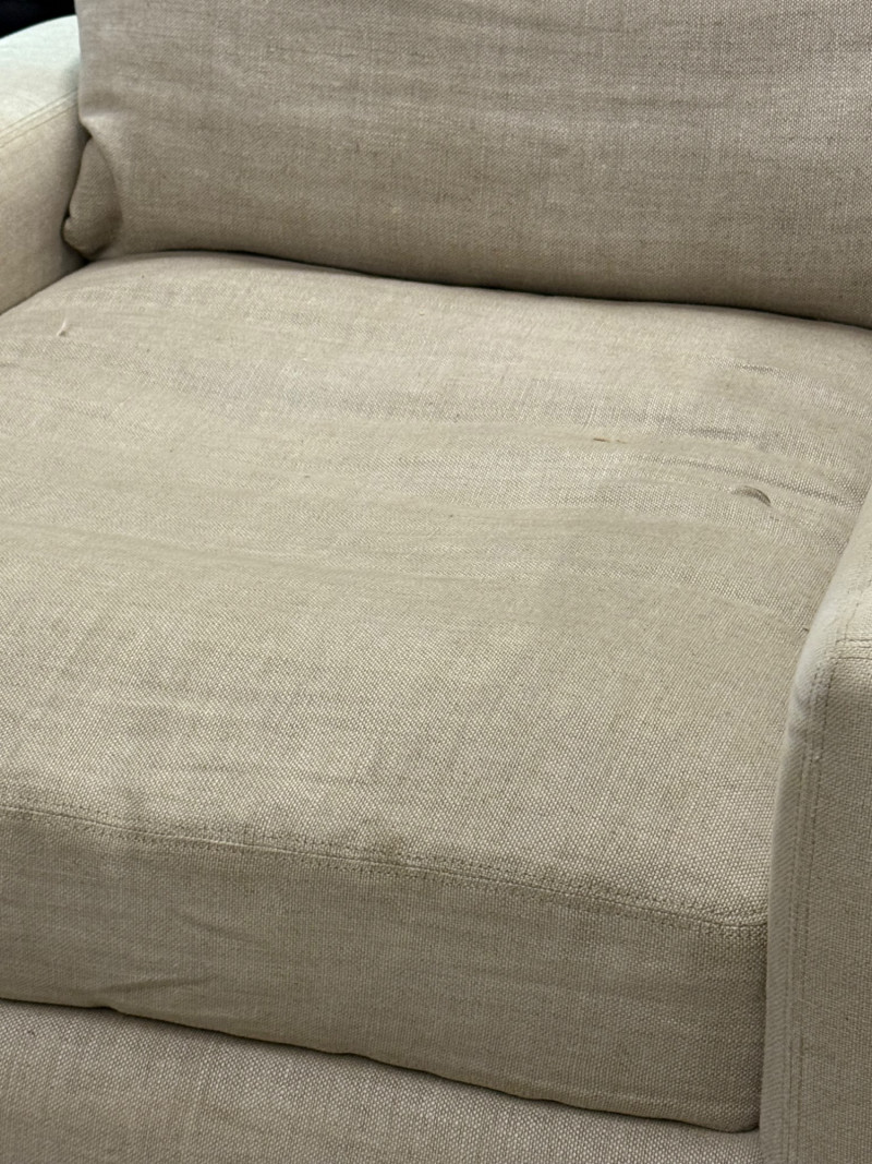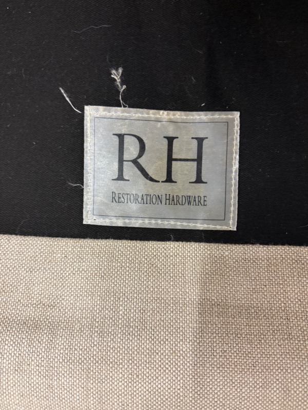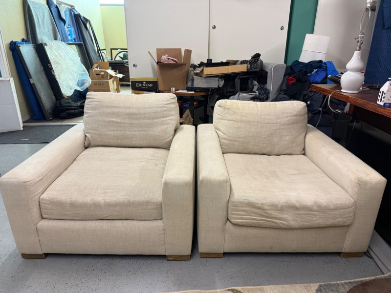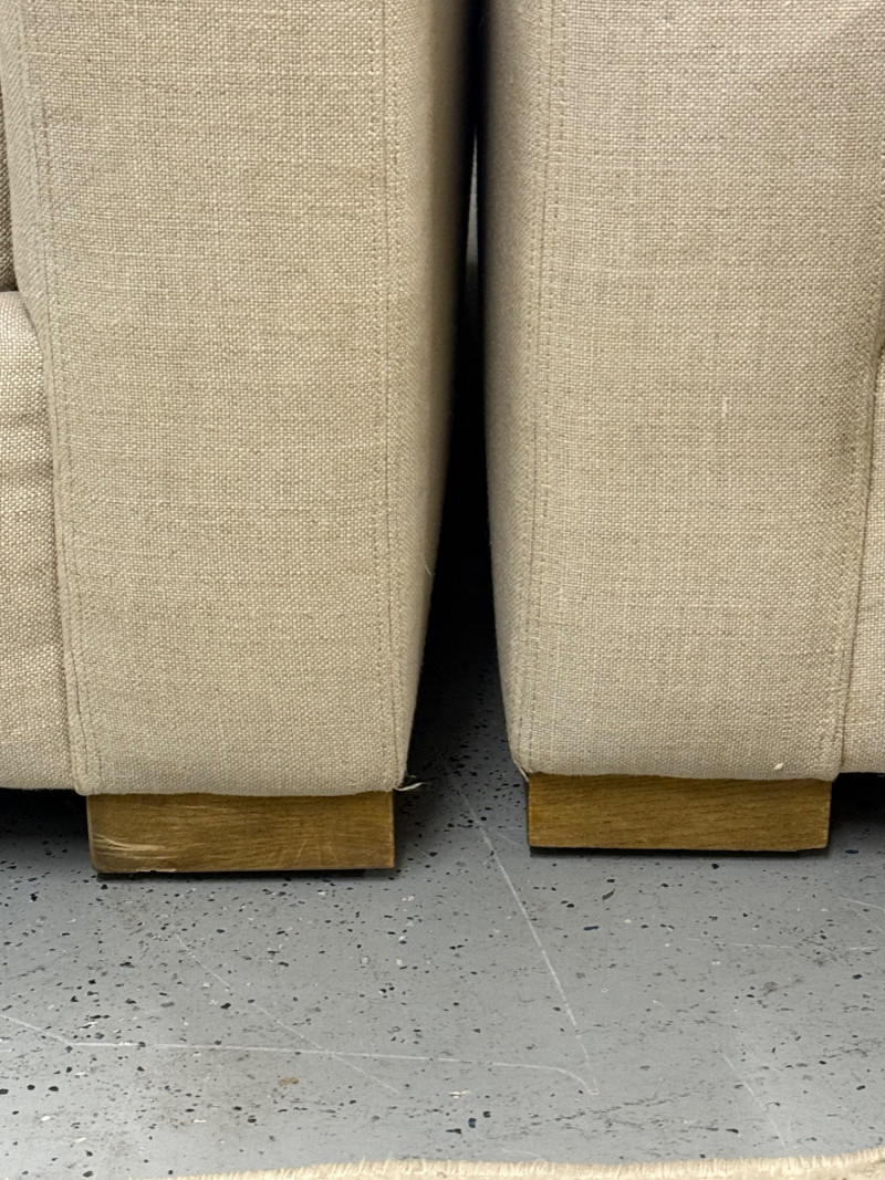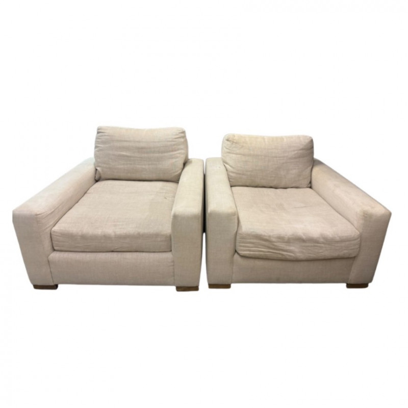 Beautiful matching pair of Restoration Hardware armchairs, featuring modern low-profile silhouettes with wide arms and deep seats. Upholstered in a Belgian linen-blend fabric in a neutral sand tone — soft, versatile, and perfect for both contemporary and classic interiors. Details: Brand: Restoration Hardware (RH tag present) Style: Modern / Contemporary Color: Sand / Natural linen Material: Belgian linen blend upholstery with feather-down cushions (per RH standard design) Condition: Structurally excellent; light surface wear and faint marks consistent with use (see photos) Dimensions: Approx. 38” W × 38” D × 30” H each Estimated Value: $1,200–$1,800 USD (pair) Notes:Restoration Hardware Upholstered Armchairs (Pair) — Belgian Linen Blend, Neutral Sand Tone