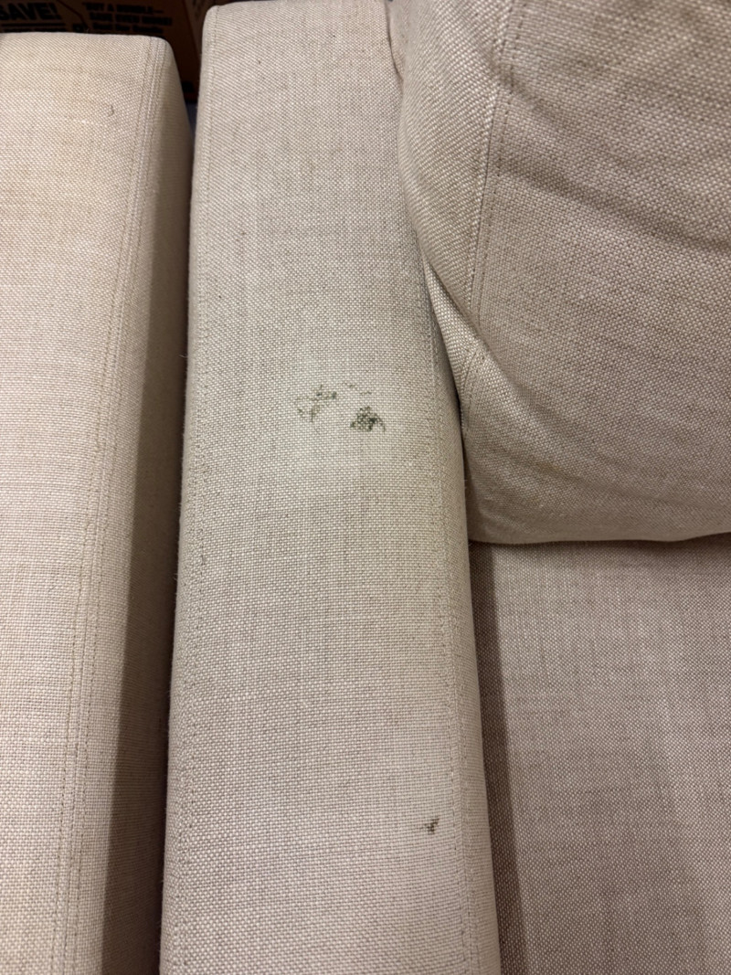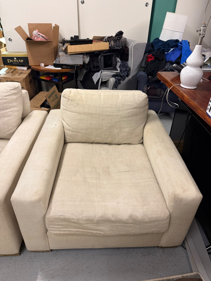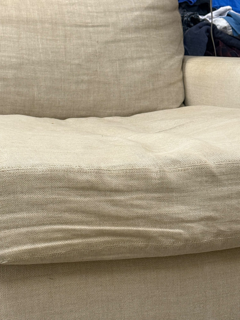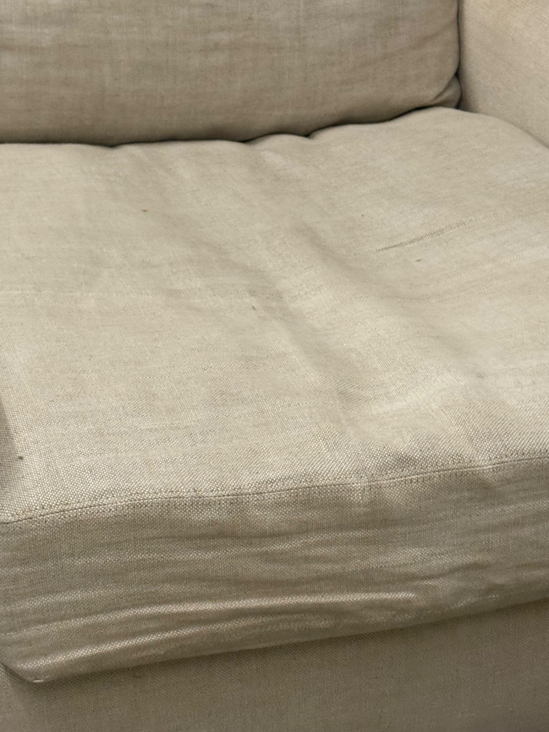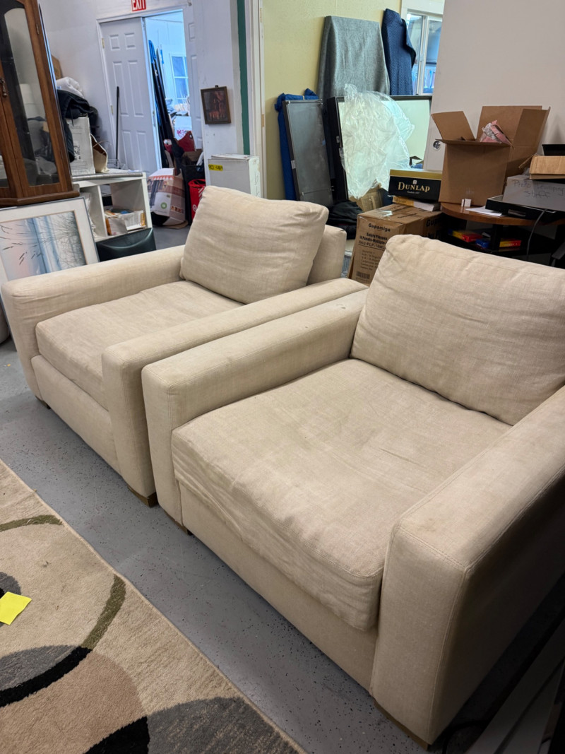 Beautiful matching pair of Restoration Hardware armchairs, featuring modern low-profile silhouettes with wide arms and deep seats. Upholstered in a Belgian linen-blend fabric in a neutral sand tone — soft, versatile, and perfect for both contemporary and classic interiors. Details: Brand: Restoration Hardware (RH tag present) Style: Modern / Contemporary Color: Sand / Natural linen Material: Belgian linen blend upholstery with feather-down cushions (per RH standard design) Condition: Structurally excellent; light surface wear and faint marks consistent with use (see photos) Dimensions: Approx. 38” W × 38” D × 30” H each Estimated Value: $1,200–$1,800 USD (pair) Notes:Restoration Hardware Upholstered Armchairs (Pair) — Belgian Linen Blend, Neutral Sand Tone