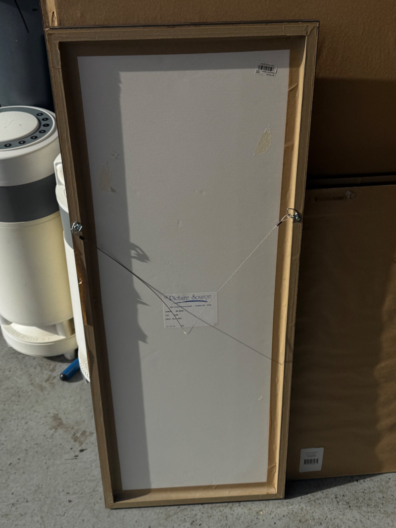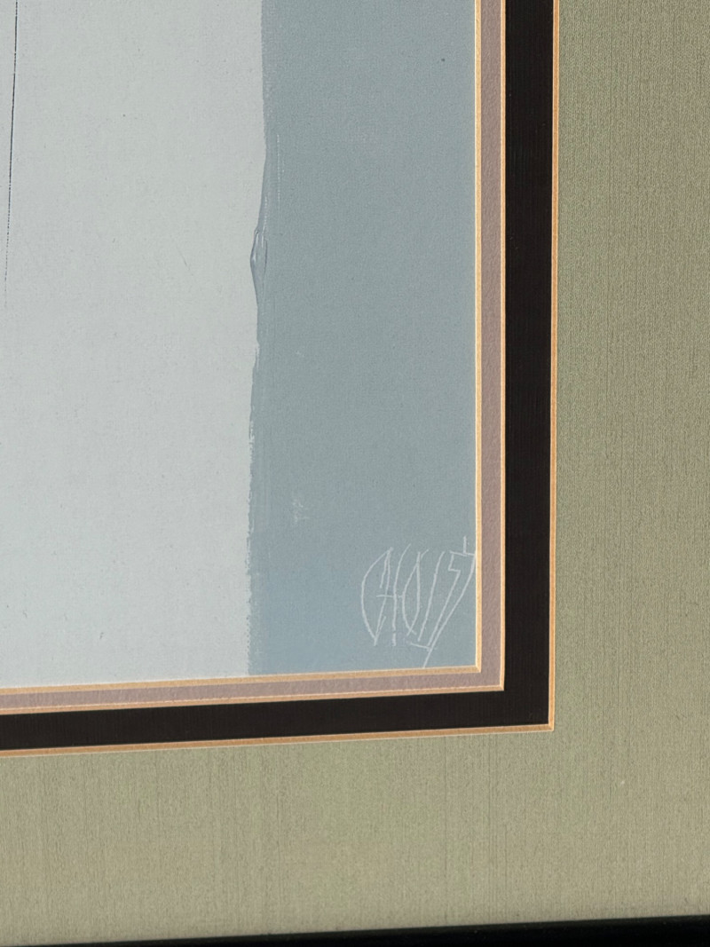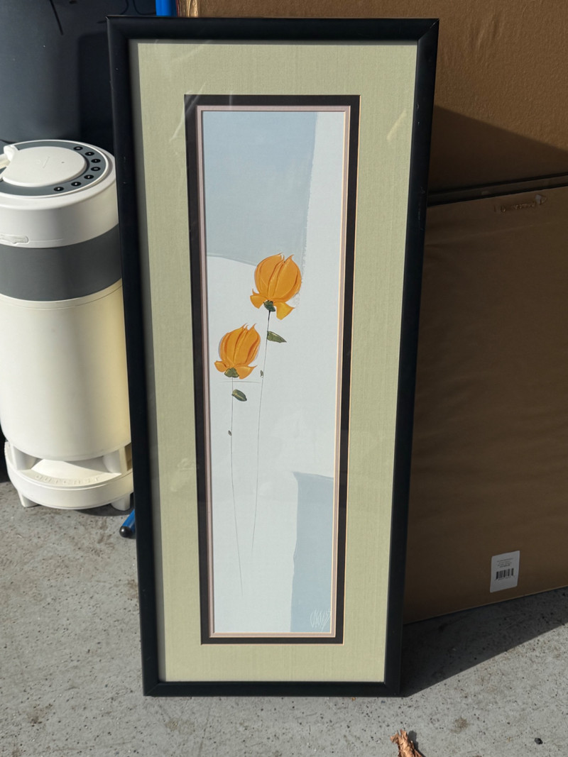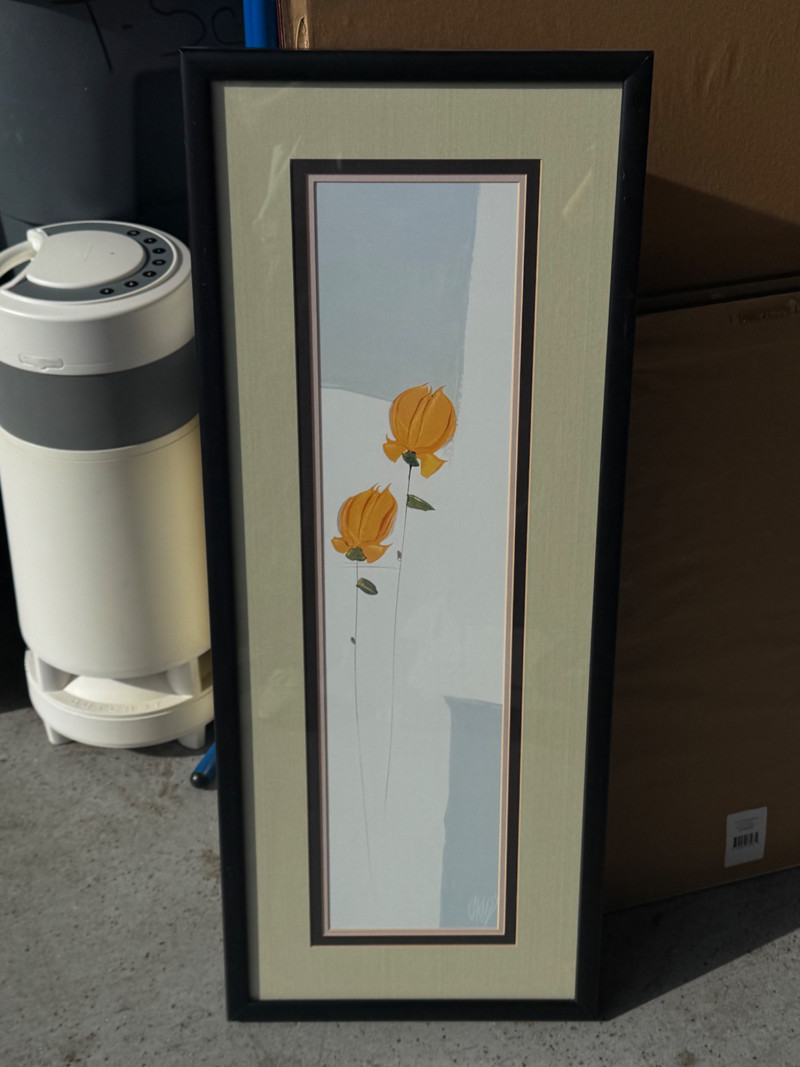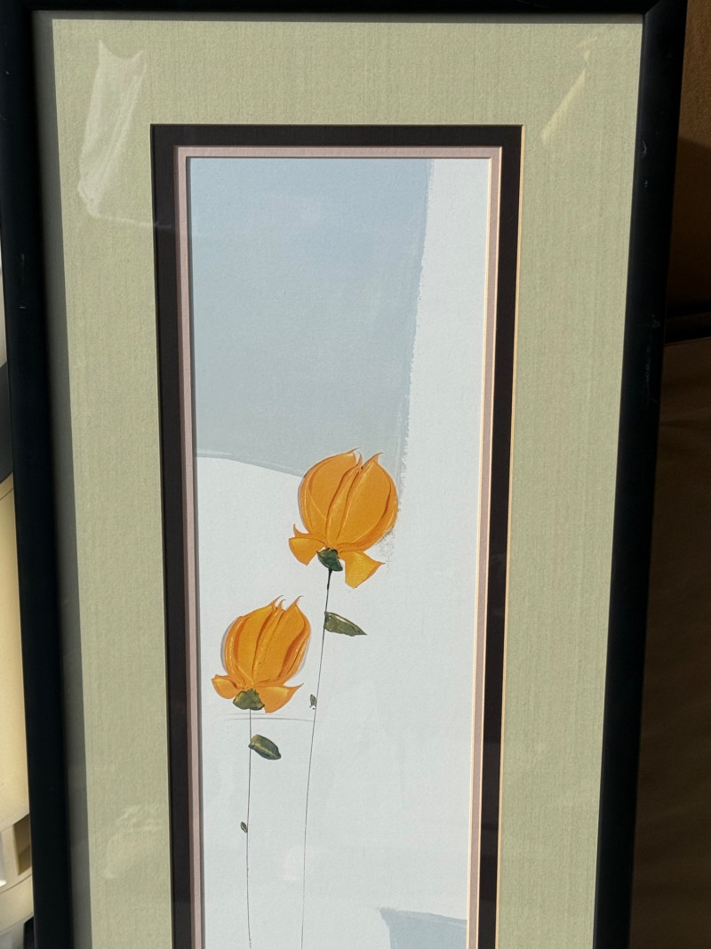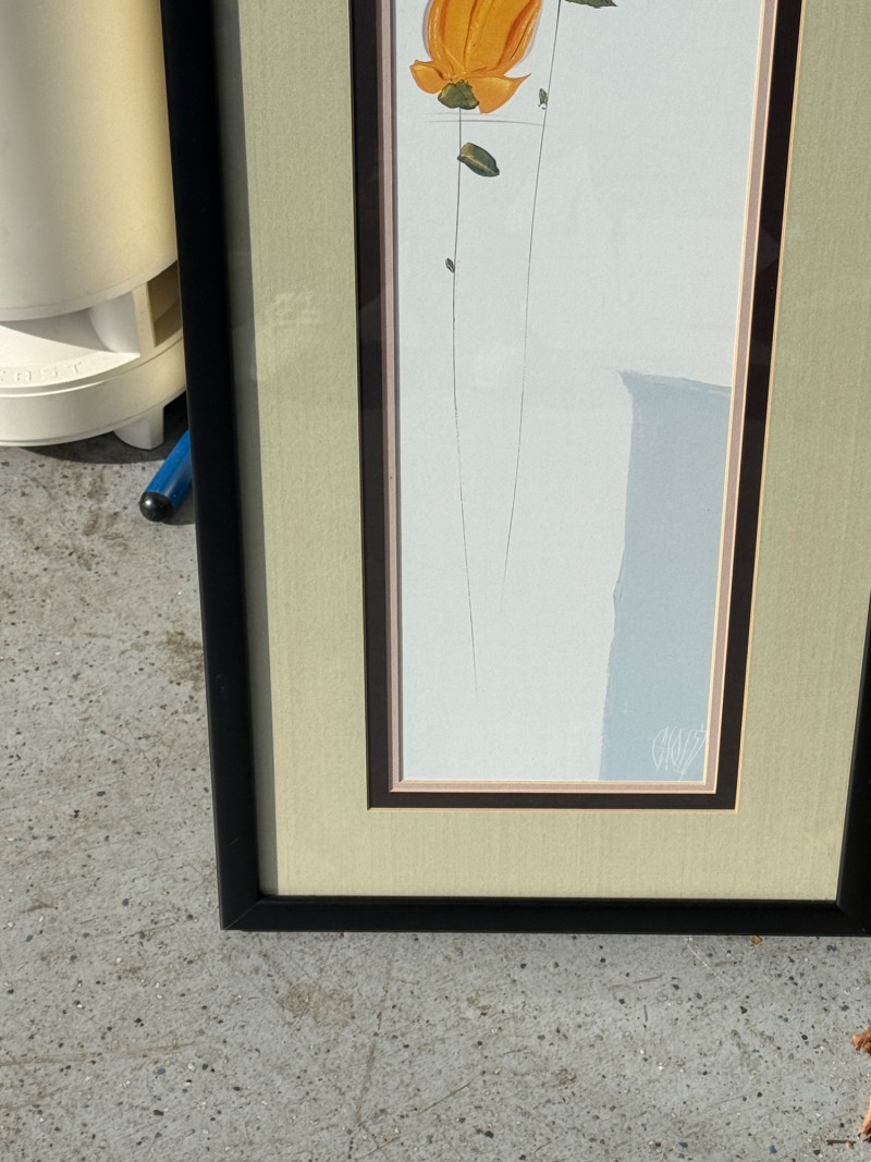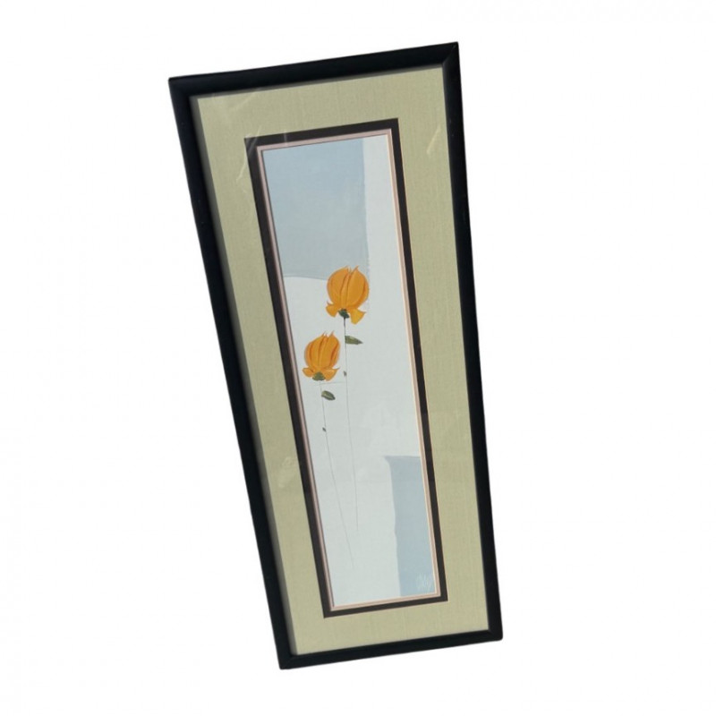 Elegant modern floral print by Cholt, featuring two stylized yellow tulips on slender stems against a soft abstract background in pale blue and white. The artist’s minimalist approach and refined use of color give the piece a tranquil, contemporary appeal — ideal for modern, Scandinavian, or transitional interiors. Details: Artist: Cholt (signed lower right) Medium: Print on paper Style: Minimalist / Modern Floral Frame: Black wood with double matting in sage and cream tones Condition: Excellent; ready to hang Dimensions (framed): Approx. 30” H × 12” W Historical Note:Framed Modern Floral Print by Cholt — Minimalist Yellow Tulip Composition