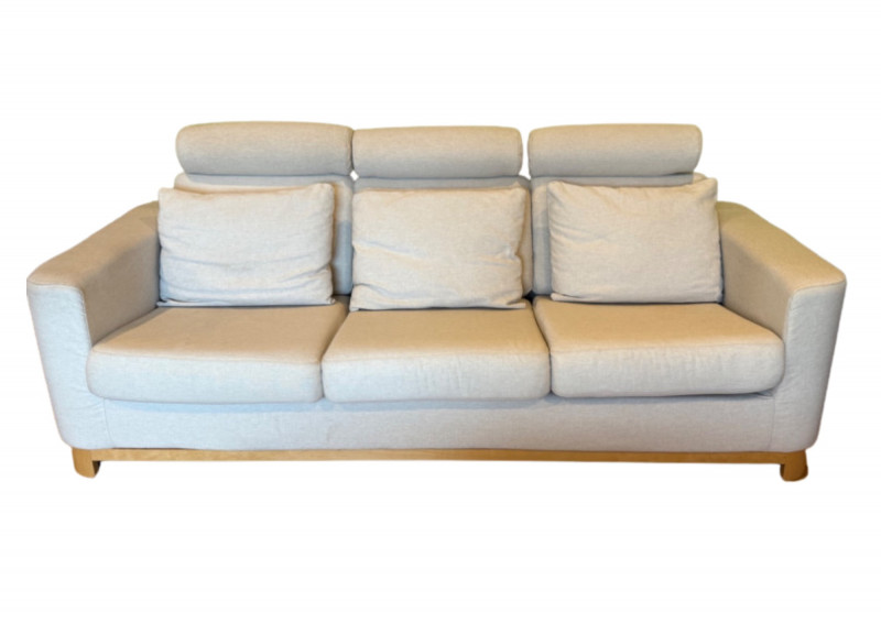 Modern Scandinavian-style 3-seat sofa by IKEA, model Salen, upholstered in a soft light beige woven fabric. The sofa features three adjustable headrests, removable back and seat cushions, and a solid wood base with short block legsin a natural finish. Its clean-lined silhouette and ergonomic comfort make it ideal for contemporary or minimalist interiors. Details: Maker: IKEA Model: Salen 3-Seat Sofa Color: Light Beige (SAGANAS fabric tone) Material: Woven polyester-cotton blend upholstery; solid wood frame and legs Features: Adjustable headrests, removable cushion covers, firm supportive seating Configuration: Three-seat design Why It’s Special: The IKEA Salen series, now discontinued, is sought after for its unique combination of minimalist design and adjustable comfort. Its warm beige fabric and exposed wood base distinguish it from later models like the Uppland or Landskrona, making it a stylish and collectible piece of modern Scandinavian furniture. Handling Note: