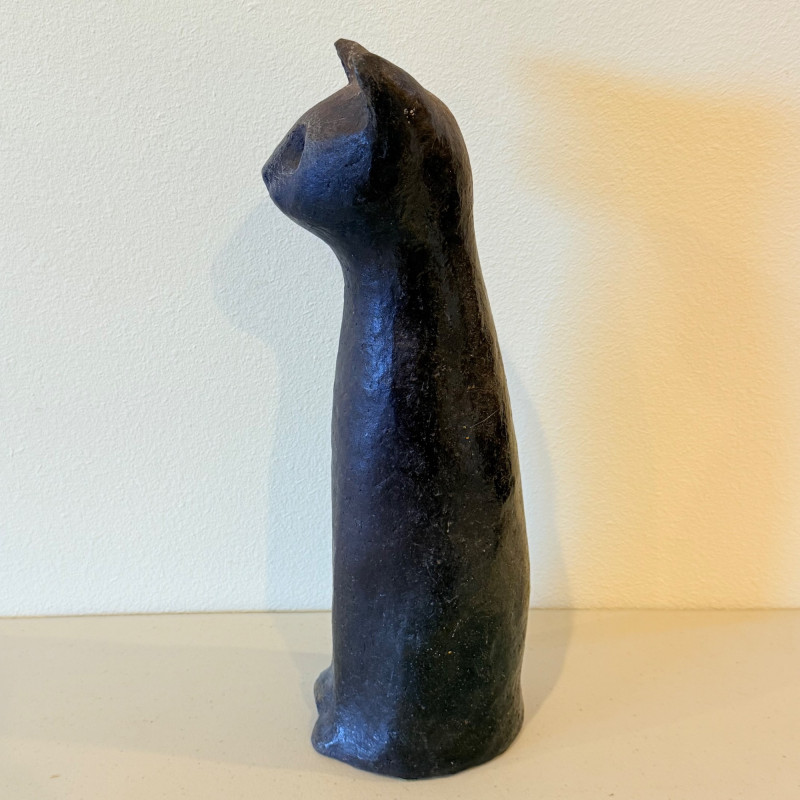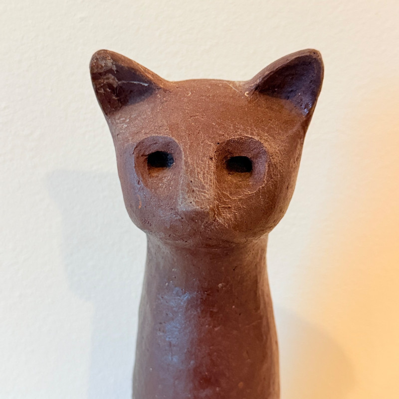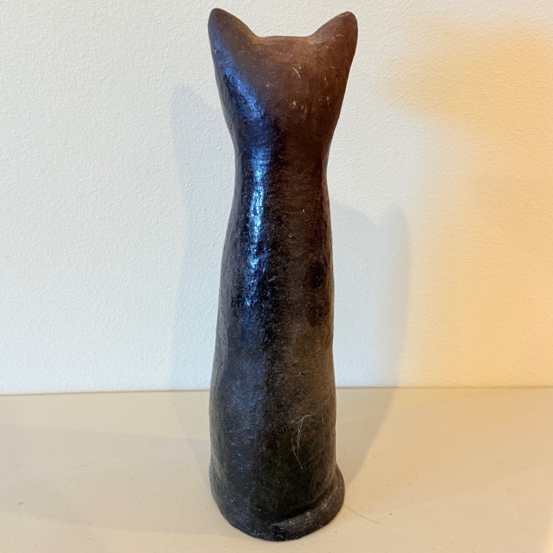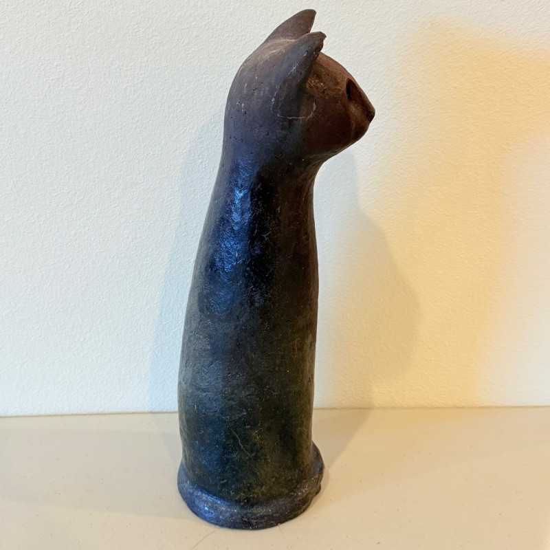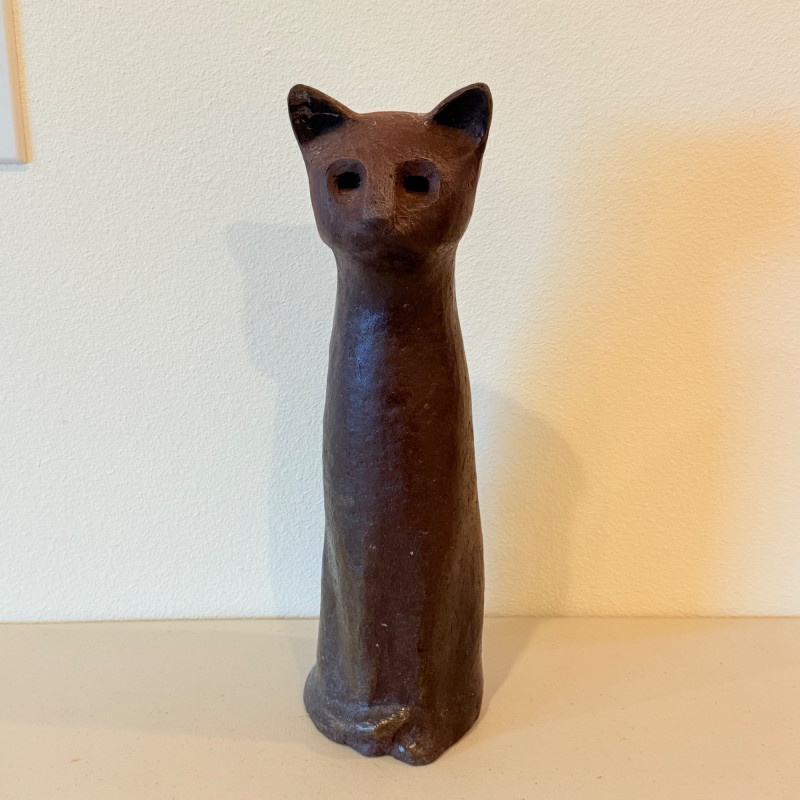 Expressive handcrafted pottery sculpture of a seated cat, signed F. Dulin beneath the base. Attributed to Frank Dulin, an American studio potter celebrated for his sculptural, modernist approach to ceramics. The cat’s tall, elongated form and minimal facial features convey quiet character and balance. Its warm matte brown finish enhances the organic texture of the hand-formed clay, creating a timeless decorative piece. Material: Hand-built stoneware with matte brown finish. Why It’s Special: