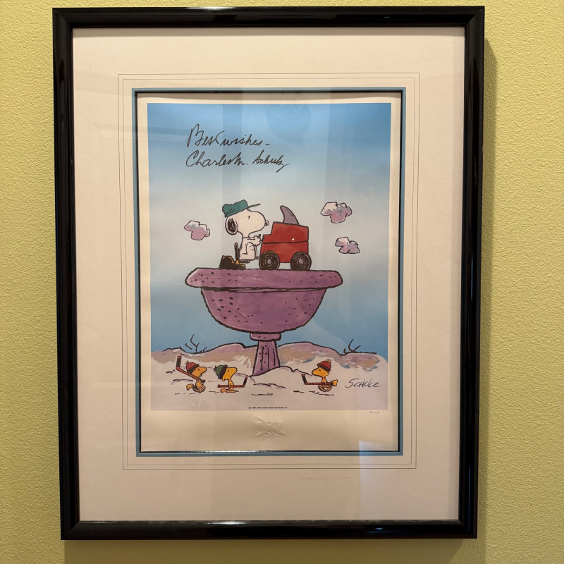 Rare limited-edition Peanuts lithograph personally hand-signed by Charles M. Schulz, featuring Snoopy driving a red Zamboni atop a birdbath while Woodstock and friends play hockey below. This piece was created in celebration of Schulz’s connection to the San Jose Sharks NHL franchise and reflects his well-known love for the sport of hockey. Edition & Authenticity: Hand-signed in marker: “Best Wishes – Charles M. Schulz” Numbered 10/55 (limited edition of only 55) Official San Jose Sharks embossed logo at the lower margin Copyright © 1958, 1965 United Feature Syndicate, Inc. Collecting Note: